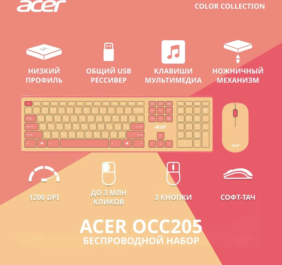 Клавиатура + мышь Acer OCC205 розовый/бежевый (ZL.ACCEE.00F) - описание товара, его характеристики, фото и цены представлены на карточке товара. Чтобы купить этот товар по цене 3560 руб., свяжитесь с нами по телефону 8(812)426-98-99 в Санкт-Петербурге, или оформите покупку через корзину.