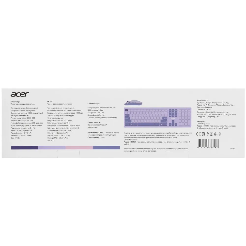 Клавиатура + мышь Acer OCC205 фиолетовый (ZL.ACCEE.00D) - этот товар вы можете купить по цене 3560 руб. в интернет-магазине КотоФото. Характеристики, описание товара, фото и цена представлены на карточке товара. Заказать товар вы можете по телефону 8(812)426-98-99 в Санкт-Петербурге.