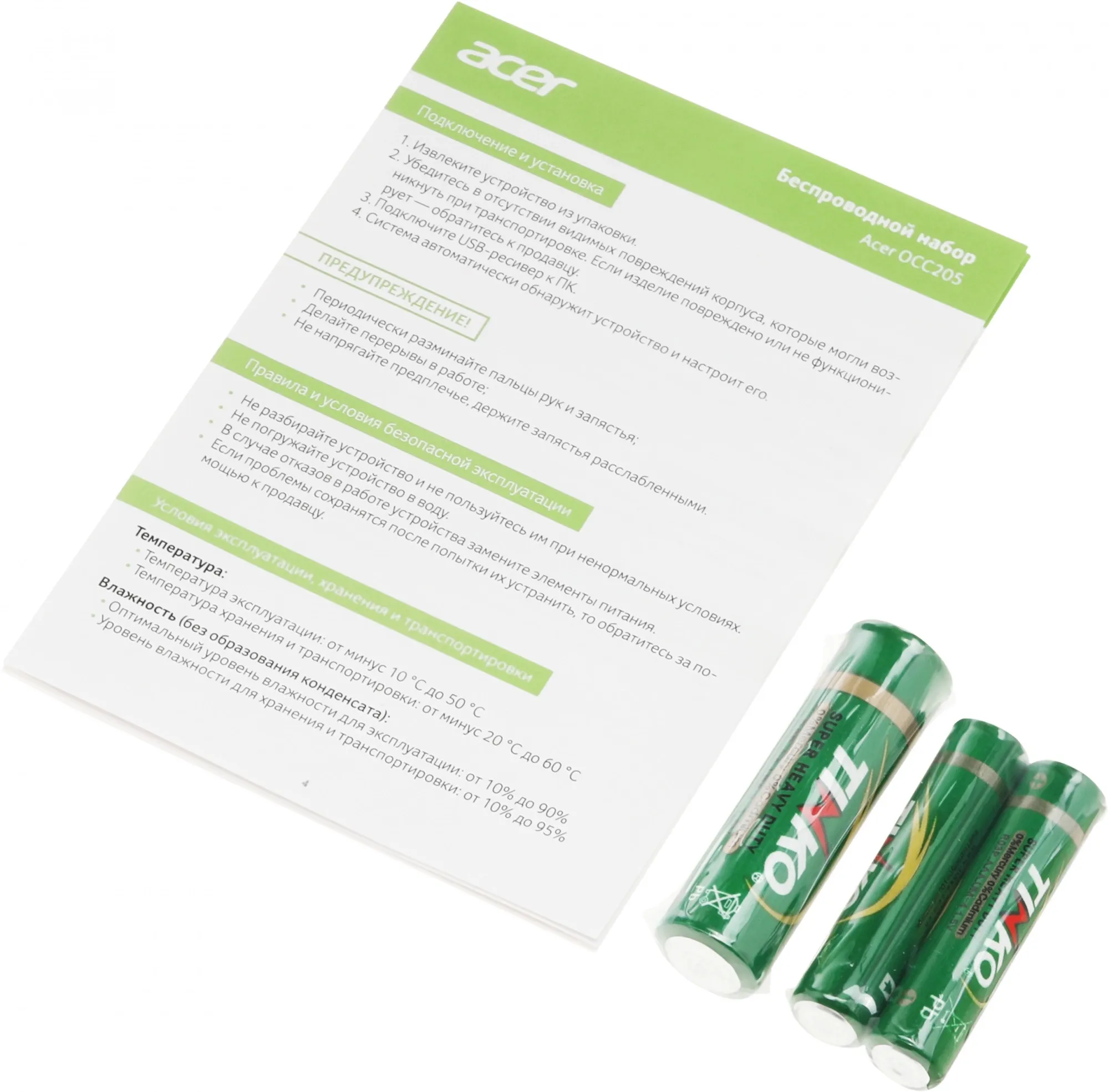 Питание клавиатуры осуществляется с помощью двух батареек типа AAA, что обеспечивает ее длительное время работы без необходимости частой замены элементов питания. Комплектующая мышь работает от одной батарейки типа AA, что также обеспечивает стабильную и продолжительную работу.