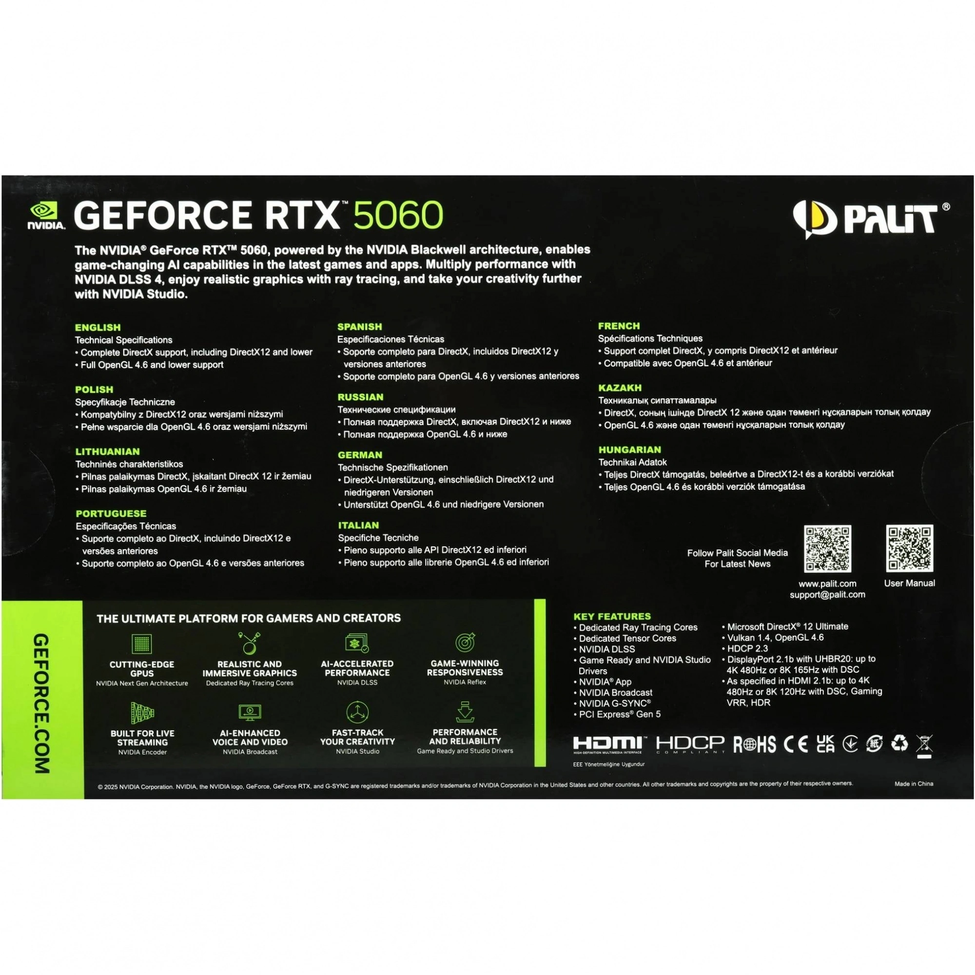 По спецификациям у Palit RTX 5060 Dual OC 3840 CUDA ядер, 8 ГБ GDDR7 и 128 битная шина; память работает на 28 Гбит/с с суммарной пропускной способностью около 448 ГБ/с. Буст частота GPU достигает примерно 2497–2535 МГц, что даёт хороший запас для QHD гейминга и делает карту заметно быстрее решений прошлого поколения в том же классе.Подключения и охлаждение