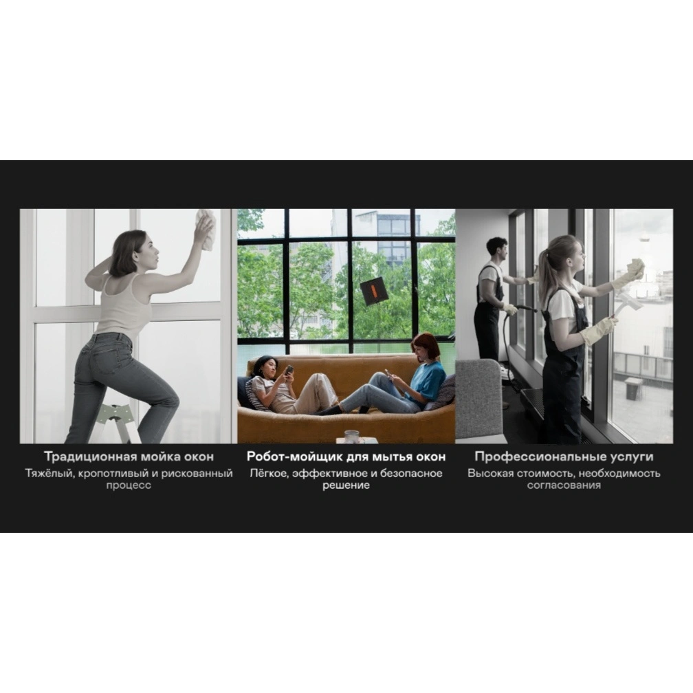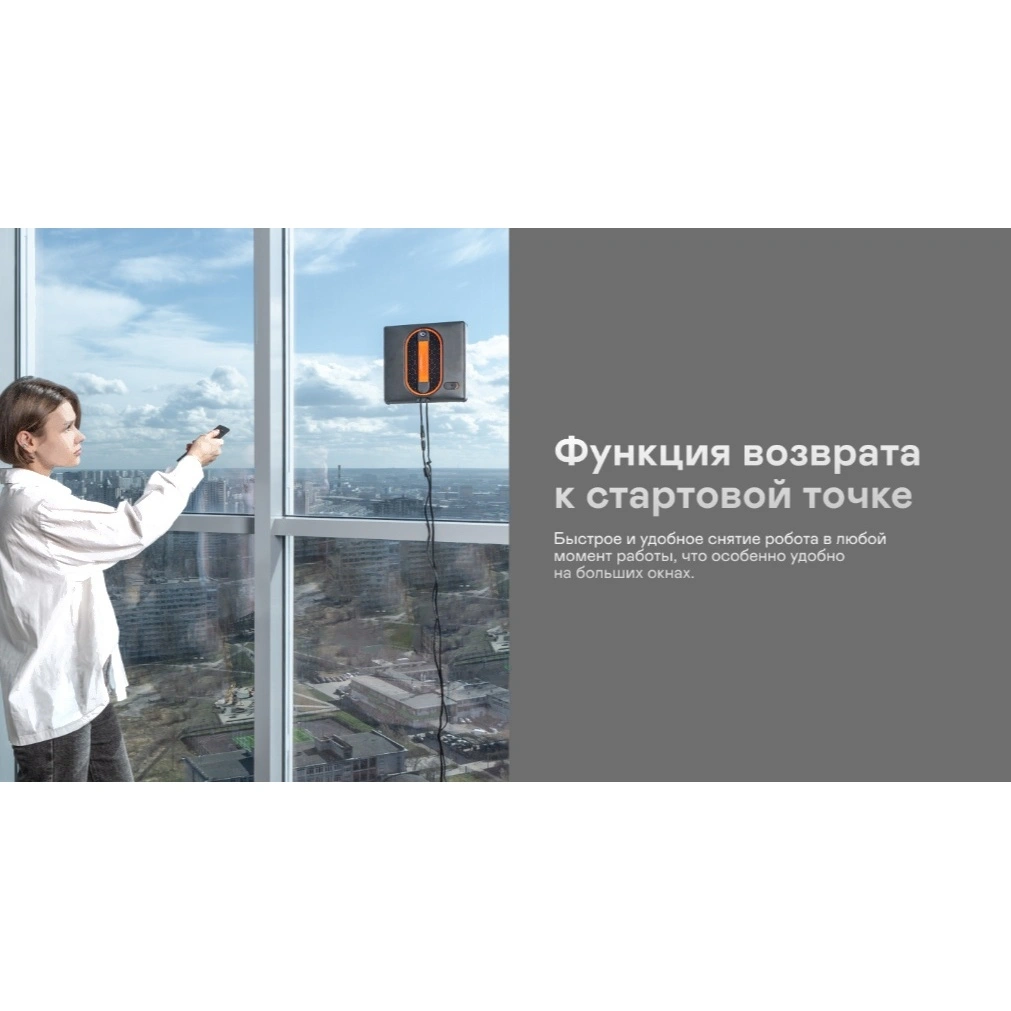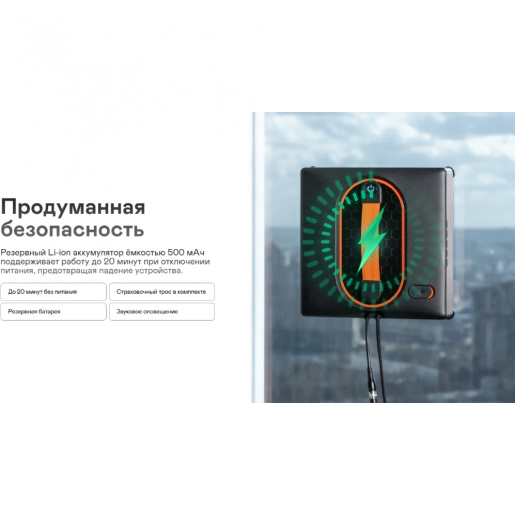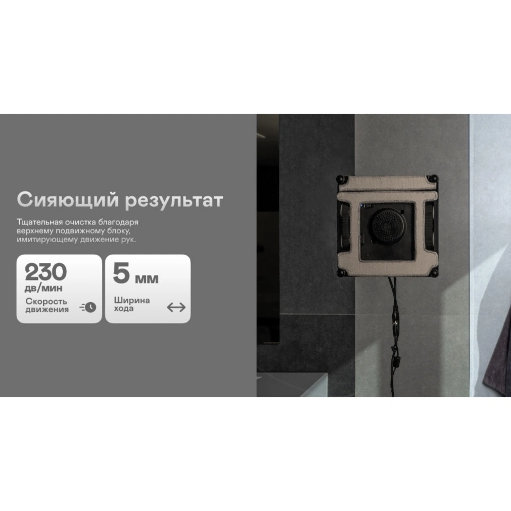 Мощный BLDC-двигатель с разрежением 4200 Па и система автоподачи воды. Имитация ручного мытья, безопасная работа даже на безрамочном остеклении, управление со смартфона, пульта и голосовой помощник.