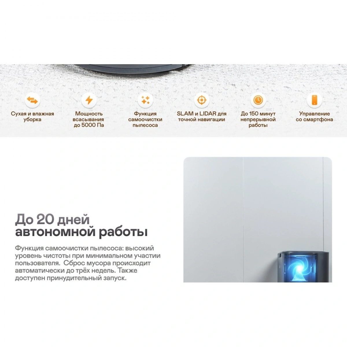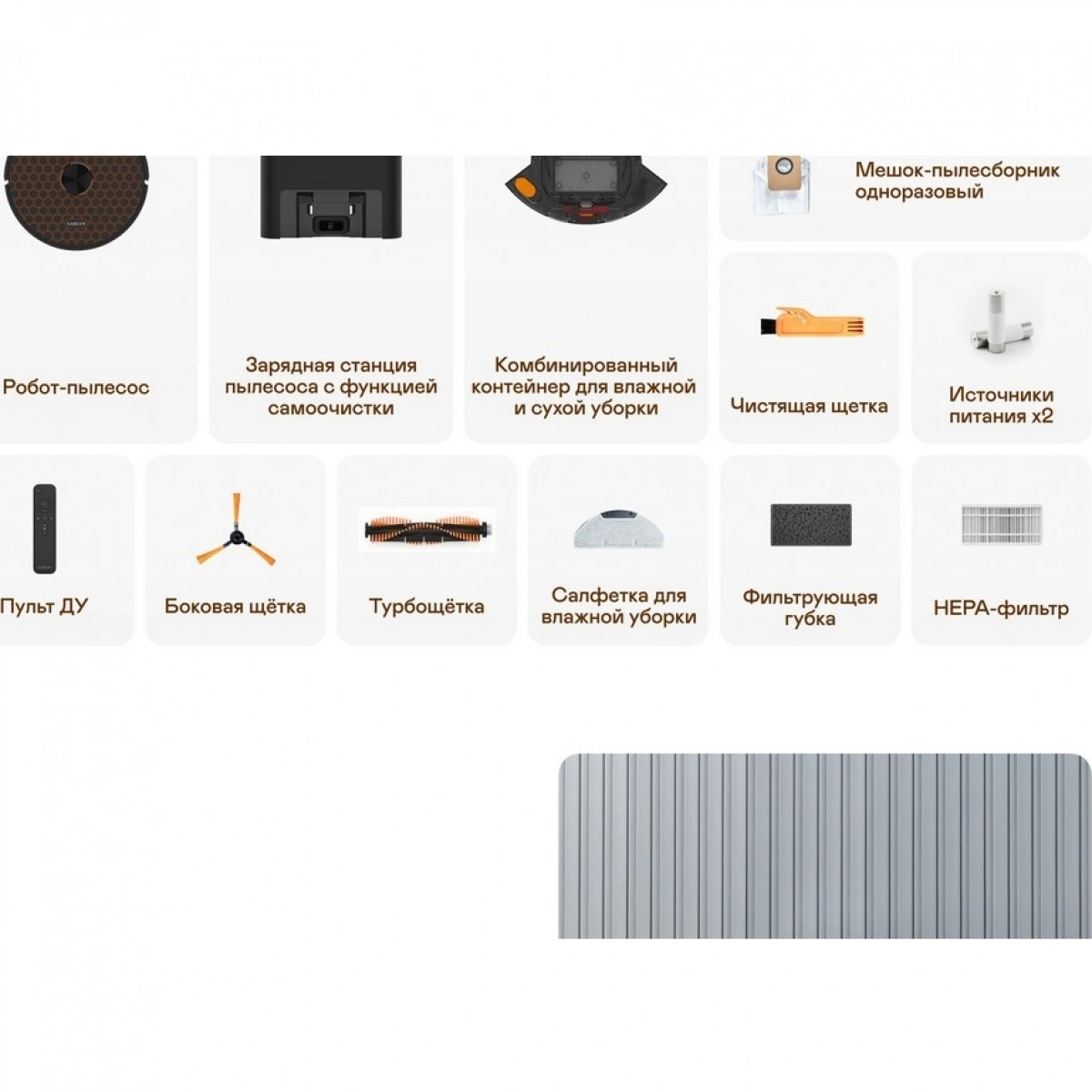 Робот-пылесос, Зарядная станция пылесоса с функцией самоочистки, Источники питания 2 шт, Боковая щётка, Турбощётка, Комбинированный контейнер для влажной и сухой уборки, HEPA-фильтр, Фильтрующая губка, Чистящая щётка, Держатель салфетки для влажной уборки, Салфетка для влажной уборки, Мешок-пылесборник одноразовый, Руководство пользователя, Краткая инструкция пользователя