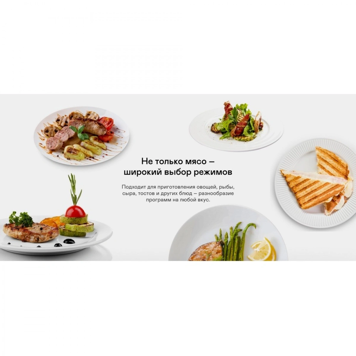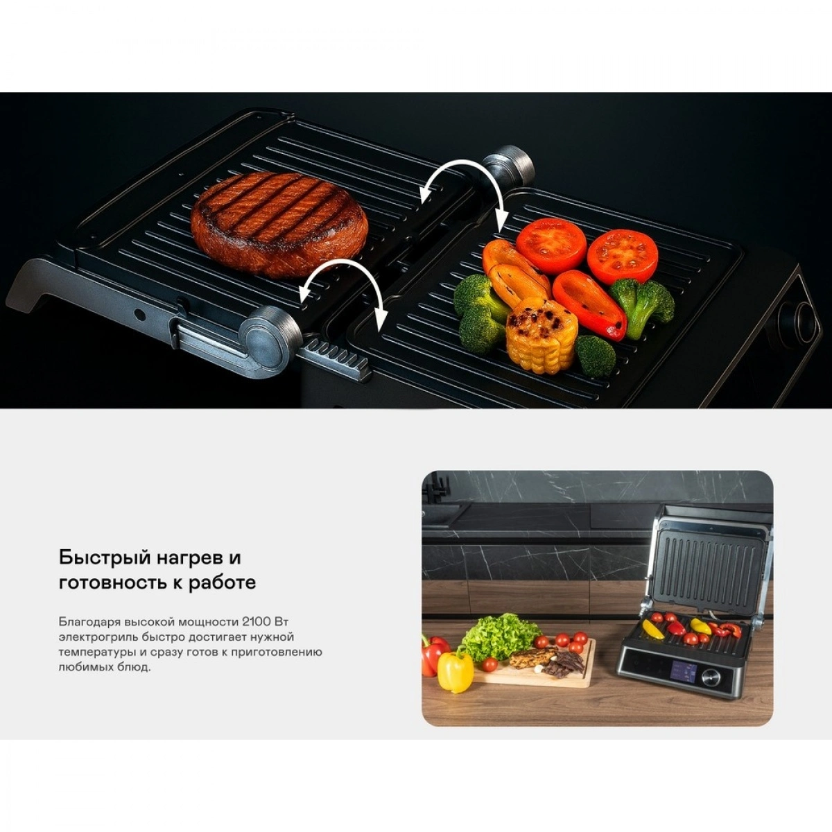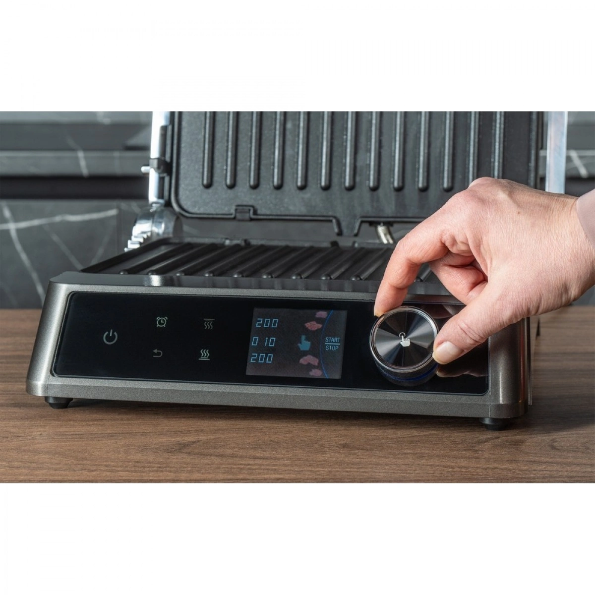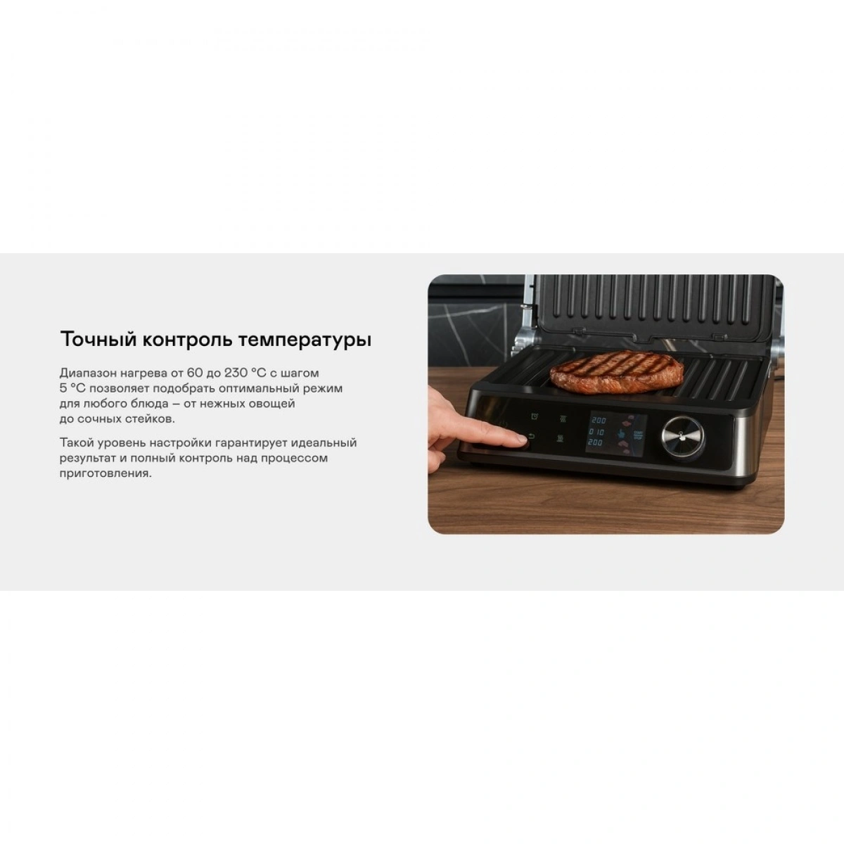 Мощность 2100 Вт, антипригарные съёмные панели из литого алюминия и 18 программ для любых блюд. Регулировка температуры и времени приготовления, датчик толщины продукта и раскрытие на 180° — всё для идеального результата.
