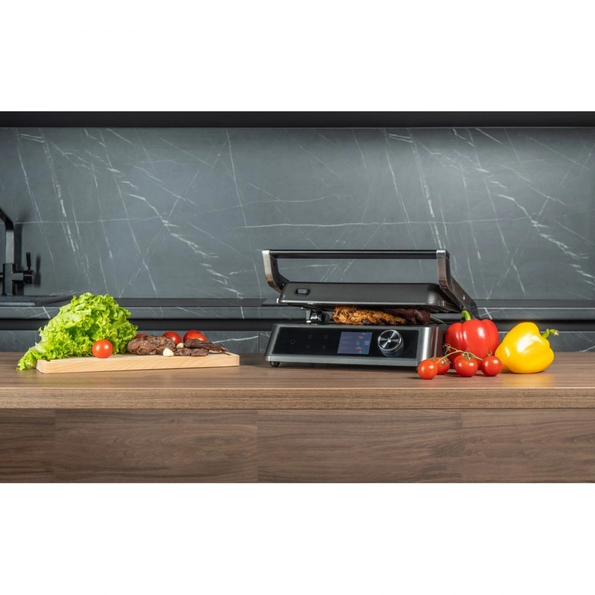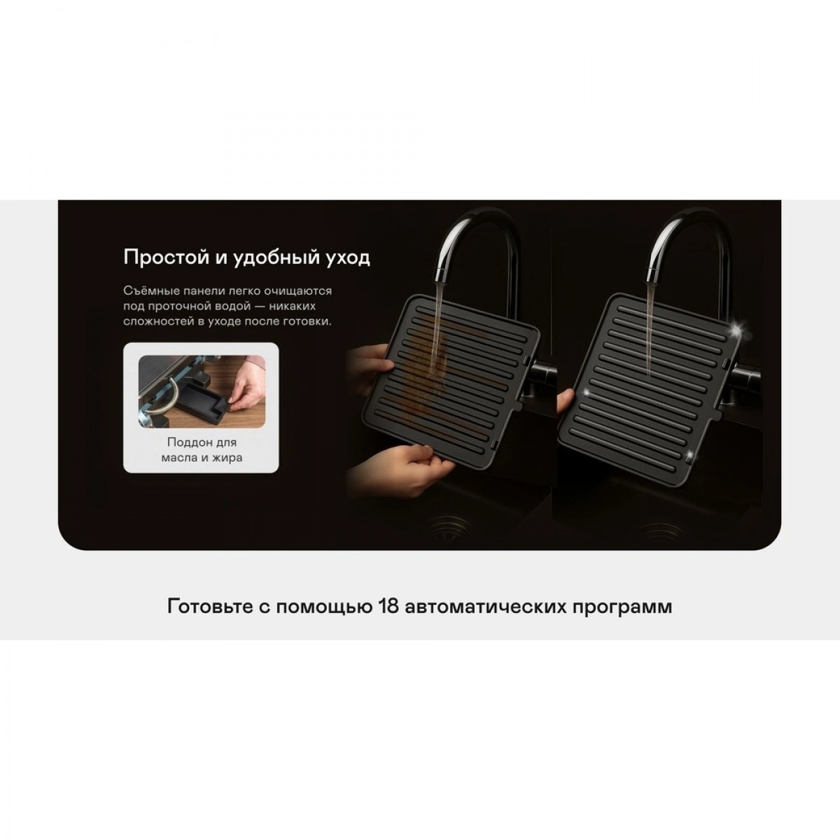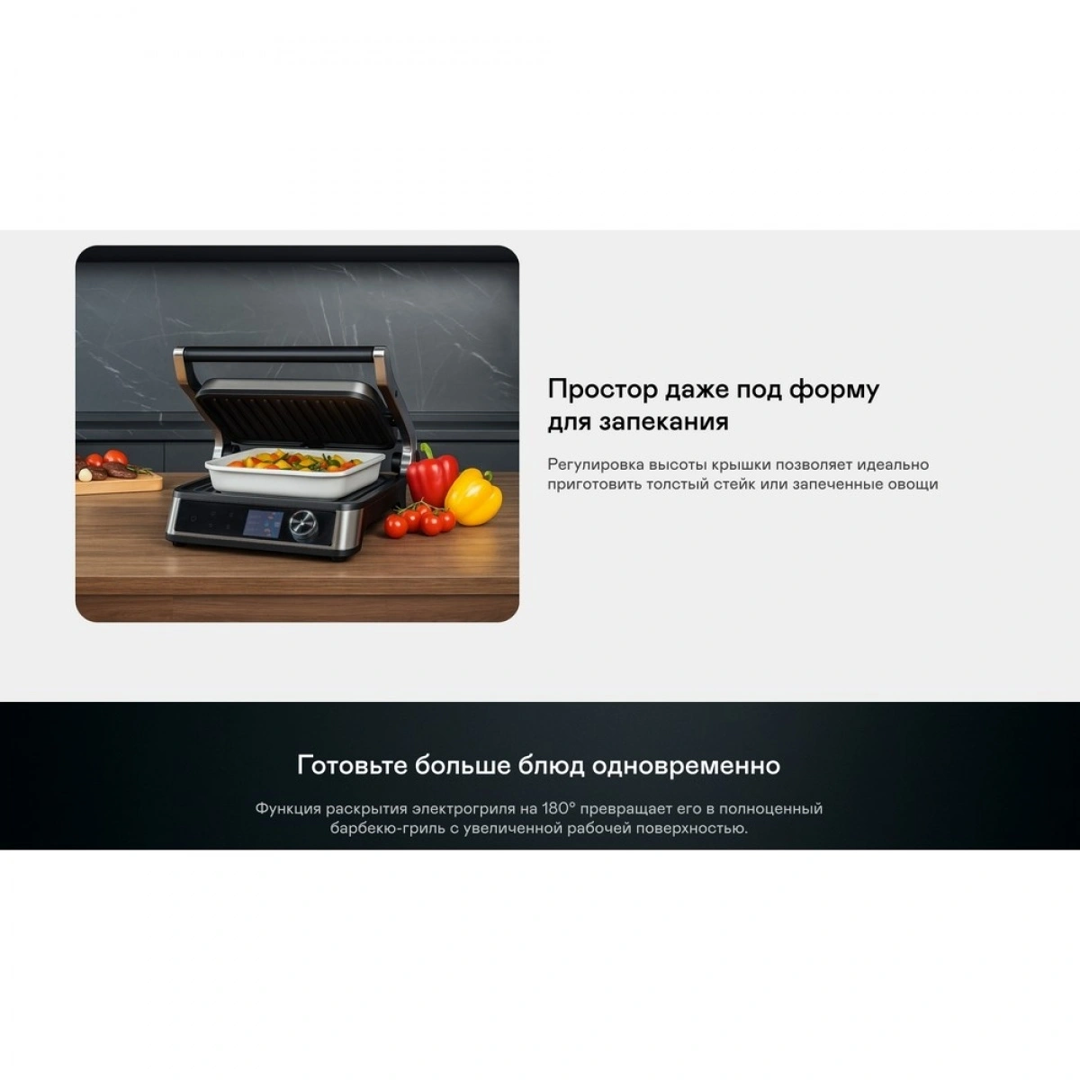 Мощность 2100 Вт, антипригарные съёмные панели из литого алюминия и 18 программ для любых блюд. Регулировка температуры и времени приготовления, датчик толщины продукта и раскрытие на 180° — всё для идеального результата.