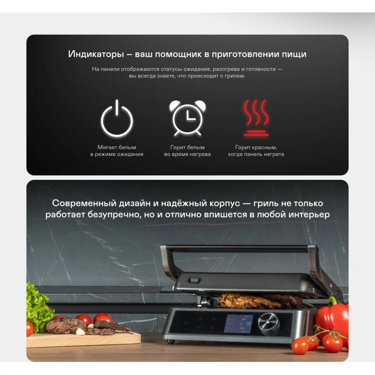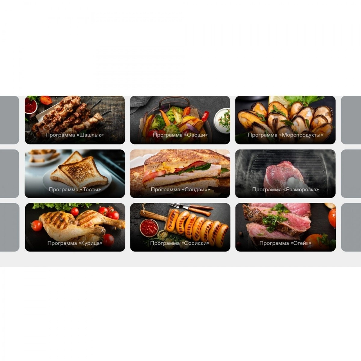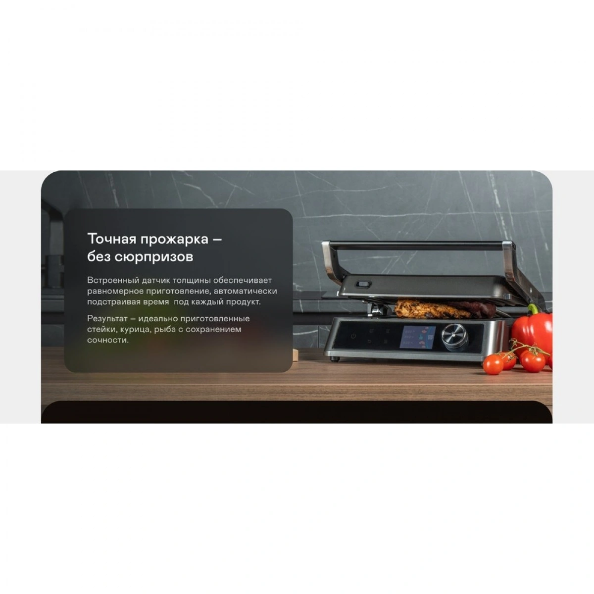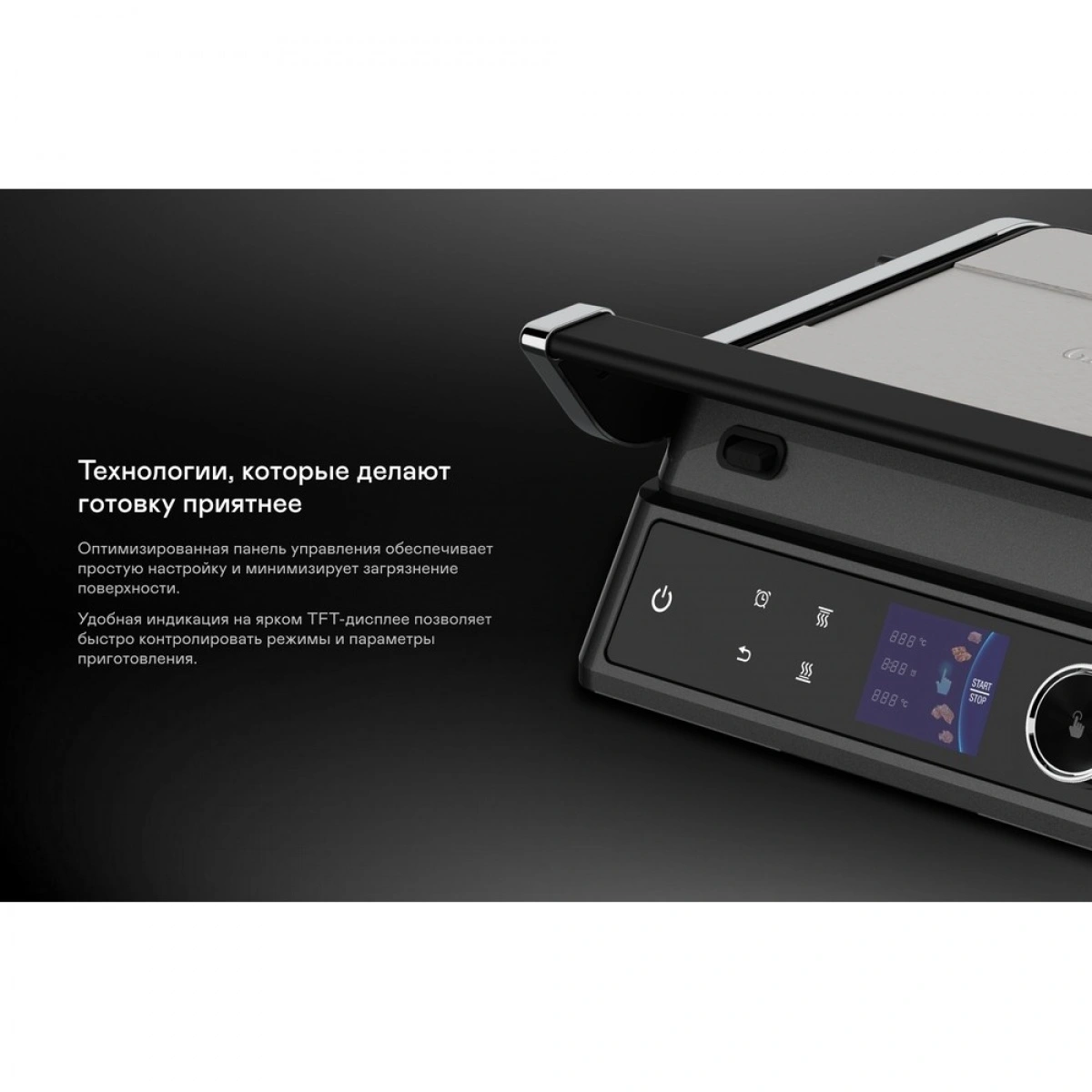 Мощность 2100 Вт, антипригарные съёмные панели из литого алюминия и 18 программ для любых блюд. Регулировка температуры и времени приготовления, датчик толщины продукта и раскрытие на 180° — всё для идеального результата.