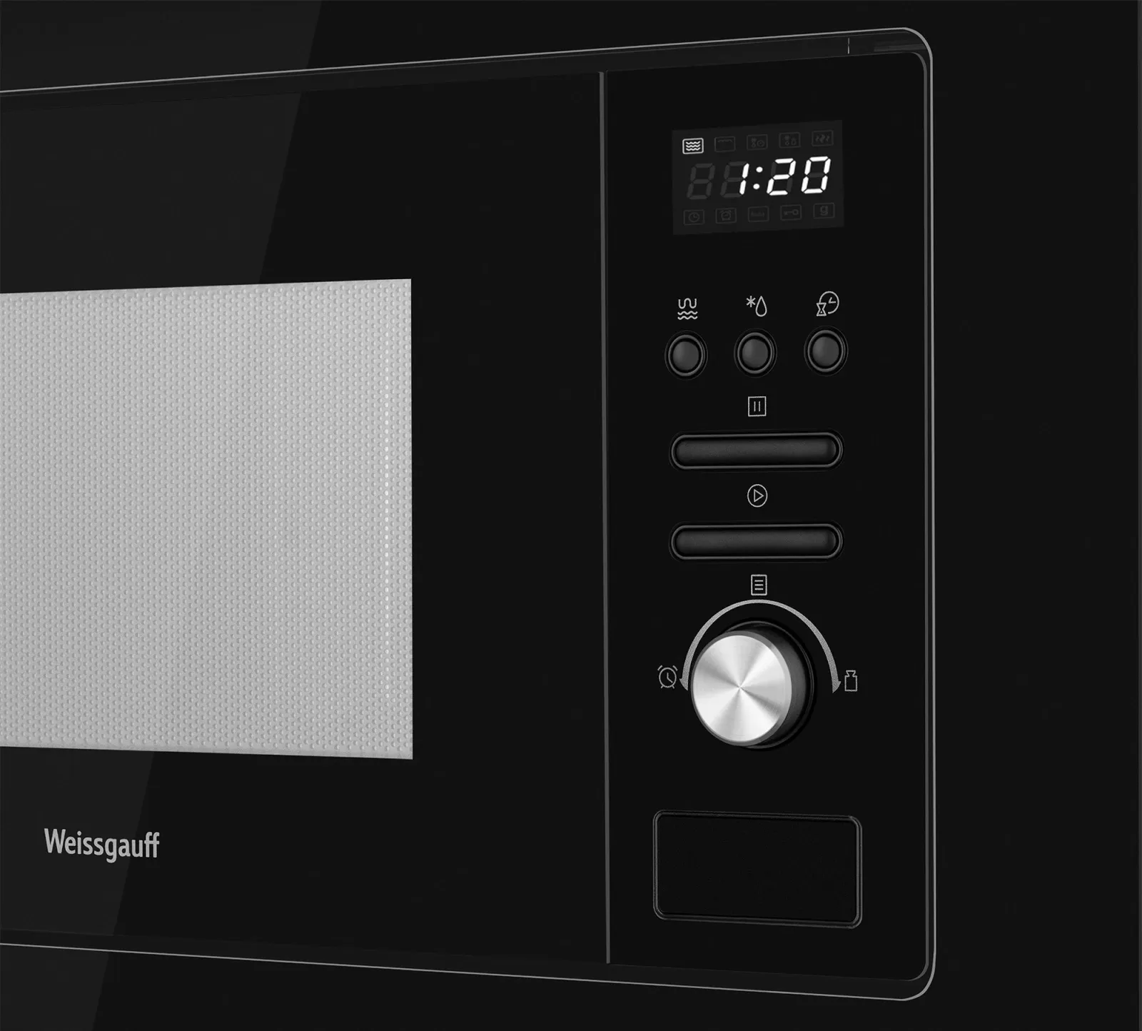 Встраиваемая микроволновая печь Weissgauff с объемом 20 литров, выполненная в черном цвете, оснащённая механическими поворотными рукоятками Soft Switch, равномерно разогревает еду при помощи поворотного стола!