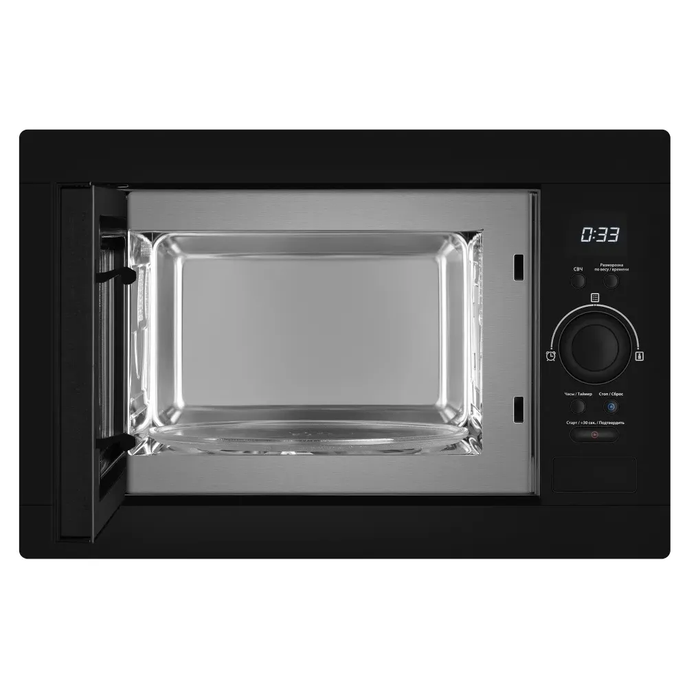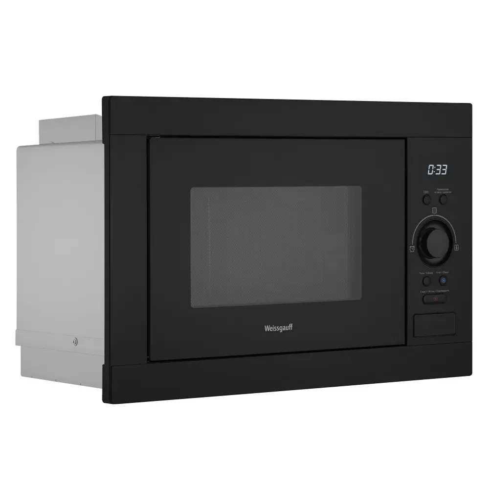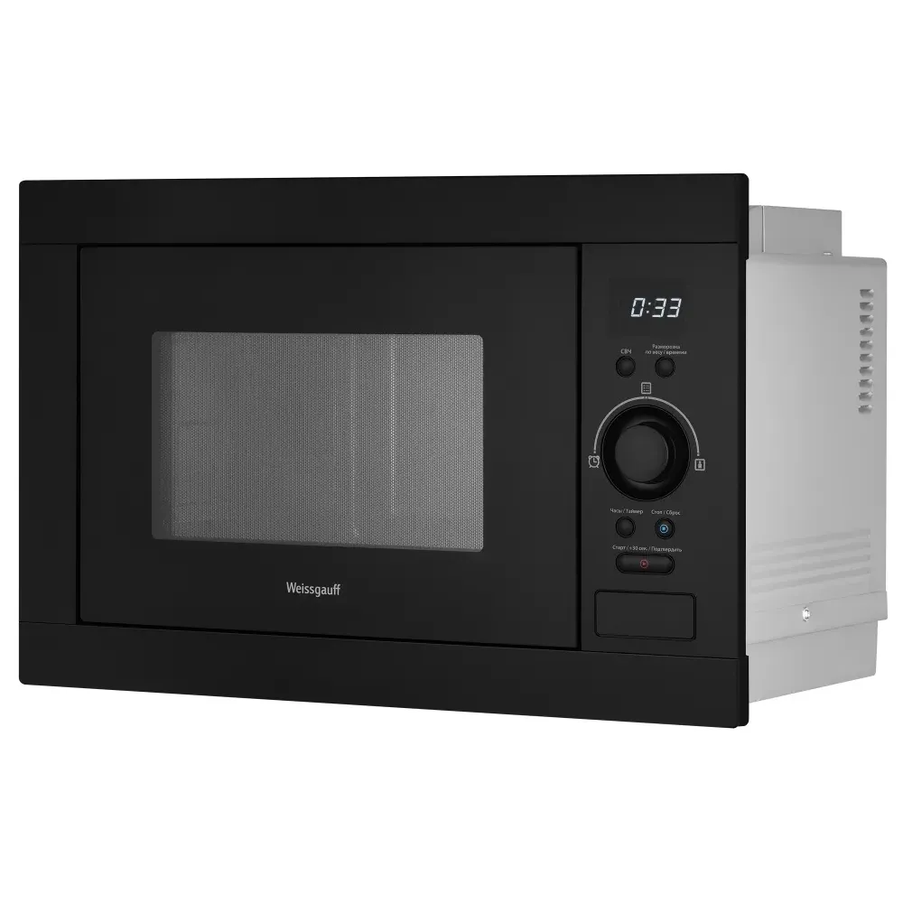 Встраиваемая микроволновая печь Weissgauff с объемом 25 литров, выполненная в черном цвете, равномерно разогревает еду при помощи поворотного стола, а также оснащена набором из 8 программ автоменю.