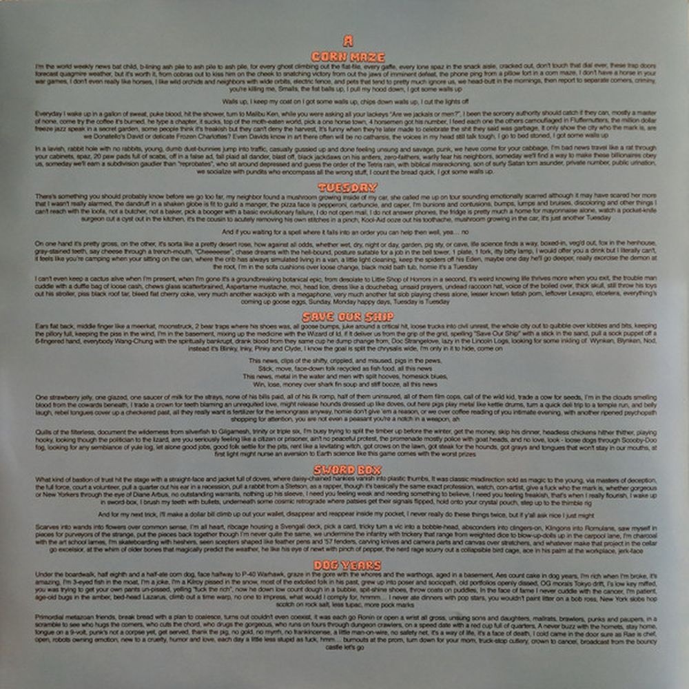 Aesop Rock — один из самых красноречивых MC на современной американской хип-хоп-сцене, известный своей насыщенной и абстрактной игрой слов. Для Malibu Ken он объединился с Tobacco, участником психоэлектронной группы Black Moth Super Rainbow и мастером доцифровых электронных инструментов, таких как аналоговые синтезаторы и магнитофоны. Его экспериментальные, часто дисторшированные биты создают захватывающую атмосферу и идеальную основу для повествования Aesop Rock.