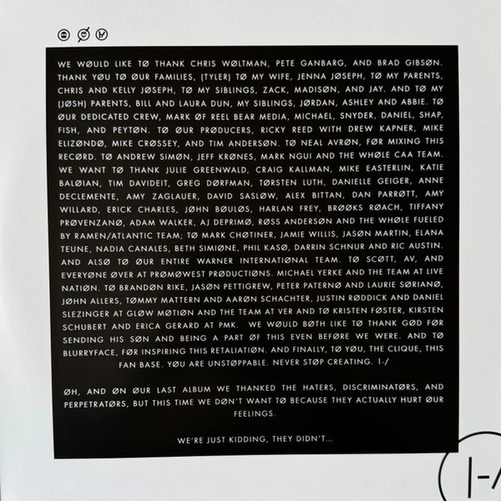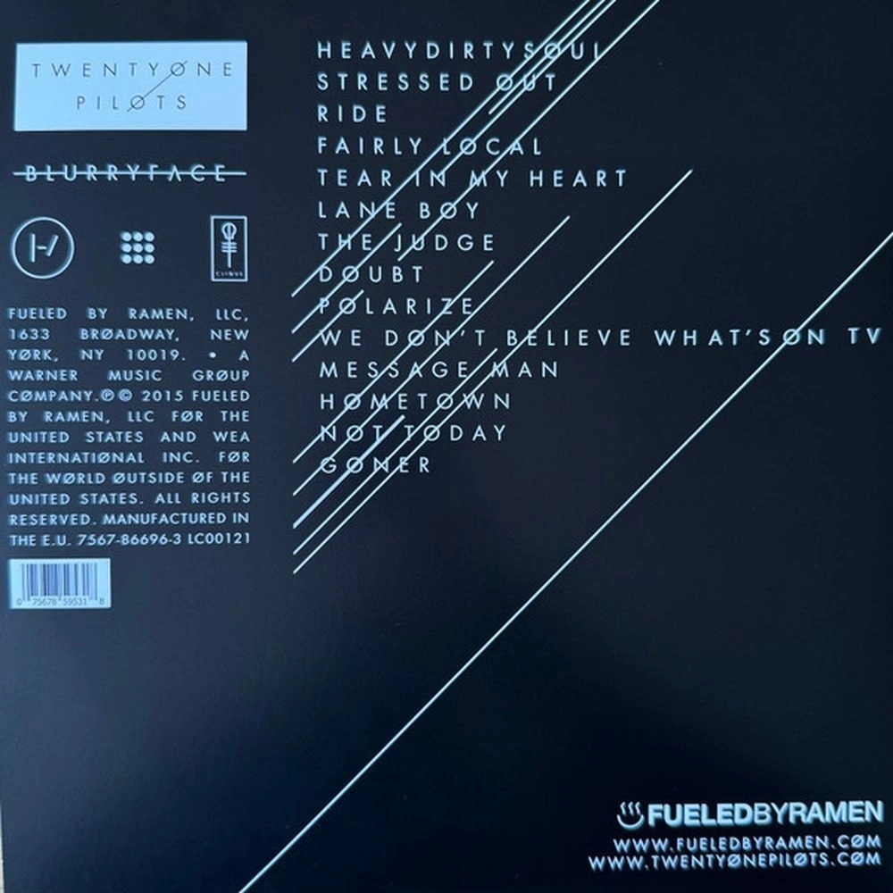 Blurryface — второй официальный студийный альбом группы Twenty One Pilots, выпущенный в 2015 году. Альбом получил платиновый статус в США, Великобритании, Канаде и других странах. Лимитированное издание на цветном виниле. Над Blurryface, последовавшим за их очень успешным дебютным альбомом Vessel, группа работала с известными продюсерами Майком Элизондо, Майком Кросси, Тимом Андерсоном и Рики Ридом, чтобы создать динамичную и разнообразную коллекцию песен. Два сингла с этого альбома, «Stressed Out» и «Ride» попали в пятёрку лучших синглов Billboard Hot 100. В Соединённых Штатах альбом был продан тиражом более 1,5 млн копий по состоянию на апрель 2017 года. В 2017 году за песню «Stressed Out» коллектив получил «Грэмми» в номинации «Лучший поп-дуэт». Альбом был сертифицирован как платиновый в США, Канаде, Польше, Новой Зеландии и Великобритании. В 2018 году Blurryface стал первым альбомом в истории, каждый из 14 треков которого получил золотую сертификацию от Американской ассоциации звукозаписывающих компаний (RIAA).