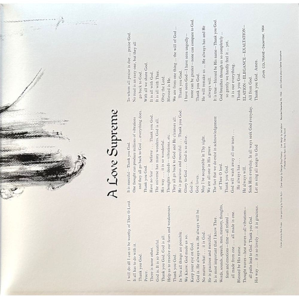 A Love Supreme Джона Колтрейна, несомненно, является одной из самых важных записей, когда-либо сделанных. Это его вершина студийной работы, которая одновременно объединила все его новаторские идеи из прошлого, рассказала о его нынешней глубокой духовности, а также дала возможность заглянуть в следующие два с половиной года. A Love Supreme — это сюита об искуплении, произведение чистого духа и песни, воплощающее все трудности и стремления 1960-х годов. Сразу же после лирического, свингующего Crescent A Love Supreme возвестила о поисках Колтрейном духовной и музыкальной свободы, выраженной через полиритмию, модальности и чисто вертикальные формы, которые казались странными некоторым джазовым пуристам, но пленили более смелых слушателей (и рок-попутчиков, таких как Jimi Hendrix Experience Cream и The Byrds ), одновременно положив начало серии изменчивых, необузданных молитвенных возношений, среди которых Kulu Su Mama, Ascension, Om, Meditations, Expression, Interstellar Space. От настойчивого, похожего на речь, тембра тенора до змеевидных текстур и земного грува барабанов Элвина Джонса сюита Колтрейна развивается с нарастающей интенсивностью, передавая тяжело добытую мудрость и манящую безмятежность в молитвенных гудениях « Псалма », где Джонс раскатывается и грохочет, как гром, в то время как Гаррисон и Тайнер многозначительно поют — и все это время Колтрейн ищет ту единственную кульминационную ноту, достойную любви, которой он хочет поделиться