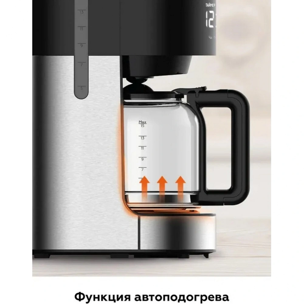 Одним из главных преимуществ является наличие функции автоотключения, которая повышает безопасность и экономит электроэнергию. Для вашего комфорта предусмотрена плита автоподогрева, поддерживающая оптимальную температуру кофе в течение всего утра.
