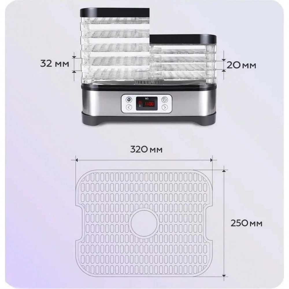 Устройство оснащено пятью пластиковыми поддонами, которые вмещают до 3 кг продуктов, что делает его идеальным для бытовых нужд. Возможность регулировки температуры сушки добавляет удобства в использовании и позволяет адаптировать процесс сушки под индивидуальные предпочтения.
