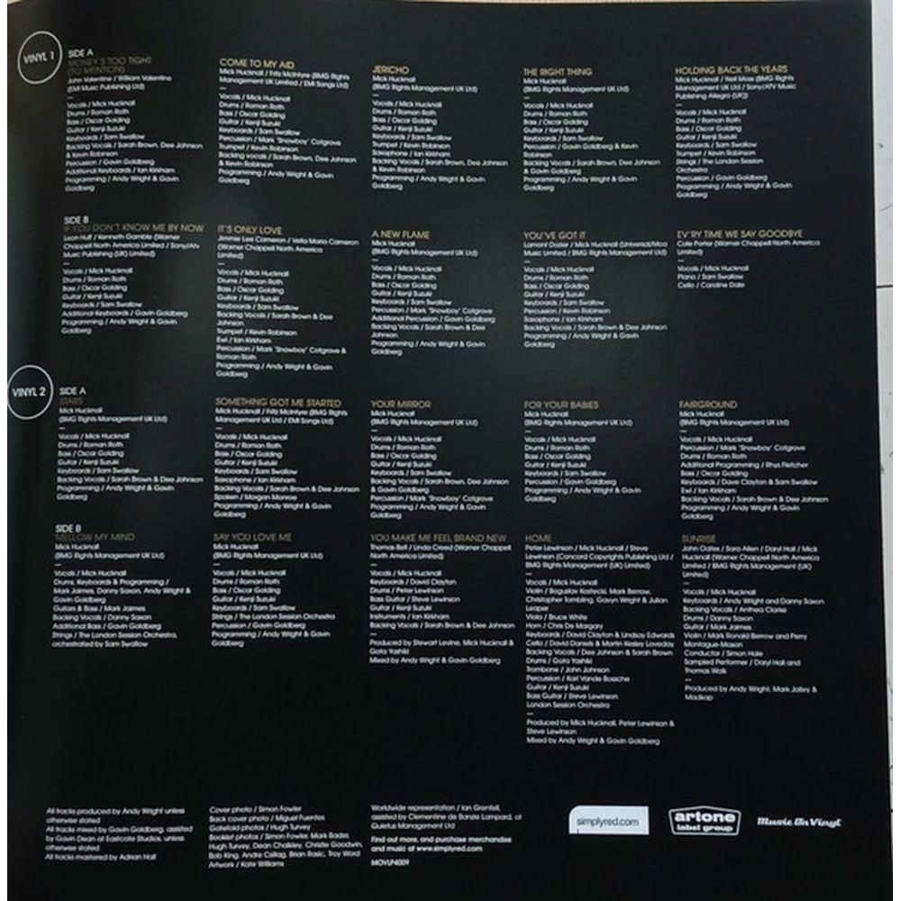 Money's Too Tight (To Mention), Come To My Aid, Jericho, The Right Thing, Holding Back The Years, If You Don’t Know Me By Now, It's Only Love, A New Flame, You've Got It, Ev'ry Time We Say Goodbye, Stars, Something Got Me Started, Your Mirror, For Your Babies, Fairground, Mellow My Mind, Say You Love Me, You Make Me Feel Brand New, Home, Sunrise