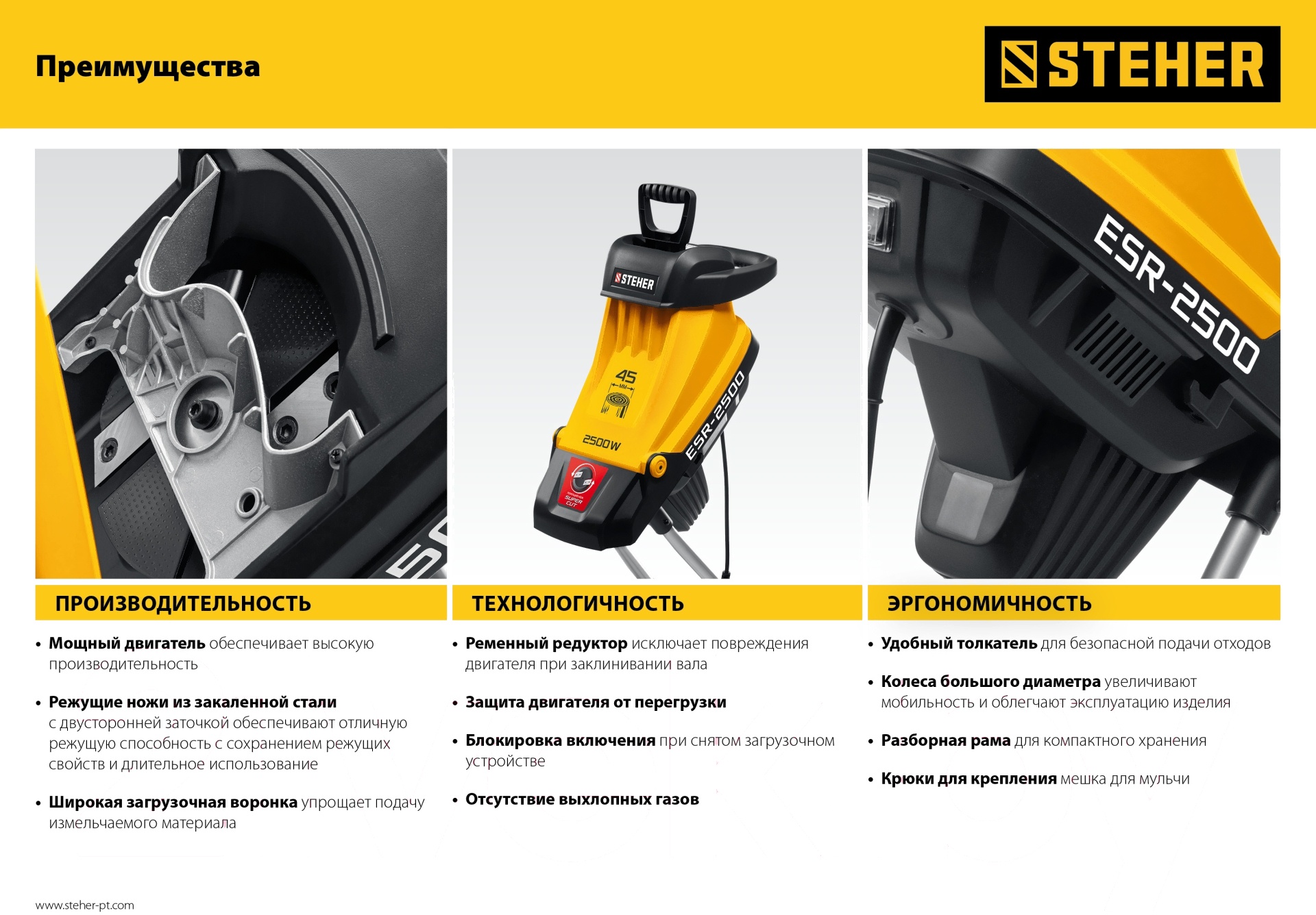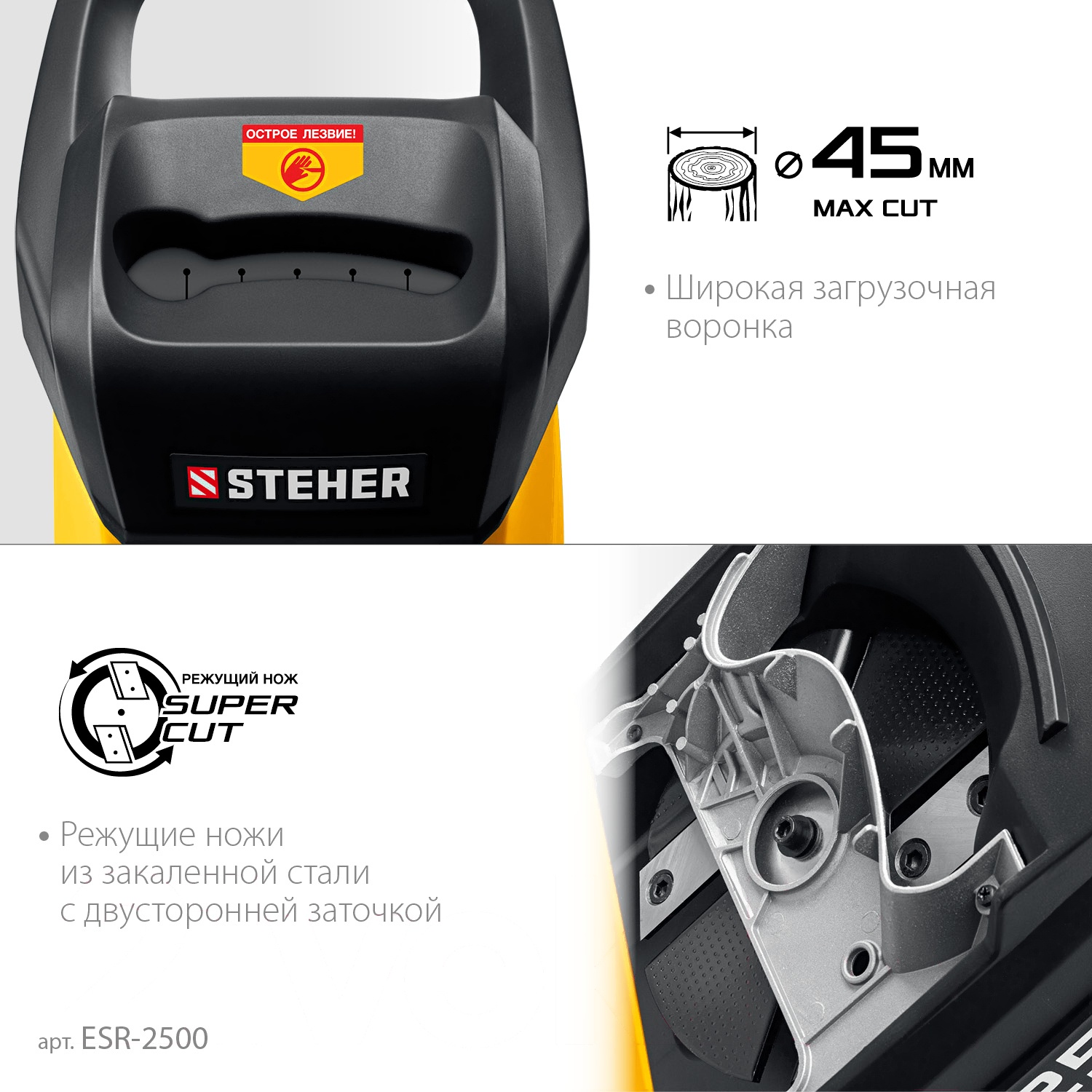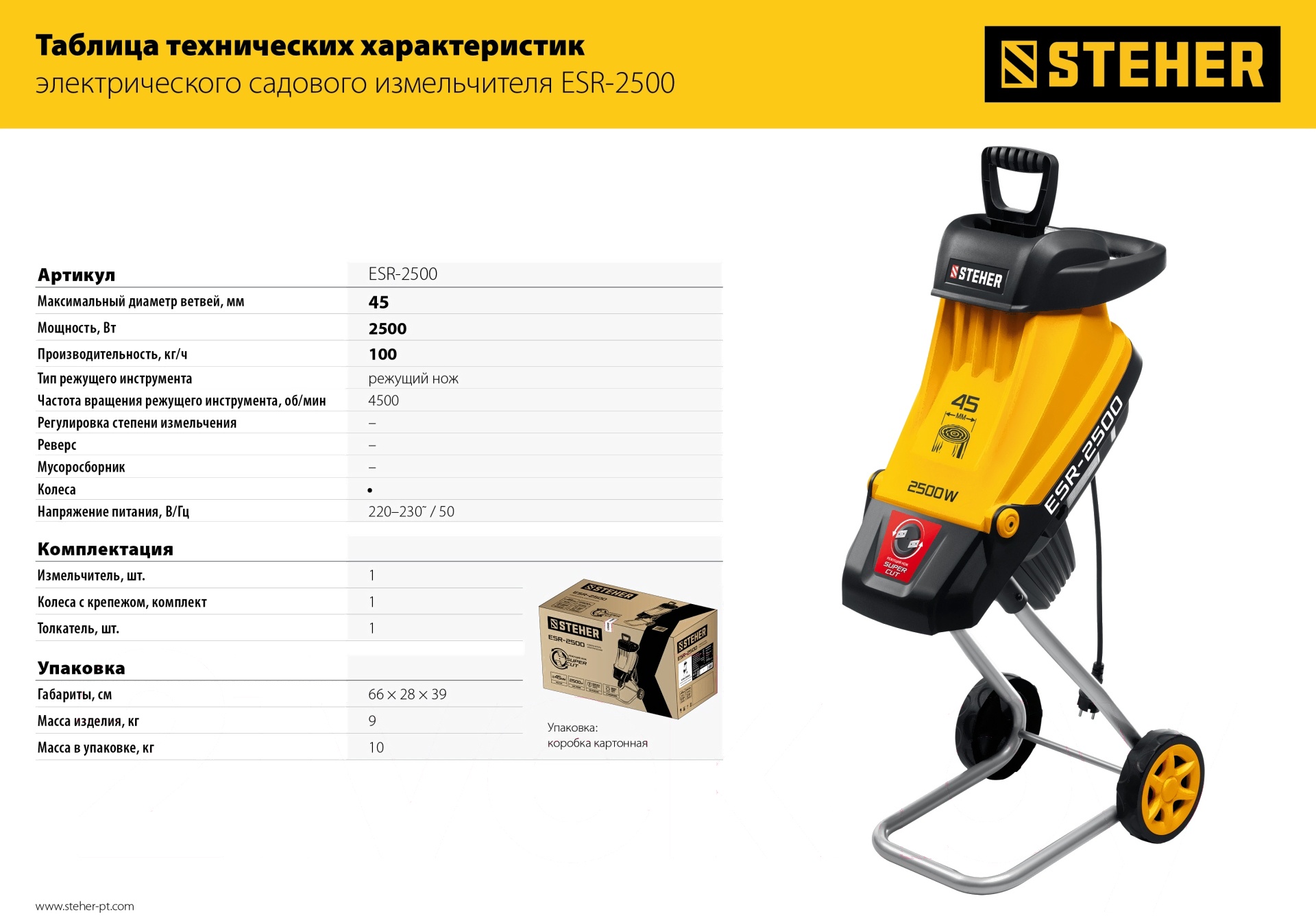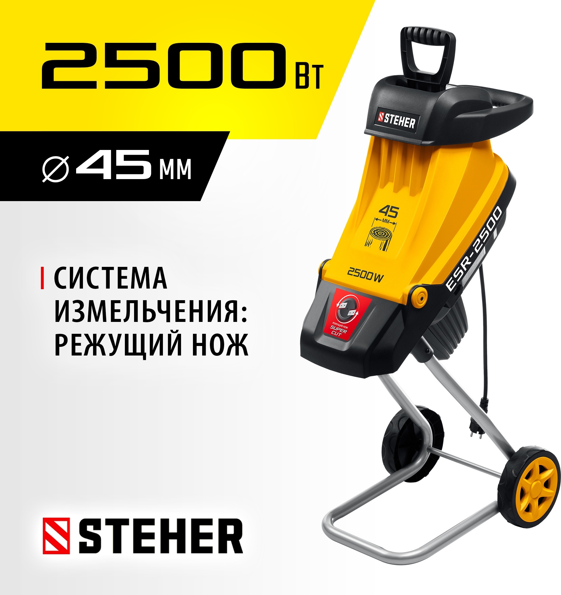 Измельчитель садовый электрический STEHER 2500 Вт, ический (ESR-2500) - стоимость товара 9389 руб. в интернет-магазине КотоФото. Характеристики, фото и описание доступны на карточке товара. Купить товар можно на сайте онлайн или заказать по телефону 8(812)426-98-99 в Санкт-Петербурге, а забрать в пункте самовывоза или оформить доставку на дом.