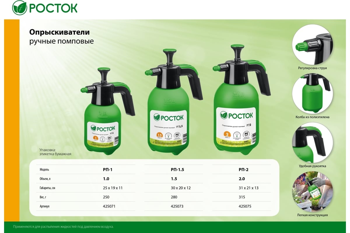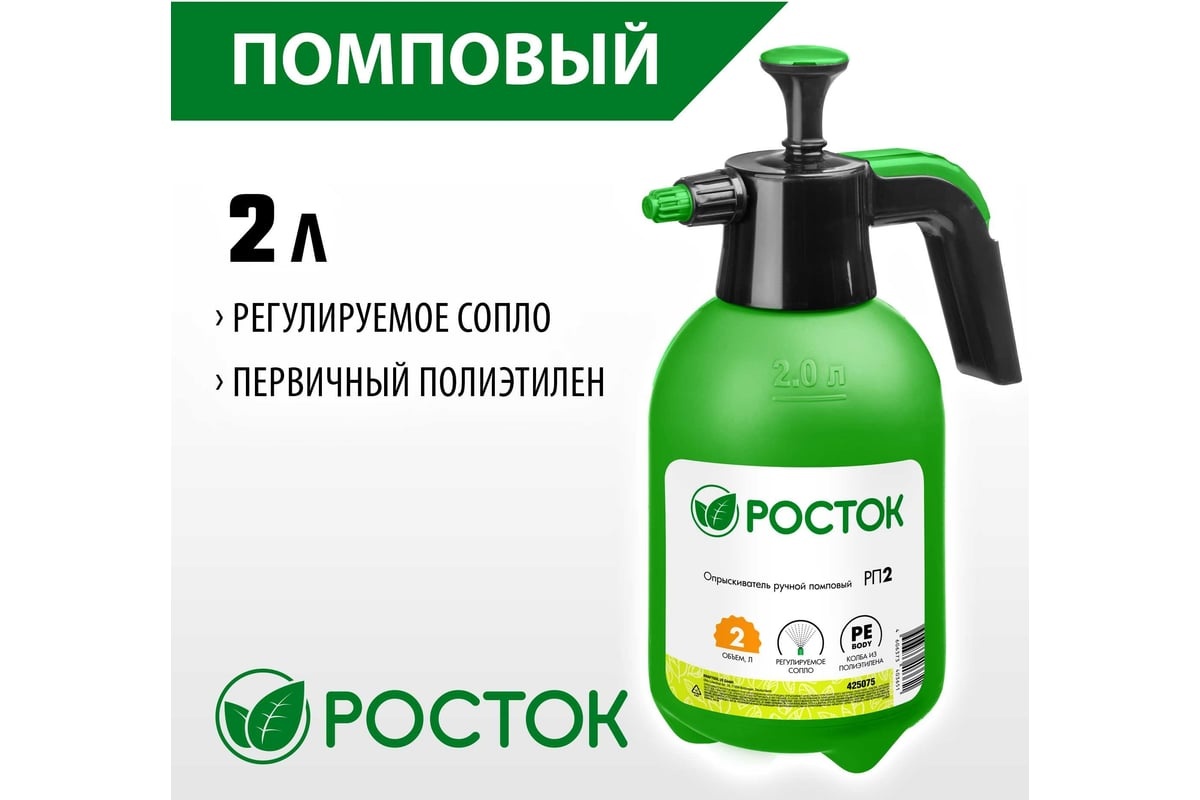 Опрыскиватель помповый РОСТОК РП-2, 2 л, ручной, (425075) - описание товара, его характеристики, фото и цены представлены на карточке товара. Чтобы купить этот товар по цене 431 руб., свяжитесь с нами по телефону 8(812)426-98-99 в Санкт-Петербурге, или оформите покупку через корзину.