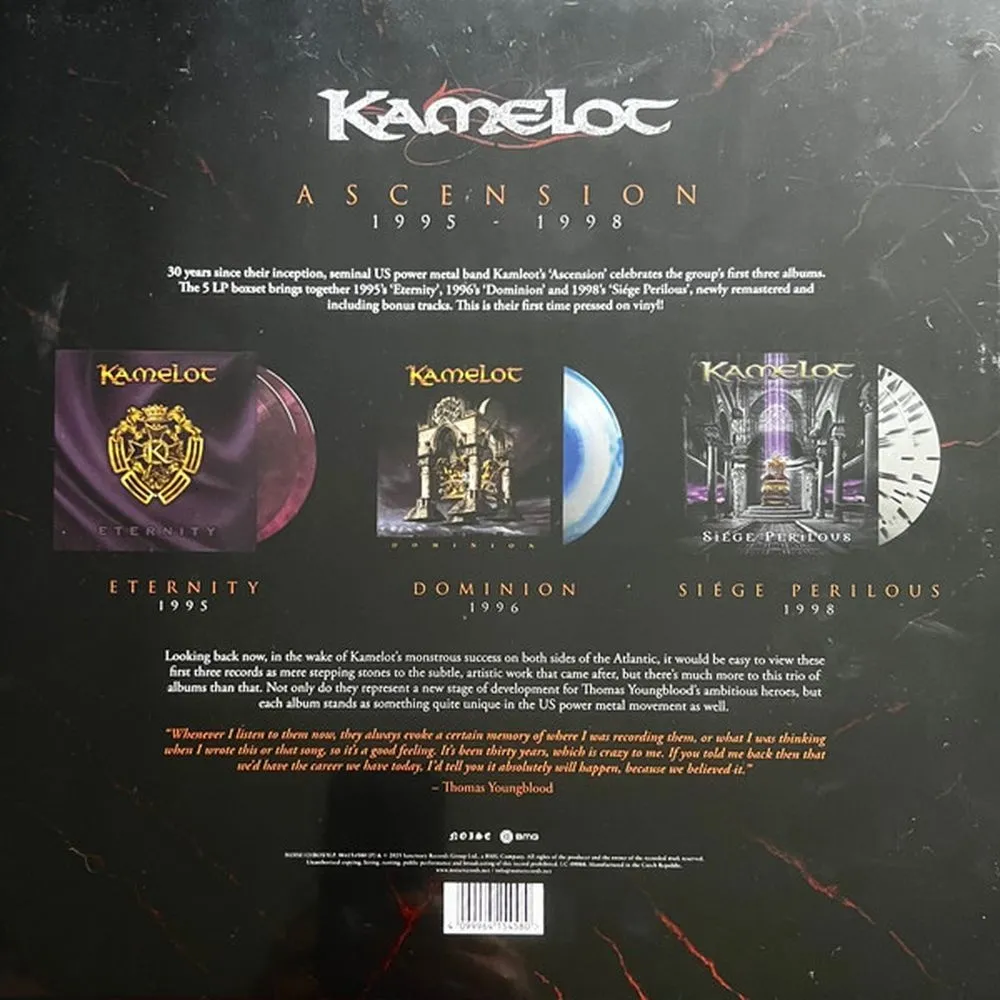 5LP — лимитированный тираж винила разных цветов класса люкс с полноцветным 20-страничным буклетом и постером. Американская пауэр-метал группа Kamelot в этом году отметит 30-летие своего дебютного альбома « Eternity », выпустив подарочный бокс-сет из трёх CD и пяти виниловых пластинок, который включает в себя первые три полноформатных альбома группы: « Eternity », « Dominion » и « Si?ge Perilous ». Альбомы были переизданы с новым ремастерингом, а также ранее не издававшимися дополнительными демо-треками « Look Through These King's Eyes », « Millennium » и « Eternal Flame ». Все три альбома не переиздавались уже два десятилетия, и это их первый виниловый релиз.