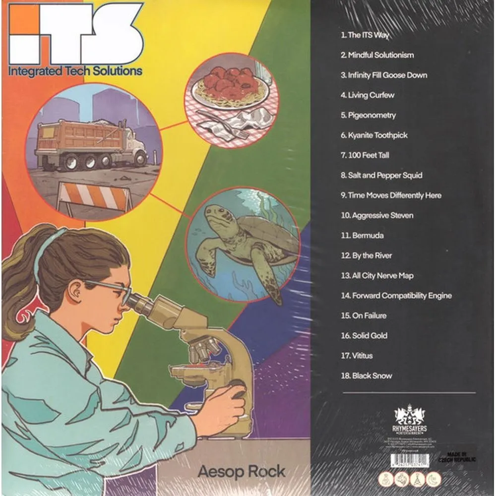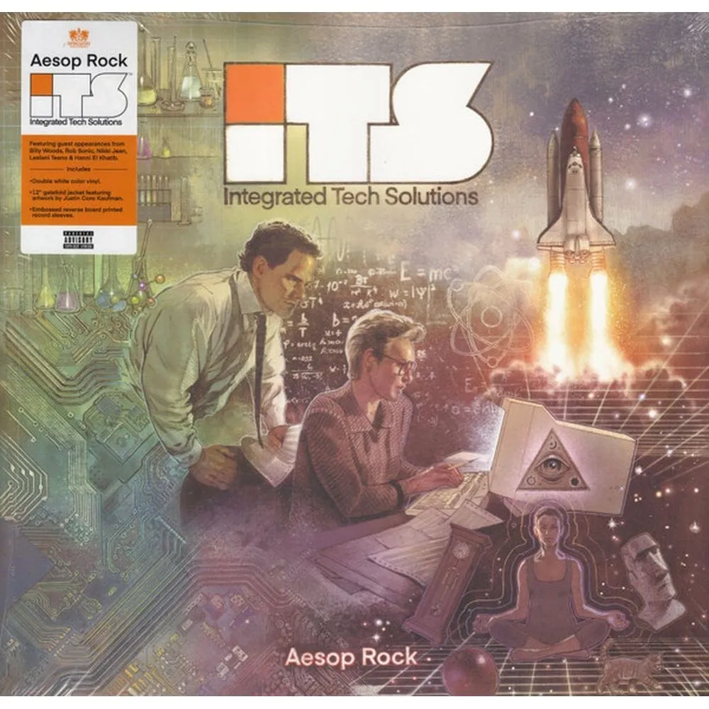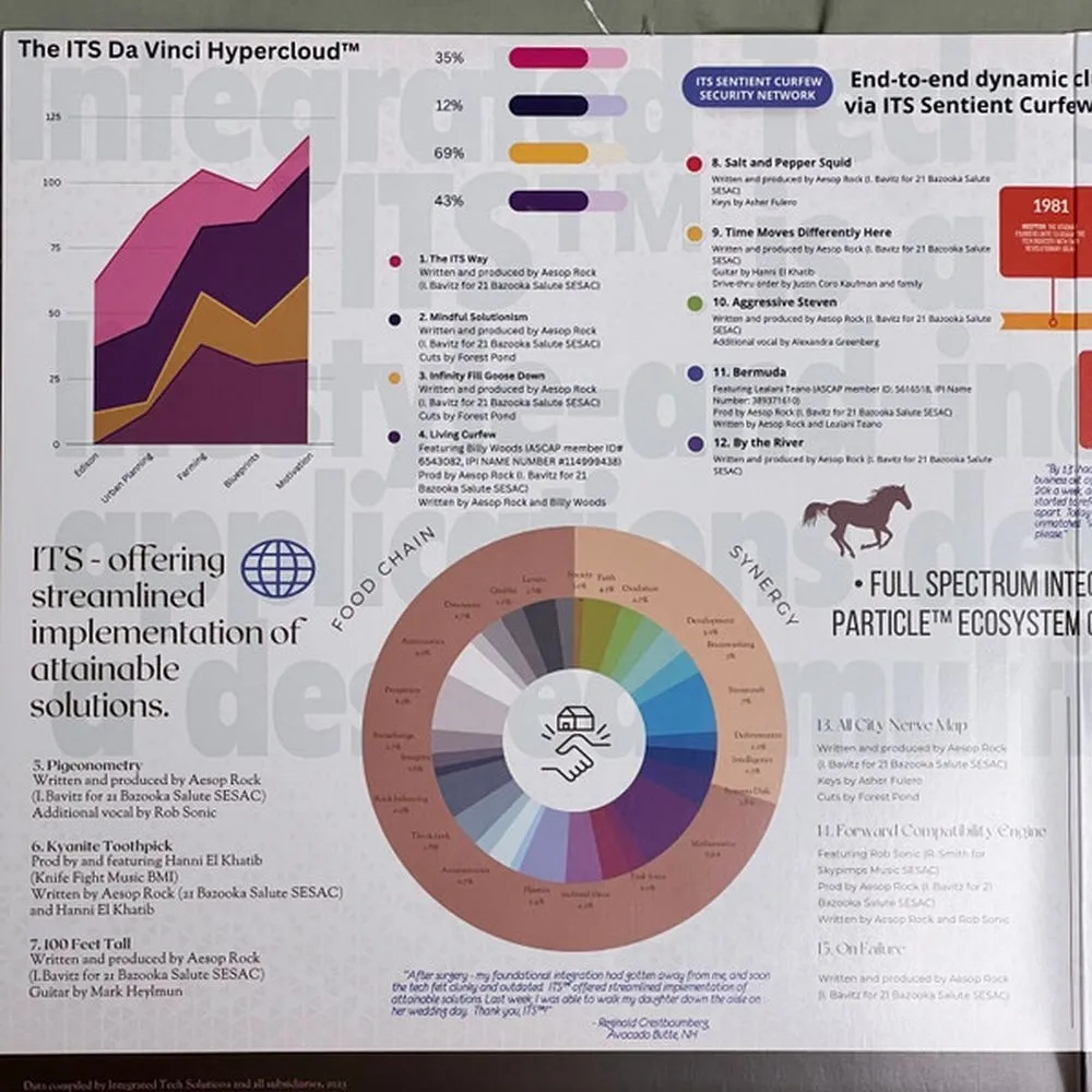 Восьмой студийный альбом Aesop Rock Integrated Tech Solutions представляет собой сатирический взгляд на технологическую зависимость и цифровую эпоху, упакованный в фирменный лабиринт сложных рифм и неожиданных образов. Концептуально альбом обыгрывает эстетику корпоративных презентаций, где каждая песня звучит как "решение" для современного хаоса — от "Mindful Solutionism" до "Aggressive Steven". Музыкально это один из самых доступных альбомов Aesop Rock, но без потери глубины: "100 Feet Tall" сочетает качающийся бит с лирикой о преодолении страхов, а "By the River" (при участии Nikki Jean) добавляет неожиданную лиричность. Особенно выделяется "Salt" — трек, построенный на семпле морской волны, где Aesop размышляет о творчестве как о постоянном движении. Integrated Tech Solutions — это ироничный, но проницательный комментарий о мире, где технологии стали новой религией, а человечность — опциональной функцией.