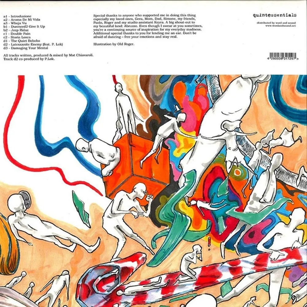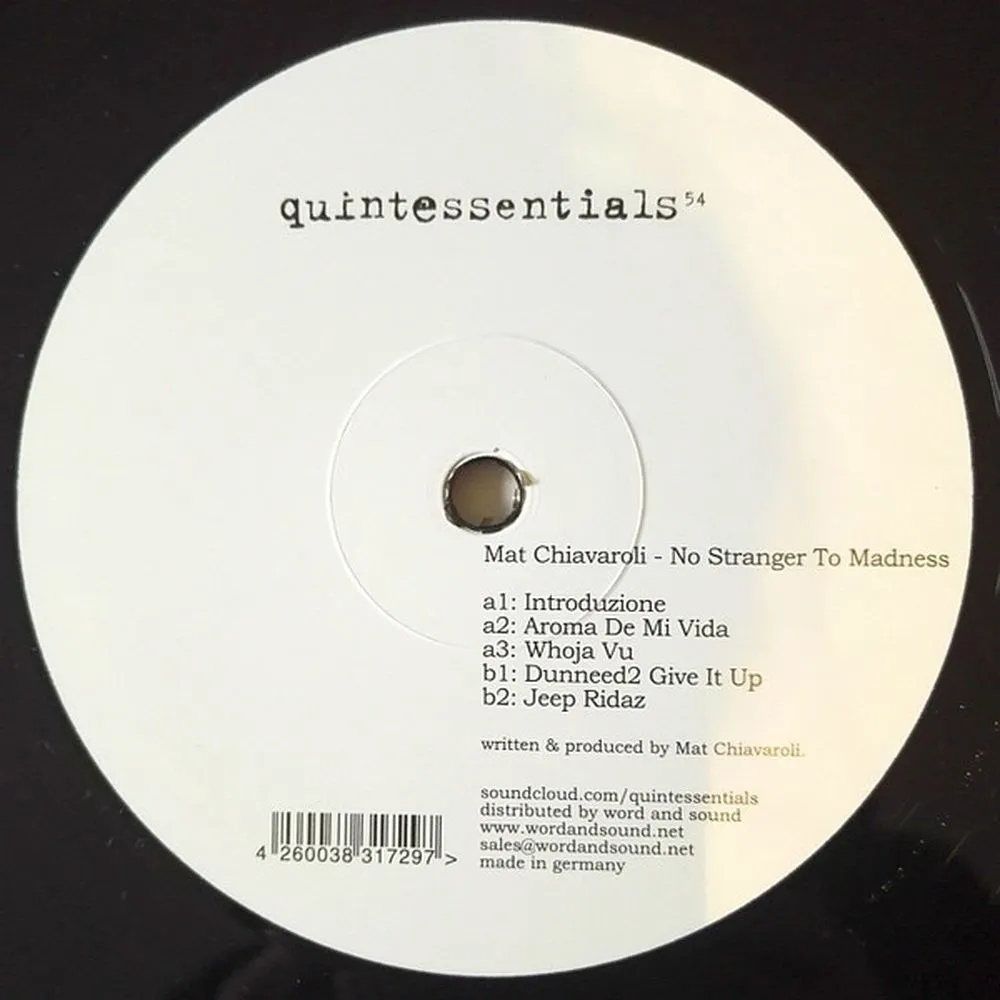 После ряда захватывающих треков, выпущенных на известном лейбле Quintessentials, выходит первый полноформатный альбом Мэта Чиавароли «No Stranger To Madness». Теплый шум ленты Fostex и ритмы MPC — парень из холмов Пескары представляет 10 треков, которые доставят удовольствие как танцам, так и прослушиванию. Треки на сторонах A и B пропитаны пыльными фанковыми сэмплами, жесткими аккордами и синкопированными ритмами. В «Aroma De Mi Vida» Мэт нарезает малоизвестные риффы Rhodes, накладывая на них другие элементы, как и в «Whoja Vu», мощном диско-треке с большим количеством сэмплов, очень похожем на его предыдущие релизы на Quintessentials. На обратной стороне мы находим глубокие аккорды, сливающиеся с мощным госпел-вокалом, оживляя трек, который уничтожает скучные танцполы. Похожая атмосфера ощущается и в «Jeep Ridaz», напоминающем знаковые классические произведения Atavisme: ломаные, расстроенные фрагменты и хаотичные нарезки и вставки создают ощущение случайности. Вторая часть альбома демонстрирует более глубокую сторону Мэта Чиавароли. «Double Pain» — это композиция, которая постепенно раскрывает многие аспекты того, что любит Мэт: насыщенный женский вокал выделяется, в то время как мрачные аккорды мягко развиваются. «Storia Losca» имеет несколько иное настроение: мощное присутствие синтезатора, живая перкуссия и мечтательные фортепиано. Сторона D открывается «The Quiet Bobobo», искаженным танцевальным треком, и заканчивается чем-то более близким к ранней музыке Мэта, демонстрируя новое сотрудничество с молодым студийным коллегой P.Lok. «No Stranger To Madness» подходит под множество определений и является впечатляющим доказательством музыкальных способностей Мэта.
