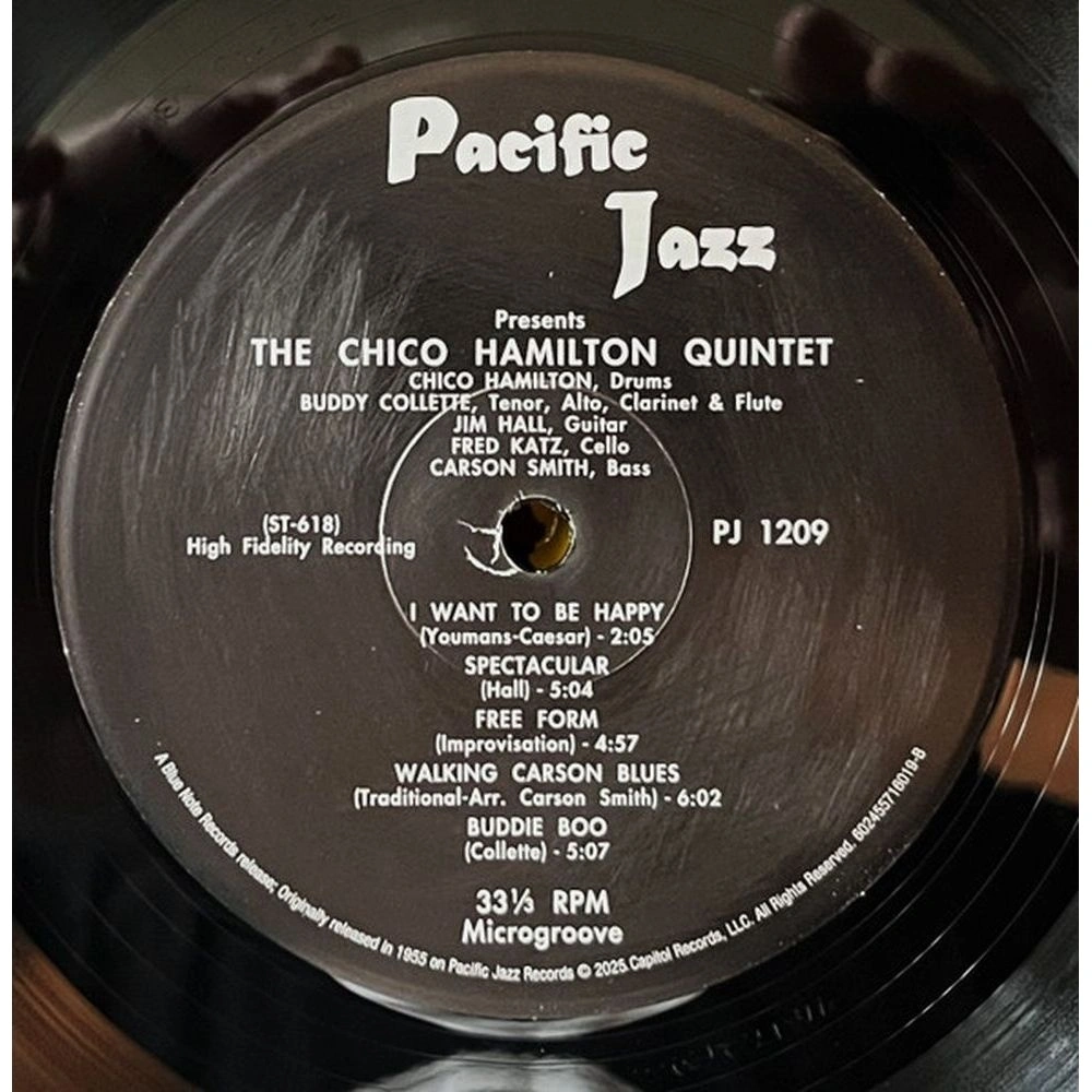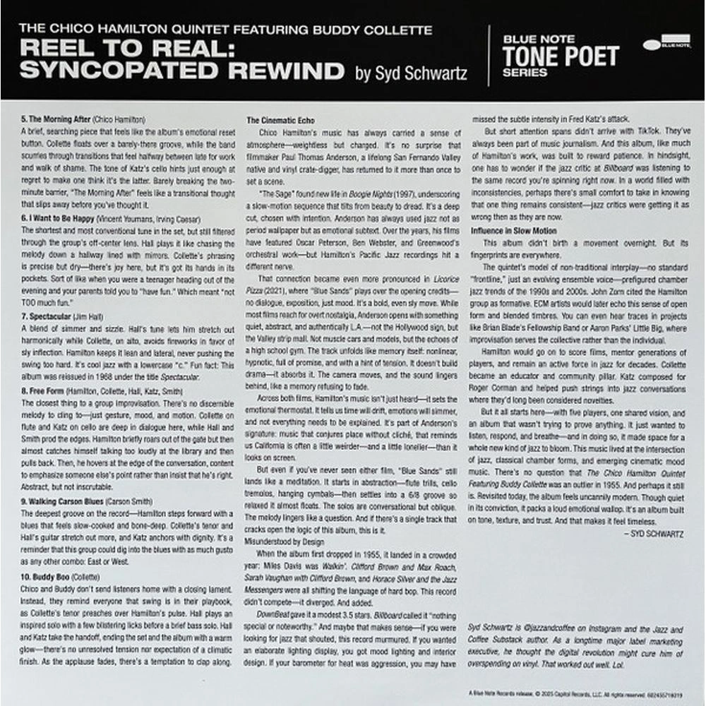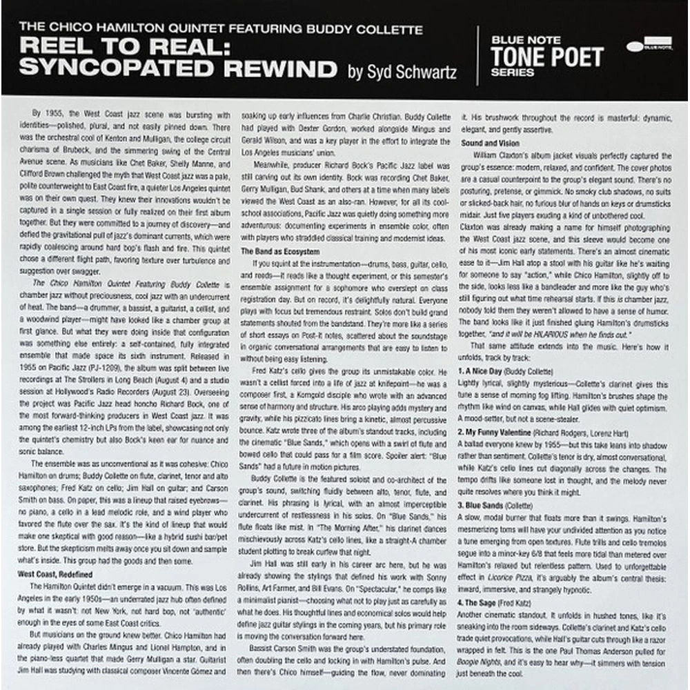 LP - это стереоиздание Tone Poet Vinyl Edition было спродюсировано Джо Харли, мастеринг осуществил Кевин Грей с оригинальных аналоговых мастер-лент, отпечатано на 180-граммовом черном виниле на заводе RTI и упаковано в роскошную обложку с наклейкой. Жемчужина камерного джаза Западного побережья, эта запись Тихоокеанского джаза 1955 года задокументировала выдающийся квинтет барабанщика Чико Гамильтона с Бадди Коллеттом на деревянных духовых, Джимом Холлом на гитаре, Фредом Кацем на виолончели и Карсоном Смитом на басу. Ансамбль создал неповторимое звучание с его уникальным инструментарием и уравновешенным, страстным исполнением тонких, изобретательных аранжировок стандартов и оригинальных произведений участников группы. Сторона 1 состоит из набора интроспективных студийных записей, включая выразительные пьесы Коллетта (« Blue Sands ») и Каца (« The Sage »), а также призрачную аранжировку « My Funny Valentine ». Сторона 2 представляет больше огненной стороны квинтета с набором живых записей, сделанных в Strollers в Лонг-Бич, Калифорния. Группа мощно качается от открывающей стороны « I Want To Be Happy » к завершающей « Buddy Boo » с отклонением в абстракцию в полностью импровизированной пьесе « Free Form ».