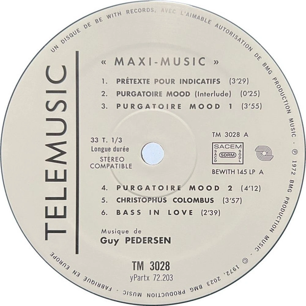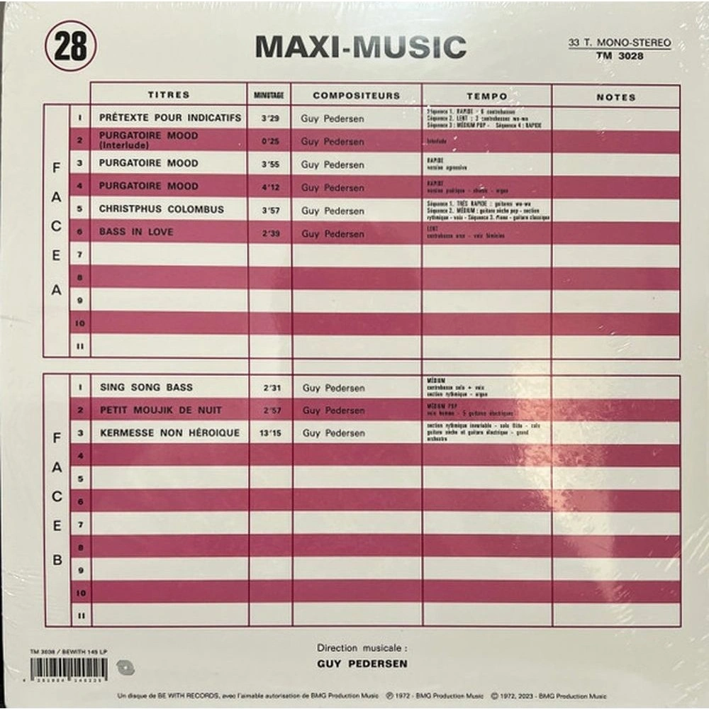 Волшебный альбом Гая Педерсена Maxi Music, первоначально выпущенный на культовом парижском лейбле tele Music в 1972 году, — это золото психоделического рока и джаз-фанка. Это важная работа Педерсена, колеблющаяся между грубостью и гладкостью, но всегда с этими гипнотическими ритмами. Это шедевр от начала до конца, но финальный 13-минутный опус просто поразит воображение. Поверьте!. Захватывающий открывающий трек "Pr?texte Pour Indicatifs" настолько могуч, что его перепел Кит Мэнсфилд на "Hot Property" от Big Business/Wind Of Change на KPM. Это трек из 4 размеренных частей: первая — стремительный виртуозный номер, вторая и третья представляют собой замедленные фанковые импровизации с органом и эффектом вау-вау, а четвертая — возвращение к неистовой энергии начальных тактов. Ух, довольно сенсационно. "Purgatoire Mood (Interlude)" — прекрасный переход к потрясающему, насыщенному духовыми инструментами, быстрому и агрессивному джазовому великолепию "Purgatoire Mood 1" и более поэтичному "Purgatoire Mood 2". Быстрые фанковые ритмы и драматическое взаимодействие!. "Christophus Colombus" — ещё одна песня с несколькими секциями; интро — быстрое психоделическое рок-выступление с эффектом wah-wah, которое действительно захватывает, прежде чем перейти к более размеренному, но не менее неумолимому гитарно-фанковому шоу с безмолвным вокалом, а позже — задумчивой гитарой и фортепиано в великолепной гармонии. Завершая эту захватывающую сторону, элегантная "Bass In Love" — мягкая и чувственная инструментальная фанк-композиция в замедленном темпе, где грубая виолончель, джазовое фортепиано и соблазнительный, хриплый вокал объединяются, создавая аромат затяжного жара с довольно возбуждающим эффектом. Открывая сторону B, "Sing Song Bass" начинается медленно, но, как только вступают барабаны, нас ждет глубоко мелодичный, энергичный шедевр с органом, флейтой, фортепиано и басом — он действительно запоминающийся и абсолютно фантастический. Необычный, безумный психоделический поп "Petit Moujik De Nuit" — удивительно захватывающий номер, но для нас он служит лишь прелюдией к феноменальному заключительному треку. Абсолютный зверь, который полностью сметает все на своем пути!. Да, несмотря на то, что Maxi Music — это редчайшая из библиотечных записей — пластинка, которая может существовать сама по себе от начала до конца — она действительно содержит *один* абсолютный убийственный трек. И Питерсон приберег лучшее напоследок. Настоящая изюминка — можете ли вы представить что-то лучше?! — это пылающий психоделический рок-фанковый хит, печально известный 13-минутный триллер "Kermesse Non H?roique". Содержащая потрясающее соло на флейте, эта композиция действительно звучит как что-то с первого альбома Dungen. Да, настолько хорошо. Какой замечательный способ завершить карьеру!. Аудио для Maxi Music было ремастерировано постоянным участником Be With Саймоном Фрэнсисом, что гарантирует, что этот релиз звучит лучше, чем когда-либо. Мастерство Сисели Балстон позволило избежать каких-либо потерь при обработке, в то время как оригинал.В штаб-квартире Be With HQ была восстановлена ??культовая обложка альбома Tele Music, что стало завершающим штрихом в этом давно назревшем переиздании.