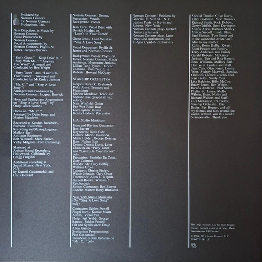 Альбом « Mr. C» Нормана Коннорса — это мастер-класс по утонченному современному фанку и буги-соулу, опередивший свое время. Выпущенный в 1981 году, этот альбом запечатлел известного джазового барабанщика и продюсера на творческом перепутье: он смело погружается в буги-фанк, не теряя при этом своего душевного, джазового стиля. То, что когда-то могло озадачить джазовых пуристов, теперь восхищает поклонников соула и фанка; альбом незаметно стал культовым, и теперь, почти 45 лет спустя, «Mr. C» звучит свежее, чем когда-либо. Наполненный заразительным мощным фанком, пышными аранжировками и трогательными до глубины души выступлениями, это альбом, балансирующий на грани совершенства, что гарантирует его непреходящее значение в каноне буги/джаз-фанк-соул. С первых же секунд альбом Mr. C дает понять одно: это Норман Коннорс в своем самом фанковом проявлении. Большая часть альбома — это настоящая вечеринка: танцевальные ритмы, дополненные энергичными риффами духовых инструментов и стильными буги-вайбами ??начала 80-х. Активно используются синтезаторы и драм-машины, демонстрируя радостное принятие Коннорсом современных фанк-трендов. Каждый трек сияет по-своему захватывающе, демонстрируя универсальность Коннорса и его умение смешивать жанры, создавая при этом незабываемые мелодии. Неотразимый, энергичный трек She's Gone открывает альбом, создавая мощный грув на электропианино Rhodes и невероятно плотный ритм буги-фанка. Пышные струнные акценты и духовые вставки переплетаются с фанковой басовой линией, а вокал (в исполнении молодого Бо Уильямса ) парит с оттенком госпела. Спустя более четырех десятилетий он остается шедевром. Оправдывая свое название, мерцающая Party Town привносит глубокую энергию электро-фанка, накладывая друг на друга бурлящий синтезаторный бас и блестящие ведущие синтезаторные линии. Ритм невероятно затягивает, это бодрый, наполненный духовыми инструментами джем, который так и манит двигаться. Далее следует утонченный фанк Keep Doin' It – низкочастотная пост-диско композиция, движимая элегантной атмосферой и склоняющаяся к звучанию ночного буги. Фанковая гитара, четкая игра на барабанах (с отточенными в джазе навыками Коннорса ) и мягкий вокал призывают вас «продолжать делать» то, что у вас получается. Stay with Me добавляет немного островного колорита, создавая плотный карибский грув с тропической перкуссией и бодрым темпом, который почти можно назвать калипсоулом. Слияние карибских ритмических элементов с контекстом R&B демонстрирует готовность Коннорса экспериментировать с мировыми звуками, сохраняя при этом душевность и танцевальность. Сторона B открывается дерзкой, роскошной фанк-композицией Anyway You Want пропитанной душевной энергией. Композиция Sing a Love Song с её тихим но уверенным темпом, немного замедляет его, превращаясь в сексуальный, плавный джаз-фанковый шедевр с молодым Гленном Джонсом на ведущем вокале. Аранжировка элегантна, построена на тёплых клавишных и неоспоримом груве. Небесная Love's In Your Corner – это воплощение душевного воодушевления. Легендарный вокал Джин Карн парит над энергичным фанком с духовыми инструментами, создавая настоящий R&B-хит. Изысканная, джазовая инструментальная композиция Mr. C — это плавный, мягкий, наполненный фанком среднетемповый грув, в котором саксофон и теплые клавишные органично переплетаются.