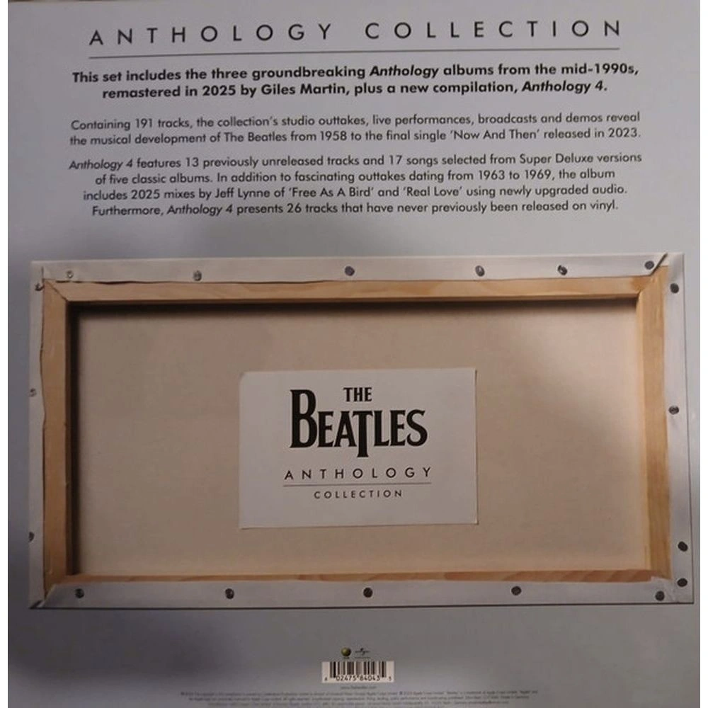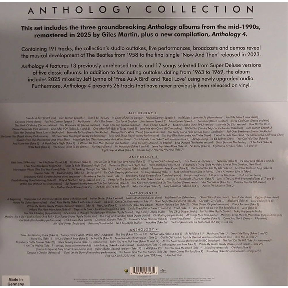 The Beatles возвращаются! «Anthology Collection» — это история The Beatles, рассказанная самими музыкантами. «Anthology Collection» состоит из 12 пластинок и содержит три новаторских альбома The Beatles «Anthology» 1990-х годов, которые были ремастерированы продюсером Джайлсом Мартином в 2025 году. Кроме того, вас ждет совершенно новый альбом «Anthology 4». 26 треков впервые издаются на виниле!. Каждый альбом из трёх виниловых пластинок, отпечатанный на чёрном 180 г виниле, будет упакован в тройной разворотный конверт с оригинальным оформлением, аннотациями Марка Льюисона и восстановленными фотографиями для Anthology 1-3; Anthology 4 дополнена совершенно новыми аннотациями Кевина Хоулетта и фотографиями. Внешний футляр включает оригинальное оформление Клауса Фурмана, дополненное съемной o-card с фотографией группы и списком композиций.