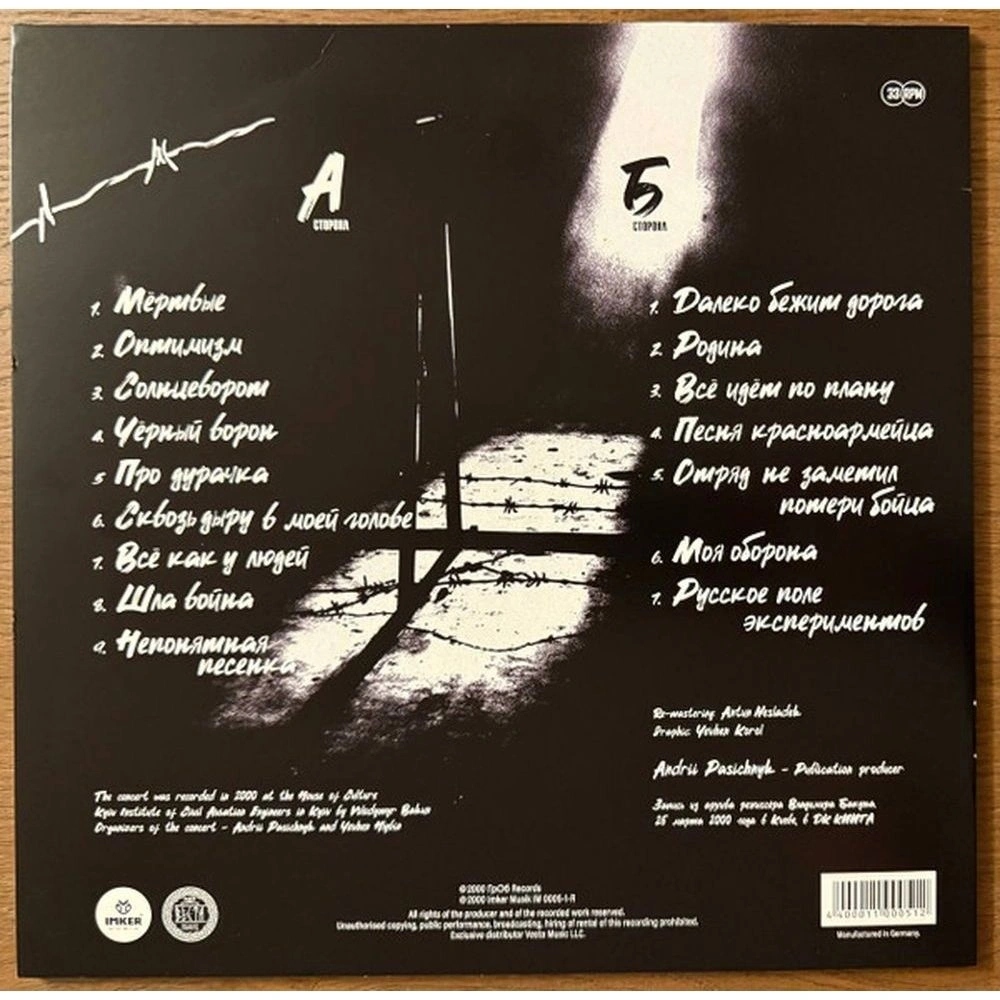Мёртвые, Оптимизм, Солнцеворот, Чёрный ворон, Про дурачка, Сквозь дыру в моей голове, Всё как у людей, Шла война, Непонятная песенка, Мы идём в тишине, Родина, ответ на вопрос (комментарий о составе группы), Всё идёт по плану, Песня красноармейца, Отряд не заметил потери бойца, Моя оборона, Русское поле экспериментов