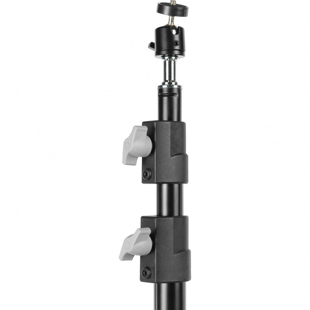 Телескопическая колонна стойки разделена на три секции большого диаметра, что позволяет значительно увеличить общую высоту без потери стабильности и жесткости конструкции. Прочные полимерные зажимы надежно фиксируют каждый сегмент, защищая механизмы от износа и обеспечивая плавное движение секций.