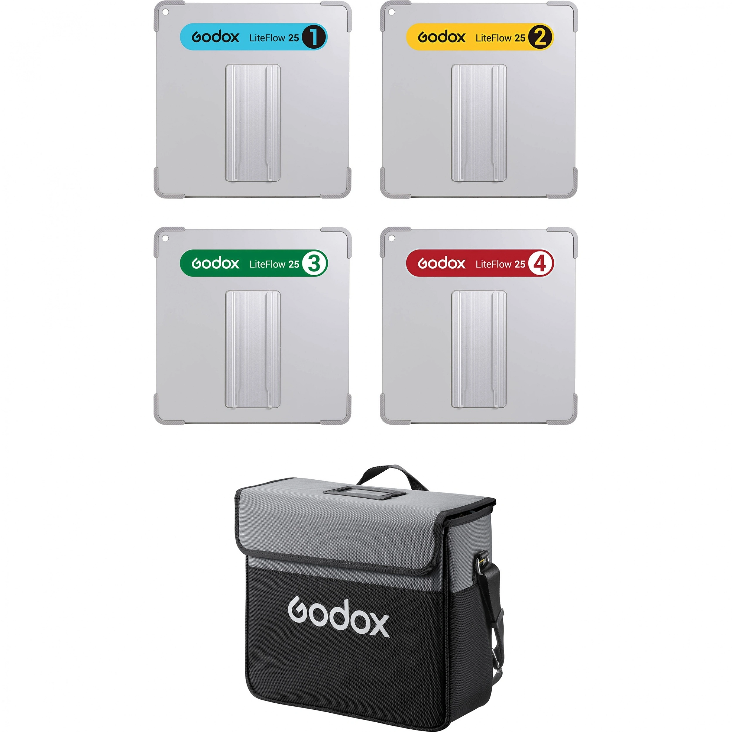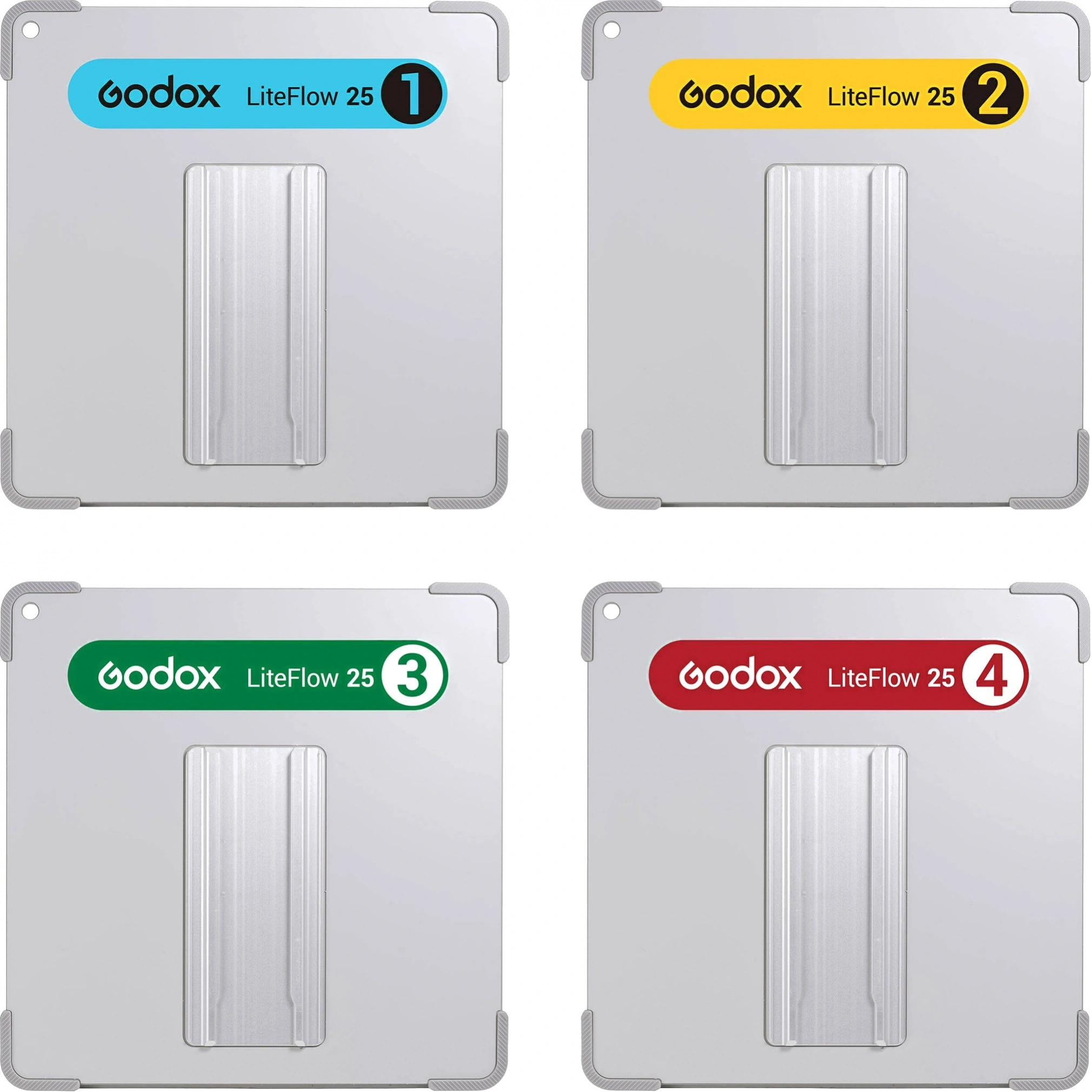 Комплект из четырех отражателей 25х25 см с разными типами трансформации света, 100% цветопередача, потеря интенсивности света всего 3%. Материал: алюминиевый сплав, вес панели 403 г. Широкий ассортимент доп. крепежа. Комплект упакован в мягкий кейс.