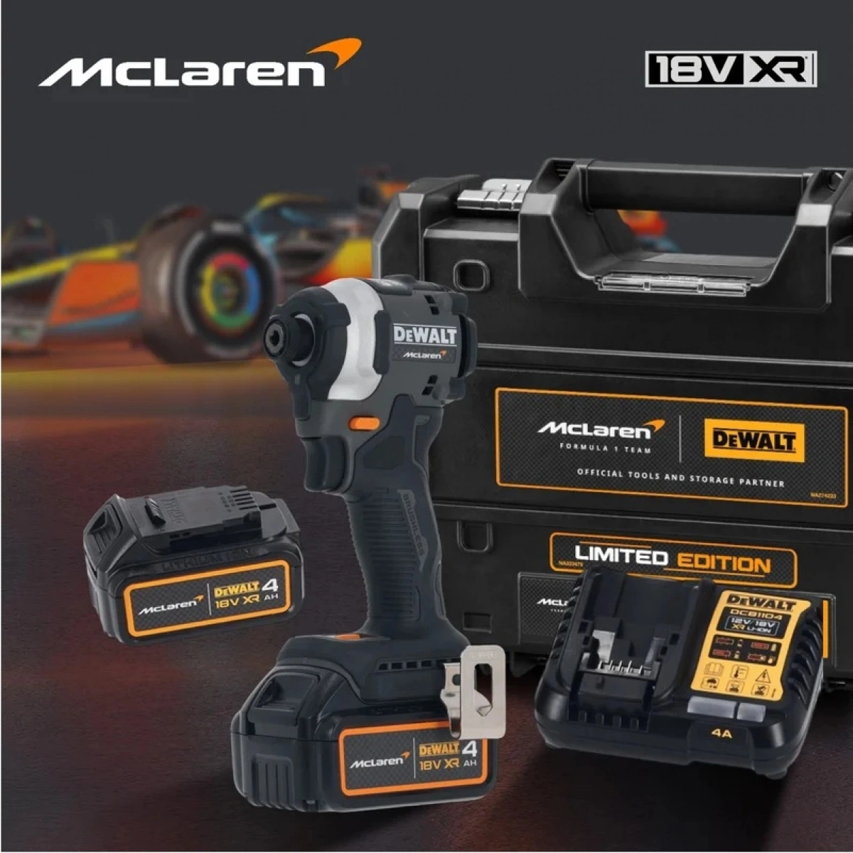 Всемирно известный бренд DeWALT стал официальным партнером по поставке инструментов для команды McLaren Formula 1. В знак дружеских отношений компания DeWALT недавно выпустила лимитированную серию инструментов, в том числе винтоверт DCF85M (на базе DCF805). Инструмент оформлен в стилистике McLaren под карбон, выглядит эффектно. В комплект входят два аккумуляторa McLaren Edition 18V 4 Ач и зарядное устройство. Набор поставляется в кейсе TSTAK черного цвета.Импульсный шуруповерт обладает компактными размерами, поэтому удобен для использования в ограниченных пространствах. Благодаря тангенциальному удару позволяет работать с прикипевшим крепежом. Трёхпозиционный переключатель режимов дает возможность выбрать оптимальное количество оборотов. Бесщёточный двигатель увеличивает время работы на одном цикле заряда до 50% и повышает мощность на 20% в сравнении с шуруповертами на щеточном моторе. Интеллектуальная схема защищает шуруповерт от перегрузки - он отключается.