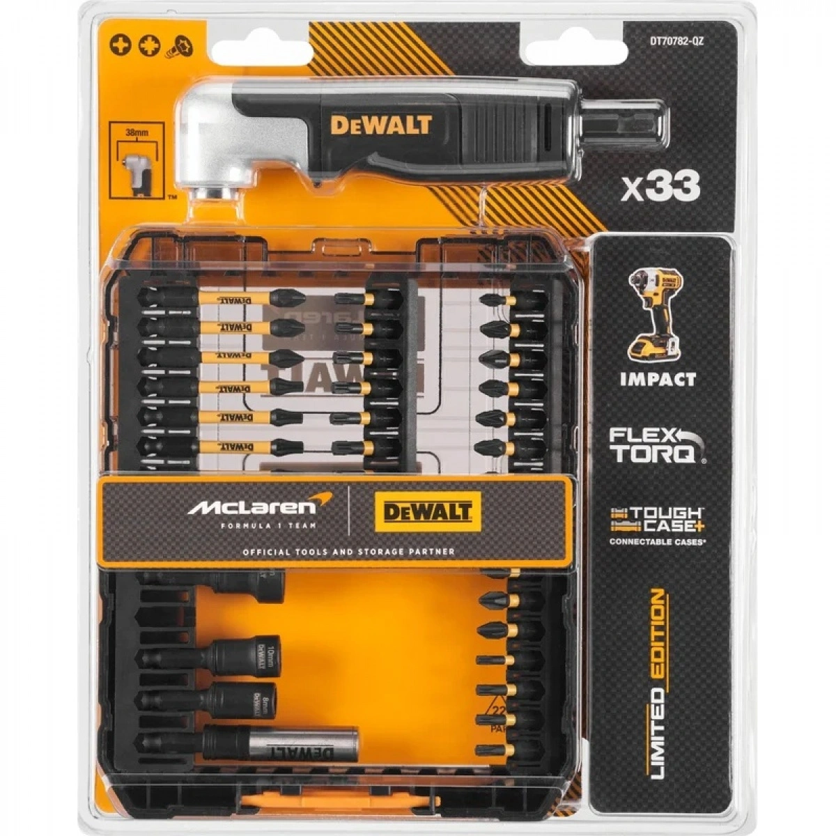 Всемирно известный бренд DeWALT стал официальным партнером по поставке инструментов для команды McLaren Formula 1. В знак дружеских отношений компания DeWALT недавно выпустила лимитированную серию продукта, в том числе набор бит и головок DT70782 в фирменном кейсе. В комплект входят биты 25 мм (1xPH1, 3xPH2, 1xPZ1, 5xPZ2, 1xT15, 5xT20, 3xT25, 1xT27, 1xT30) и 57 мм (1xPH1, 2xPZ2, 1xT20, 3xT25), три торцевые головки (8/10/13 мм) с хвостовиком HEX 1/4", магнитный держатель бит, а также ударный угловой торсионный адаптер.