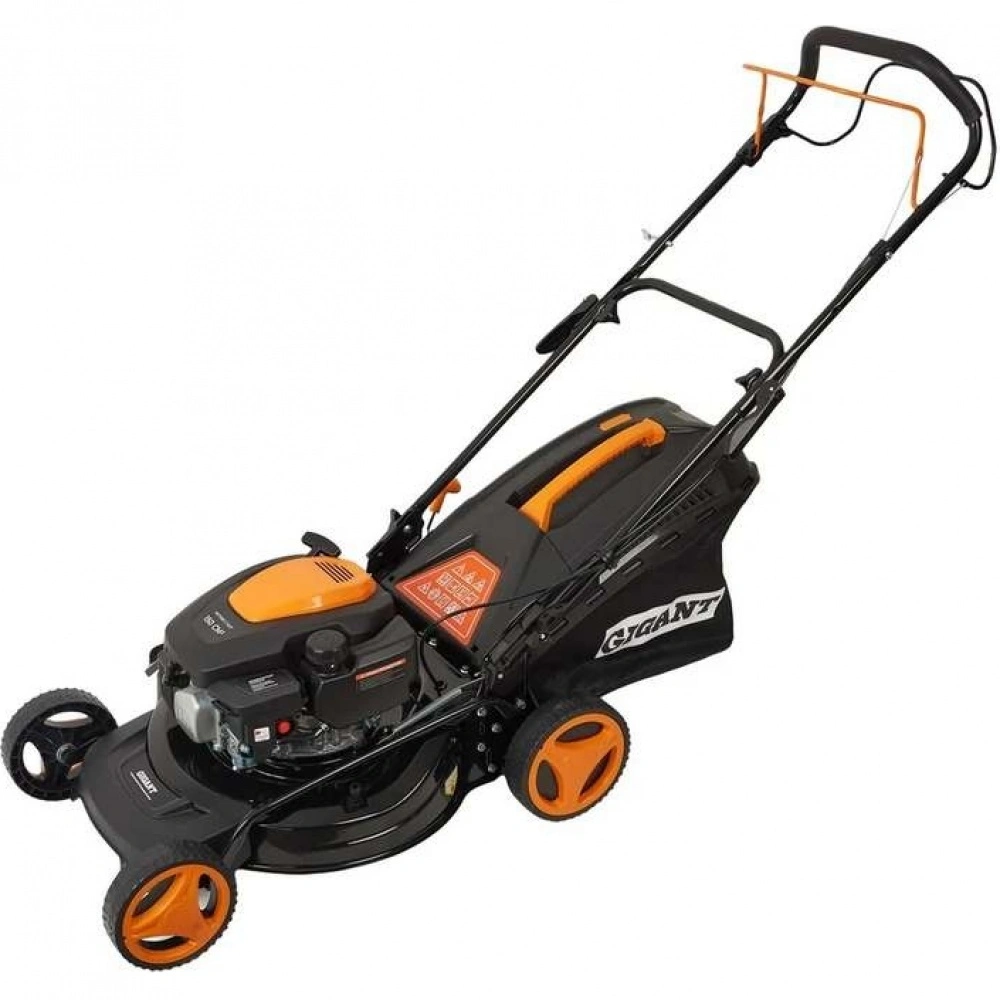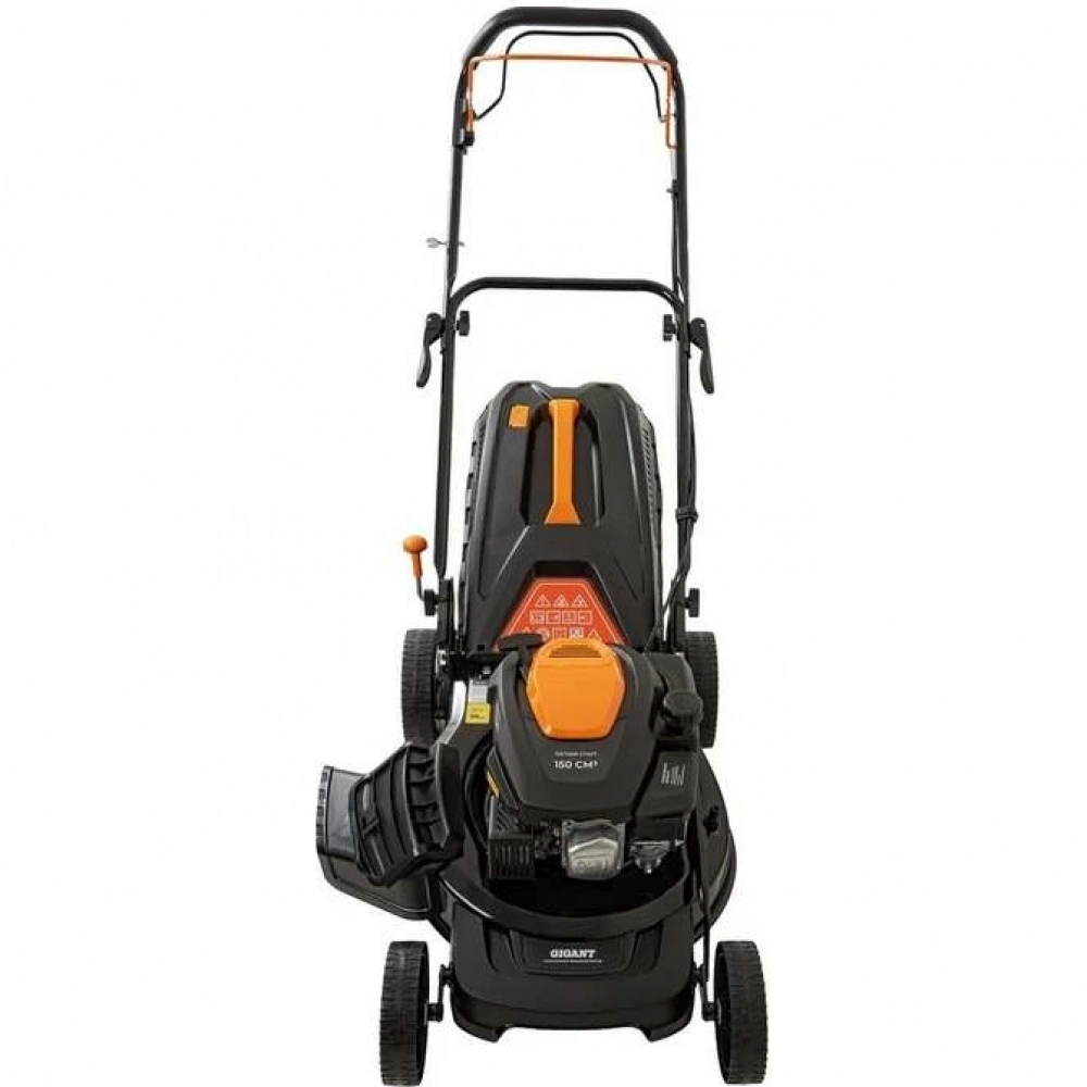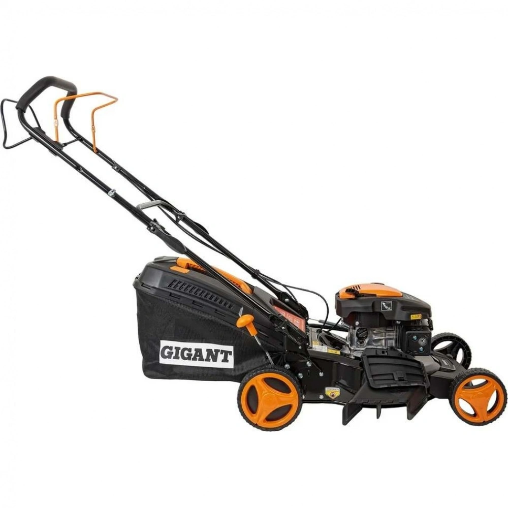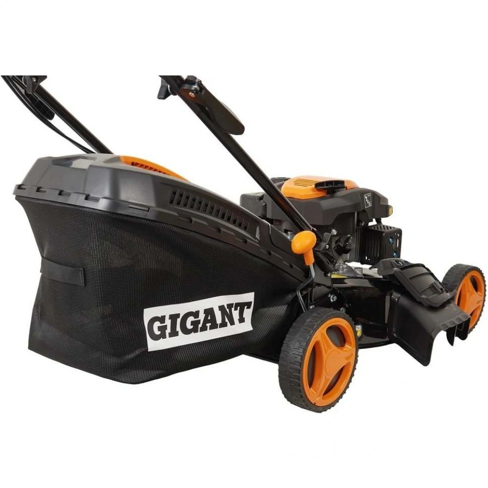 Бензиновая газонокосилка Gigant PLM-03 - самоходная машина для ухода за газоном. Косилка выполняет задний выброс травы, измельчение, боковой выброс и сбор травы в контейнер.