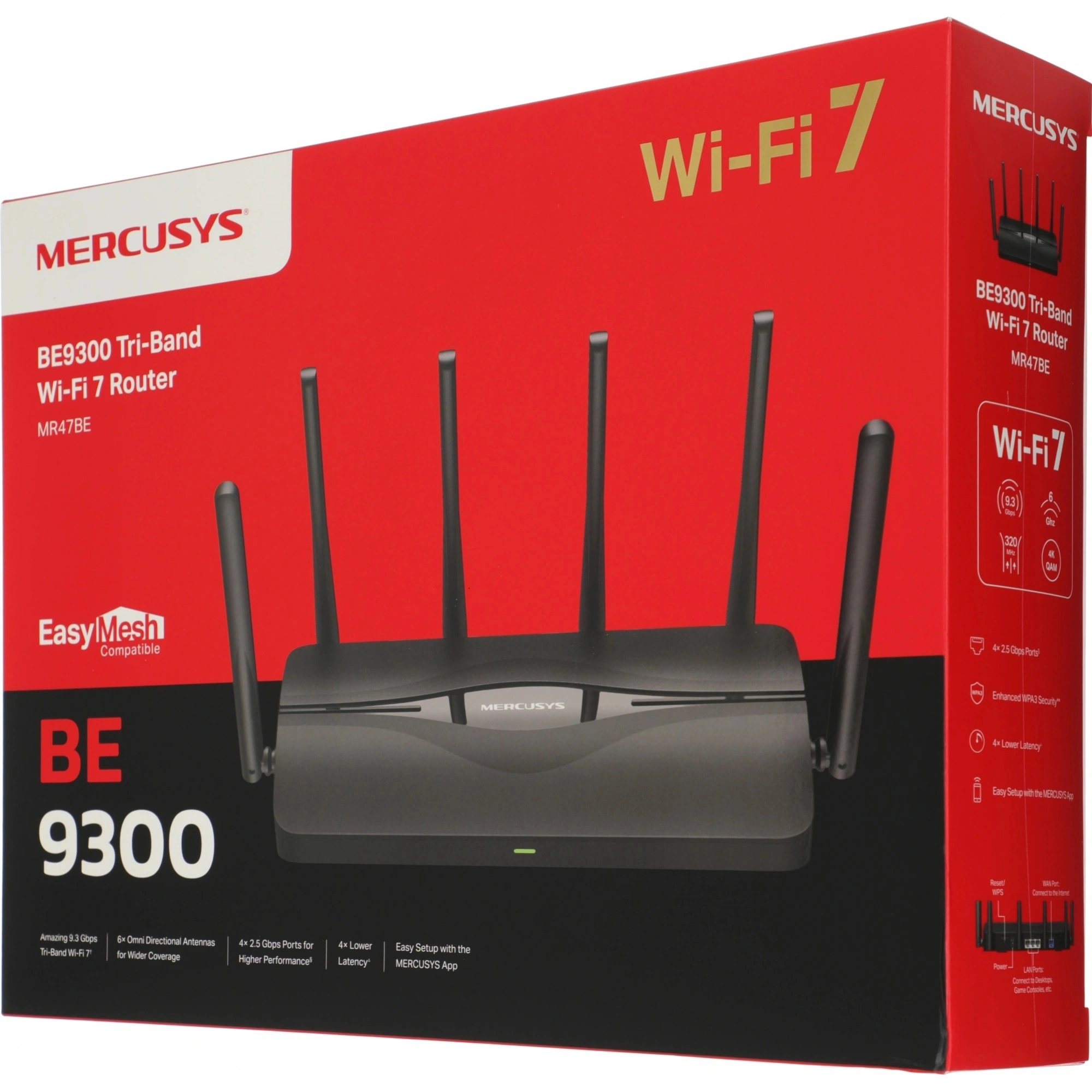 Wi-Fi роутер Mercusys MR47BE – отличный выбор для активных пользователей Интернета. Используя беспроводной маршрутизатор Mercusys MR47BE, Вы сможете быстро организовать высокоскоростную беспроводную сеть дома и в офисе, предоставив доступ к сети Интернет компьютерам и мобильным устройствам практически в любой точке зоны действия беспроводной сети. Оснащенный одним портом WAN 2,5 Гбит/с и тремя портами LAN 2,5 Гбит/с, MR47BE позволяет вам в полной мере использовать возможности широкополосного доступа. Подключите к этим портам ПК, Smart TV, игровые консоли или сетевые хранилища (NAS) для сверхскоростного проводного подключения.