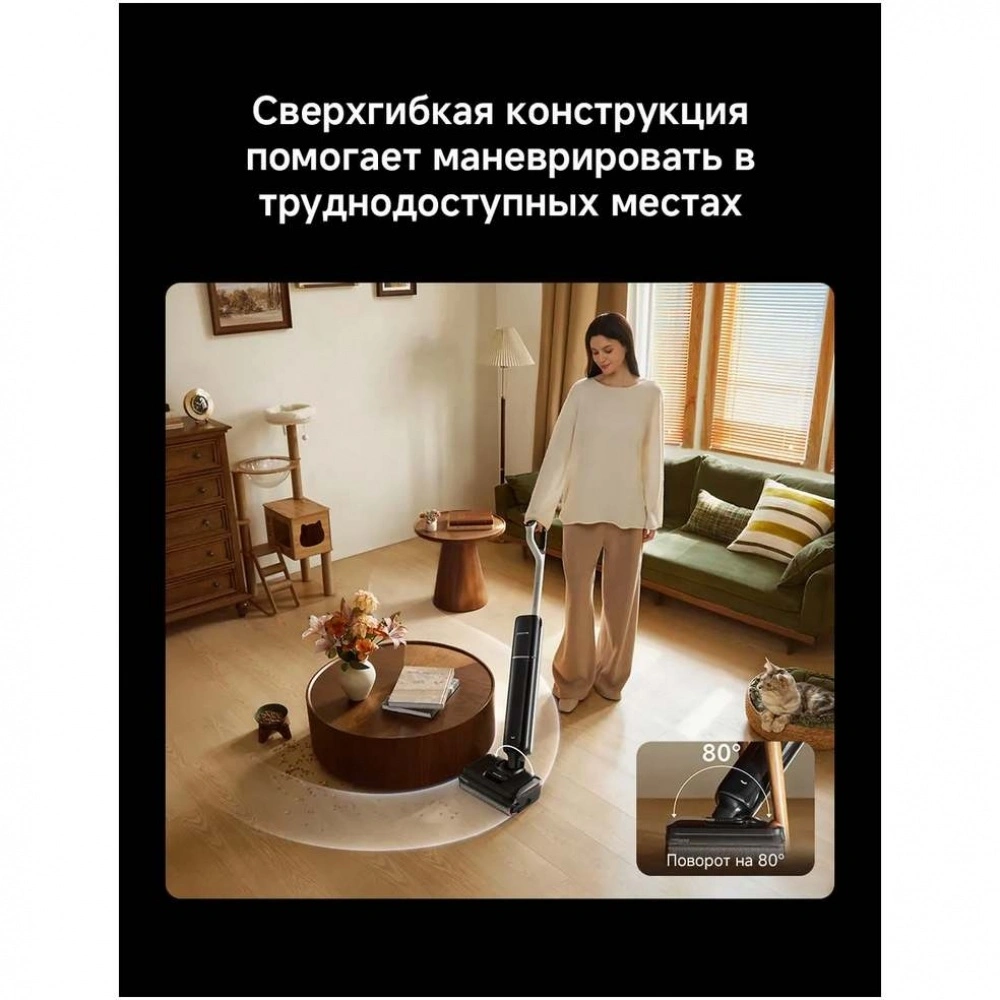 Ультратонкая конструкция аккумуляторного пылесоса обеспечивает легкий доступ к труднодоступным местам под кроватью и диванами, а наклон ручки на 180° и поворот корпуса на 80° гарантируют превосходную маневренность при уборке вокруг мебели.
