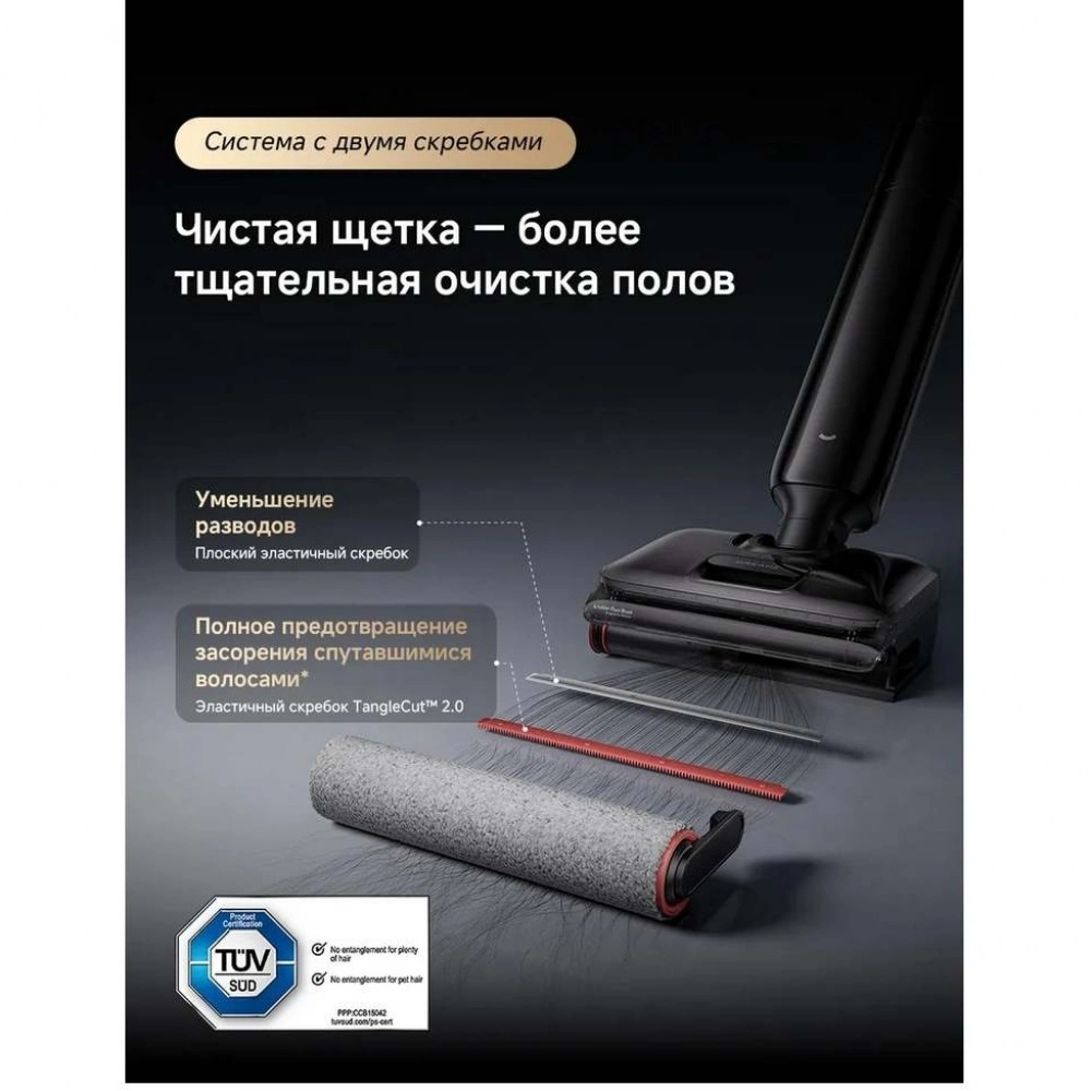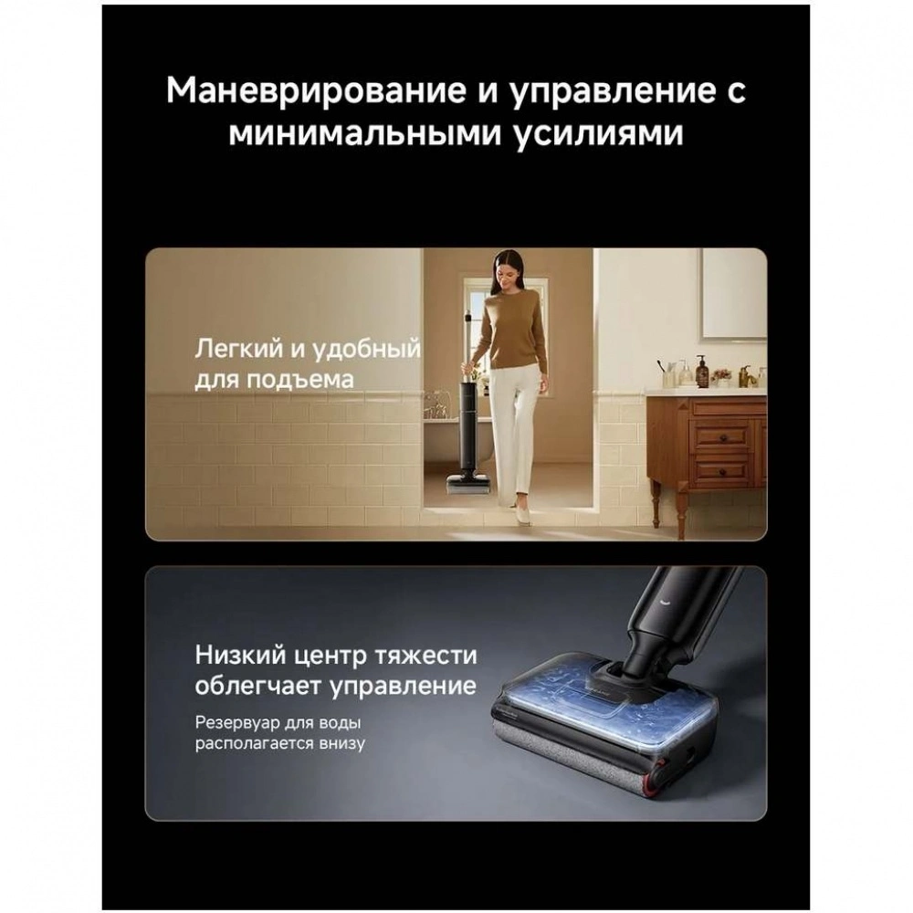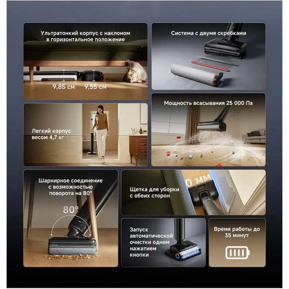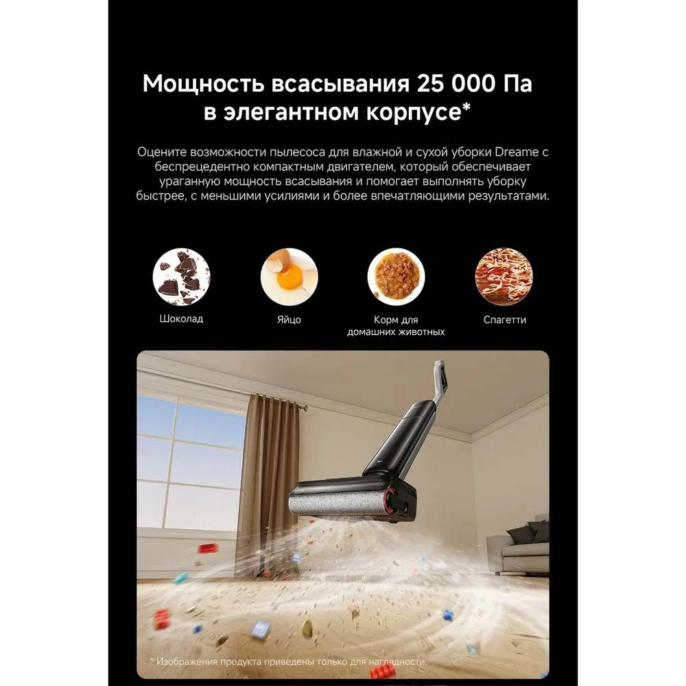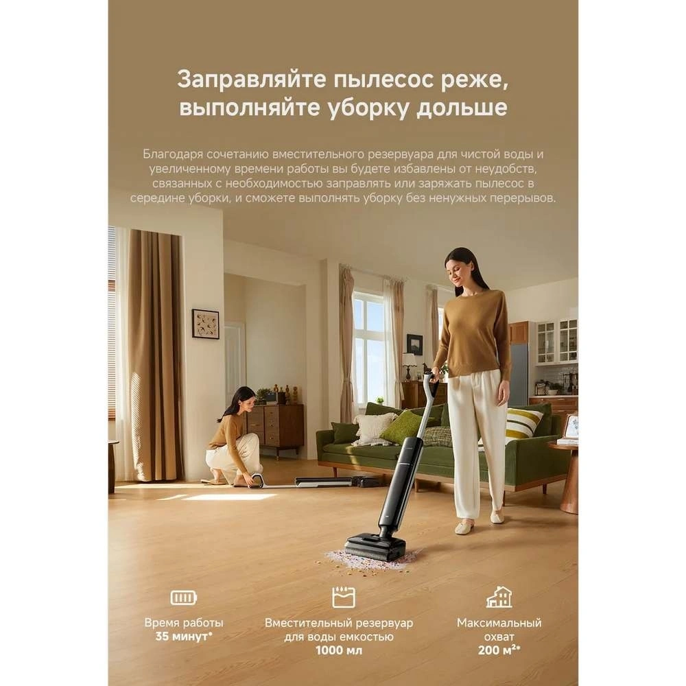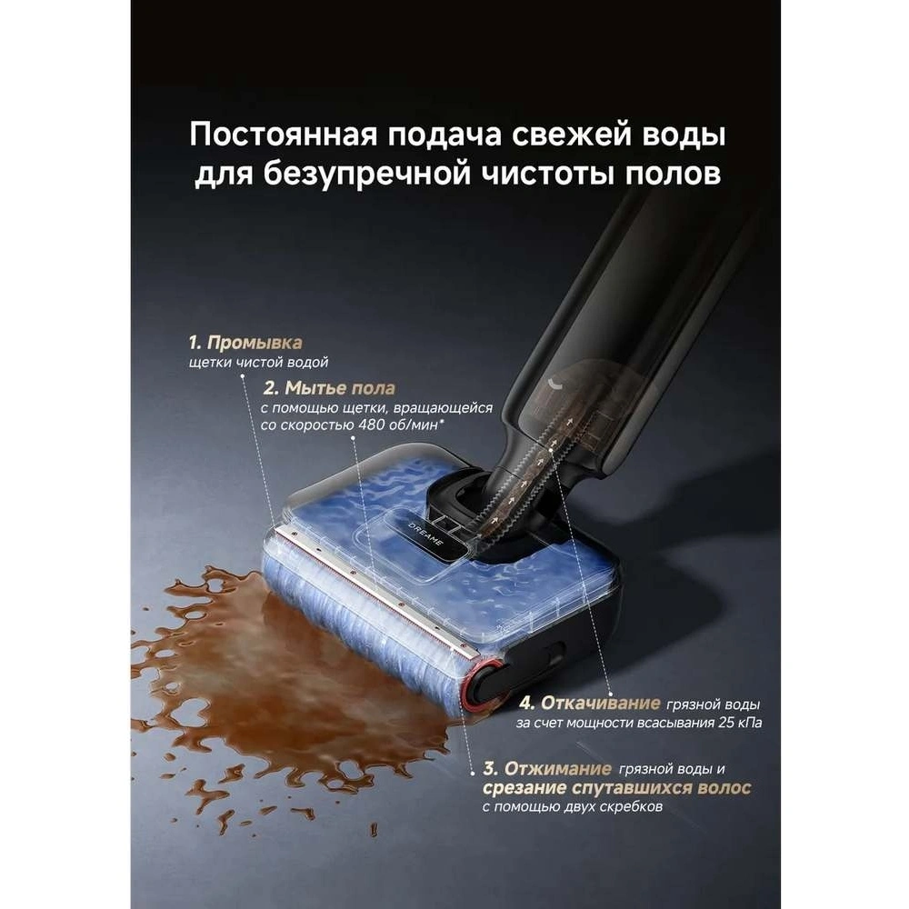 Бесщеточный мотор с мощностью всасывания до 25000 Па и облегченный эргономичный дизайн позволяют быстро и эффективно справляться с любыми задачами. Встроенный контейнер на 1000 мл для чистой воды помогает не прерывать уборку на доливы, а специальные датчики автоматически обнаруживают загрязнения и регулируют силу всасывания.