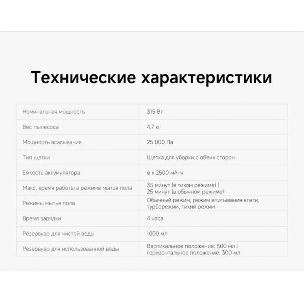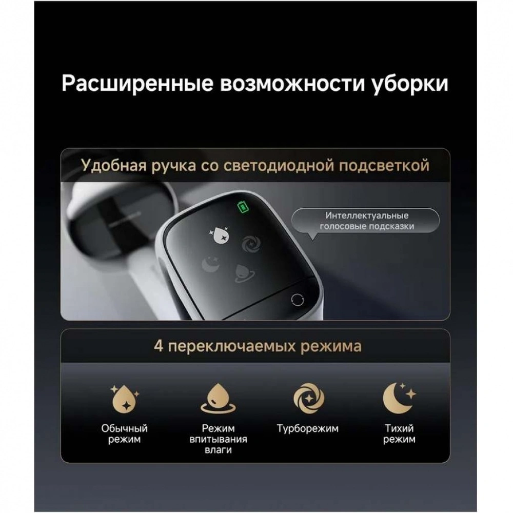 Мощный пылесос для дома оснащен 4 режимами работы: обычным, тихим, турбо и режимом впитывания влаги. После завершения работы щетка промывается водой на станции, а после сушится с использованием центробежной силы.