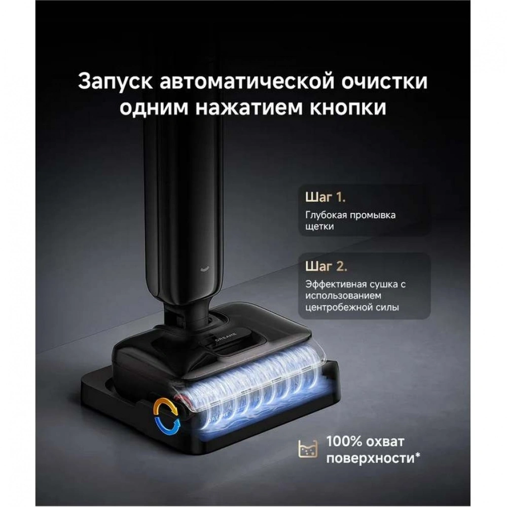Аккумулятор ручного пылесоса Дрими для мытья полов обеспечивает до 35 минут непрерывной уборки. На светодиодном дисплее удобно отслеживать процент заряда и переключаться между режимами. А система хранения самого устройства на напольной подставке делает его всегда готовым к работе и исключает необходимость настенного монтажа.