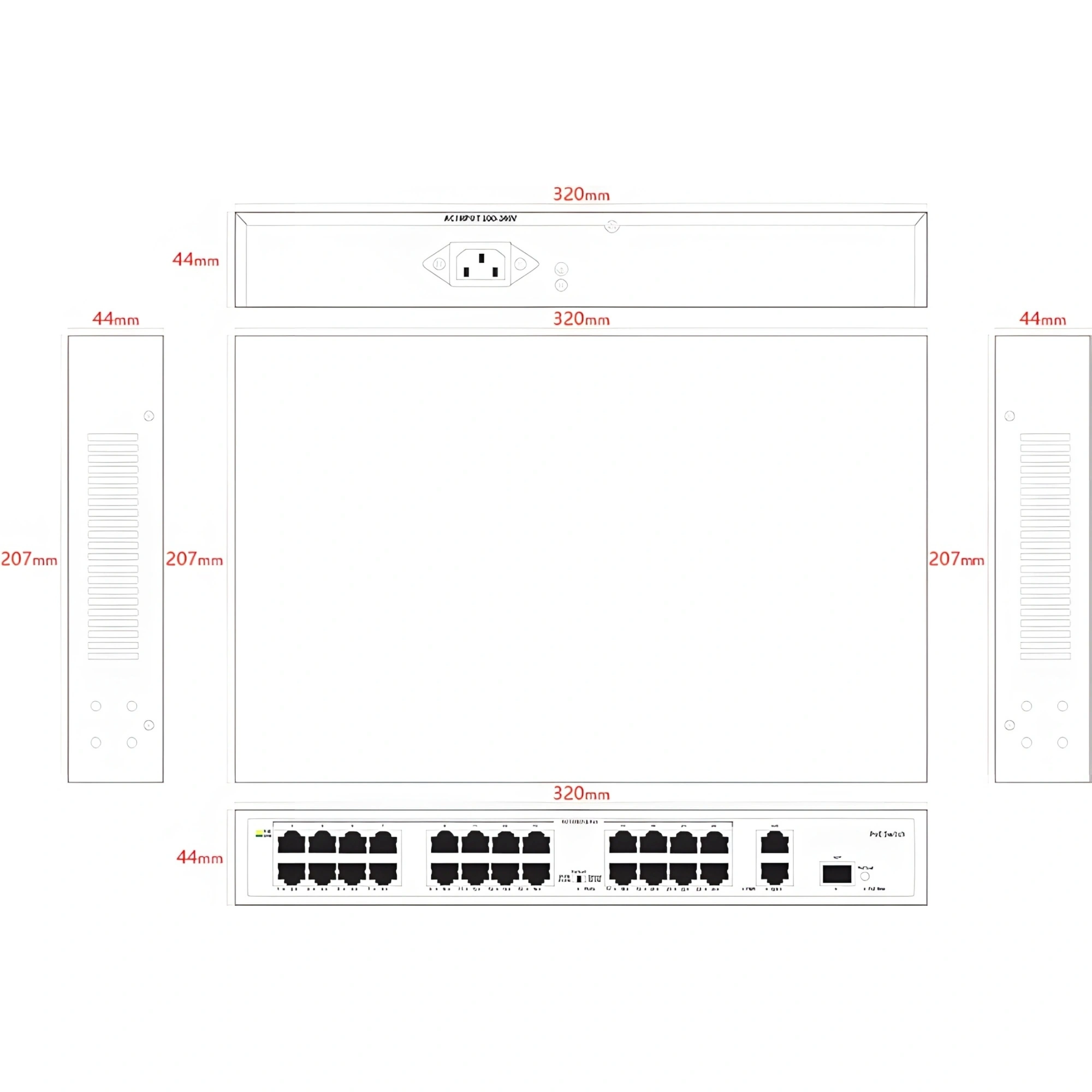 Вес устройства составляет 2,32 кг, что делает его удобным для монтажа в различных условиях. Коммутатор поддерживает технологии PoE 802.3af и 802.3at, позволяя не только передавать данные, но и обеспечивать питание для совместимых устройств по Ethernet-кабелю, что упрощает установку сетевых камер и точек доступа.