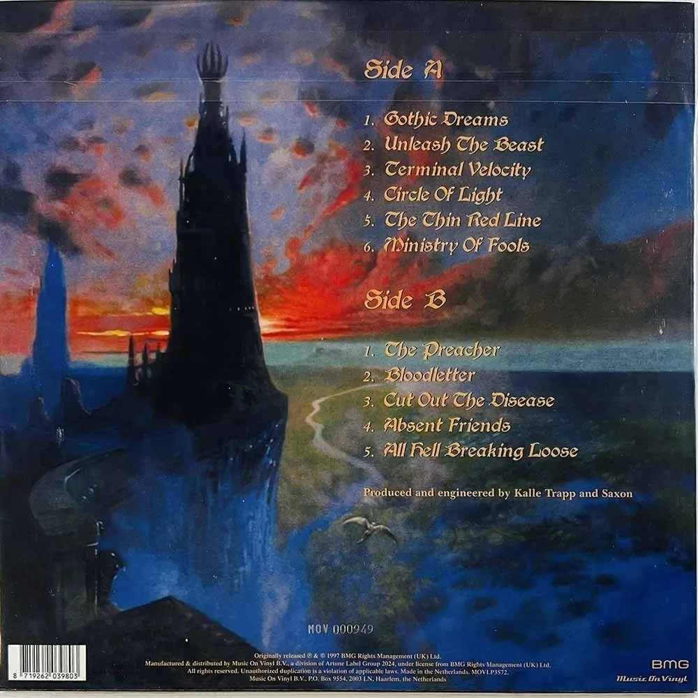 Ограниченный тираж — 1500 индивидуально пронумерованных экземпляров на красном виниле, включая вкладыш. «Unleash the Beast» — тринадцатый студийный альбом английской хэви-метал группы Saxon, первоначально выпущенный в 1997 году. Это был их первый студийный альбом с Дугом Скарраттом на гитаре. Новая волна британских икон хэви-метала Saxon неожиданно вернула себе популярность среди металлистов того времени. «Unleash the Beast» олицетворял постепенный процесс реабилитации группы, когда они вернулись к истокам и занялись тем, что у них получается лучше всего: хэви-металом! Среди выдающихся треков этого альбома — «Terminal Velocity», «Circle of Light» и «The Preacher». «Unleash the Beast» позволил Saxon впервые за почти десятилетие отправиться в тур по Америке и, таким образом, способствовал их устойчивому возвращению в сердца металлистов, что привело к ещё большему успеху в новом тысячелетии.