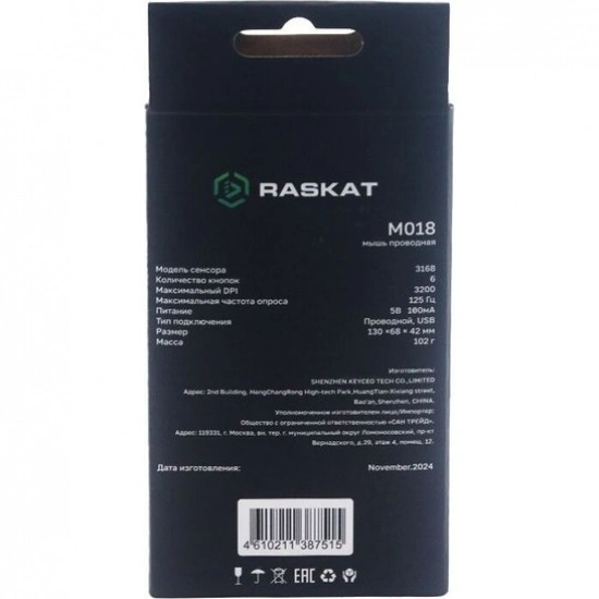 Как часть линейки бренда Raskat, эта проводная оптическая мышь завоевывает доверие пользователей благодаря качеству, надежности и производительности. Выбирая мышь Raskat, вы получаете современное устройство для повседневной работы и развлечений.