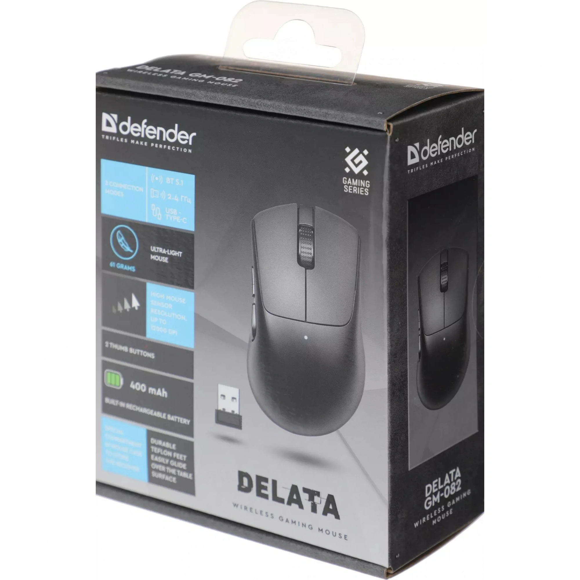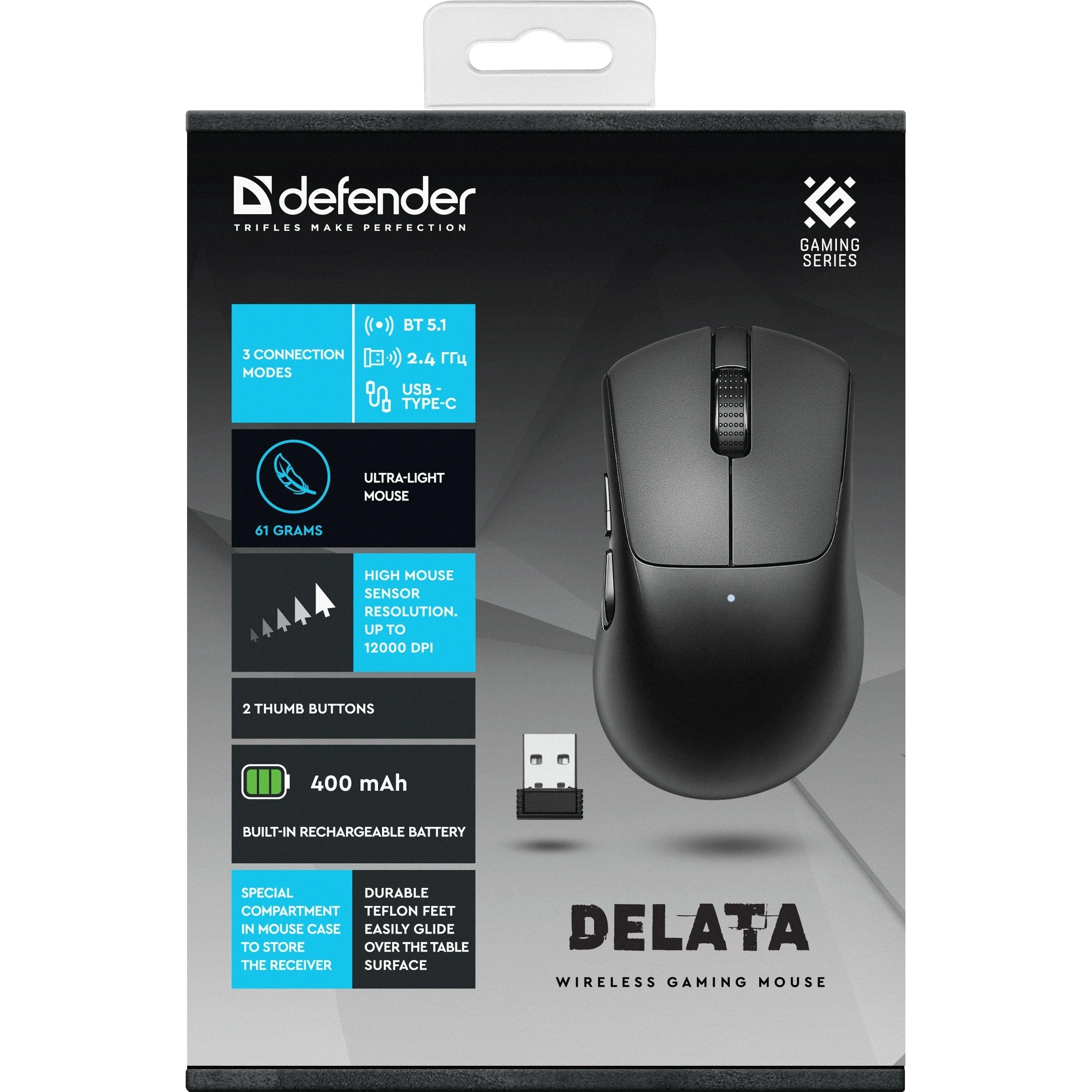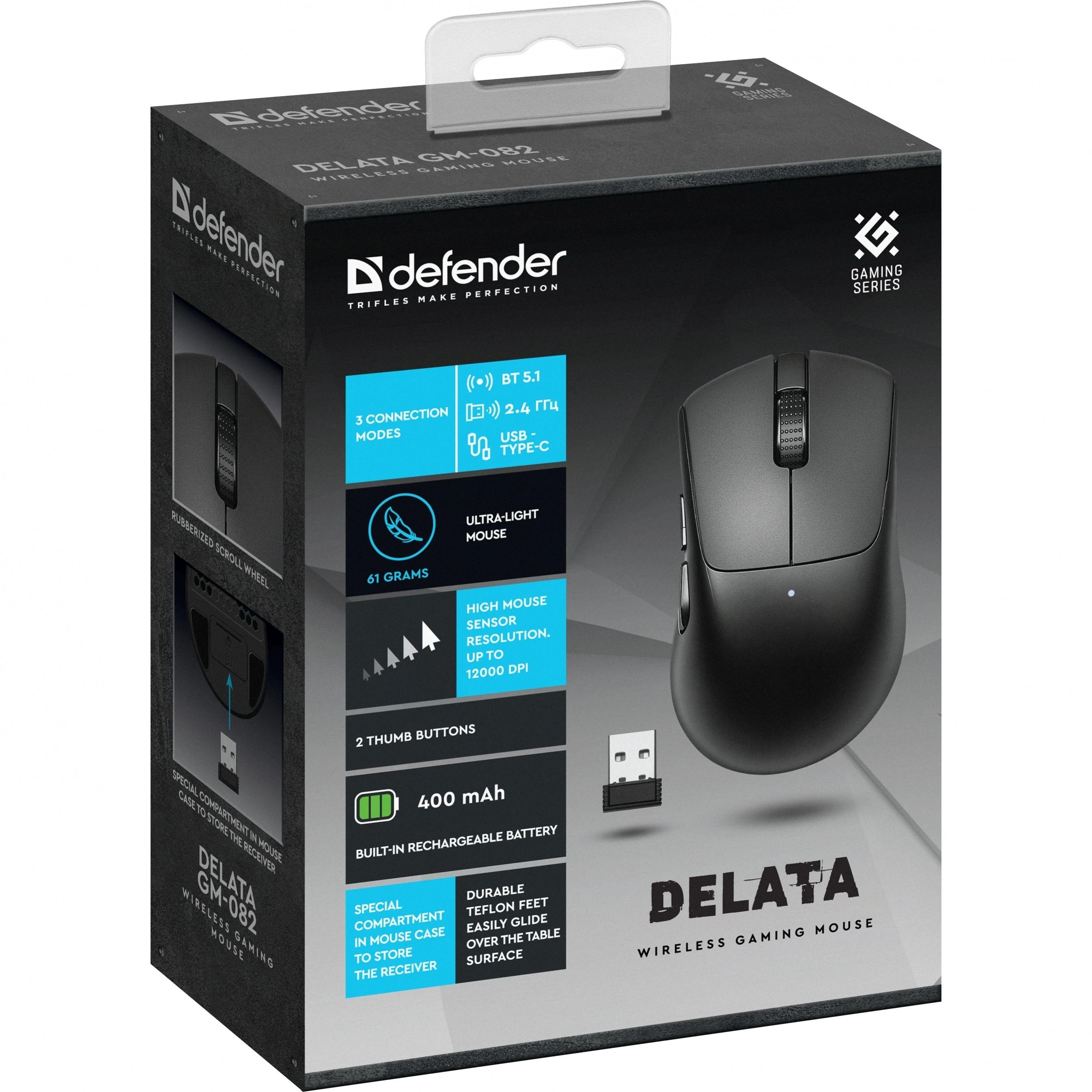 Ультралегкая игровая мышь Defender Delata GM-082 с 3 режимами подключения: проводной, беспроводной по радиоканалу, беспроводной по Bluetooth. Сенсор мыши обеспечивает высокое разрешение мыши - до 12000 dpi.Также данная модель имеет встроенный аккумулятор, 2 боковые кнопки и тефлоновые ножки для легкого скольжения по любой поверхности.