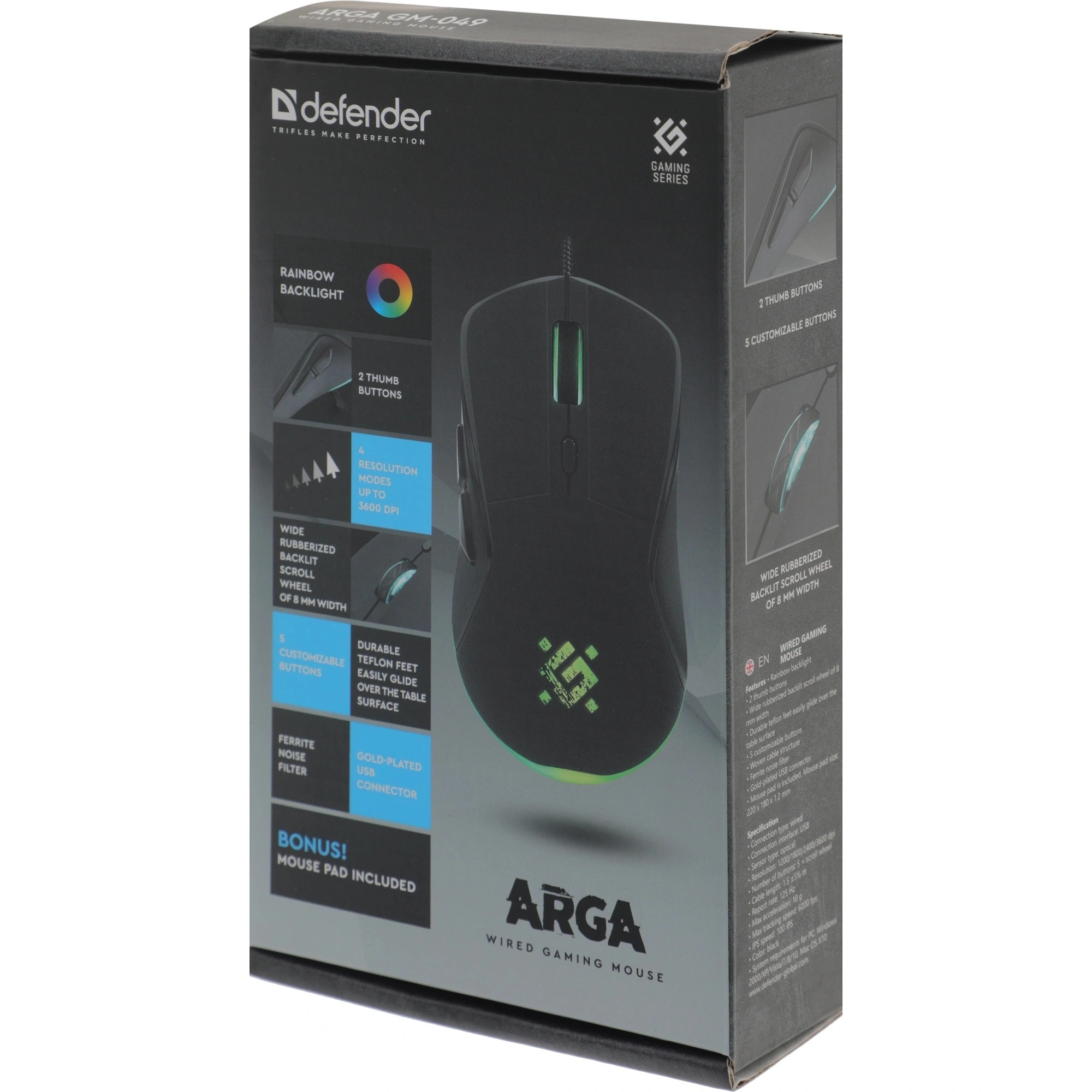 Мышь+коврик проводная Defender Arga GM-049 [52049] заключена в черный пластиковый корпус с матовым покрытием, на котором не остается следов от пальцев. Интегрированная разноцветная подсветка делает манипулятор заметнее в условиях недостаточного освещения. Подключение к устройствам с USB-разъемом осуществляется через 1.5-метровый кабель с тканевой оплеткой, не допускающей появления заломов. Мышь Defender Arga GM-049 [52049] оснащена оптическим светодиодным сенсором для точного наведения курсора. Регулировка разрешения датчика производится с помощью отдельной кнопки. Спрятанные в основании тефлоновые ножки и компьютерный коврик гарантируют плавное скольжение аксессуара.