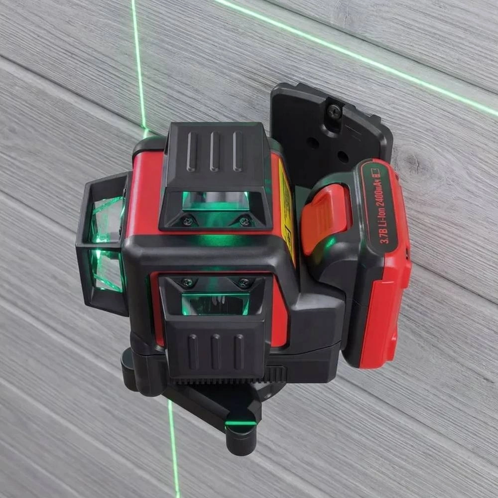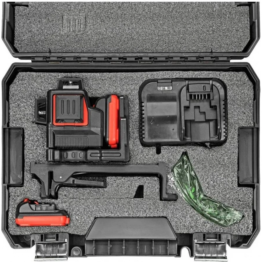 Лазерный нивелир со встроенным настенным креплением; аккумулятор 3,7 В 2400мАч литий-ионный (2 шт.); зарядное устройство для АКБ; крепление-зажим; очки; руководство по эксплуатации; пластиковый кейс.