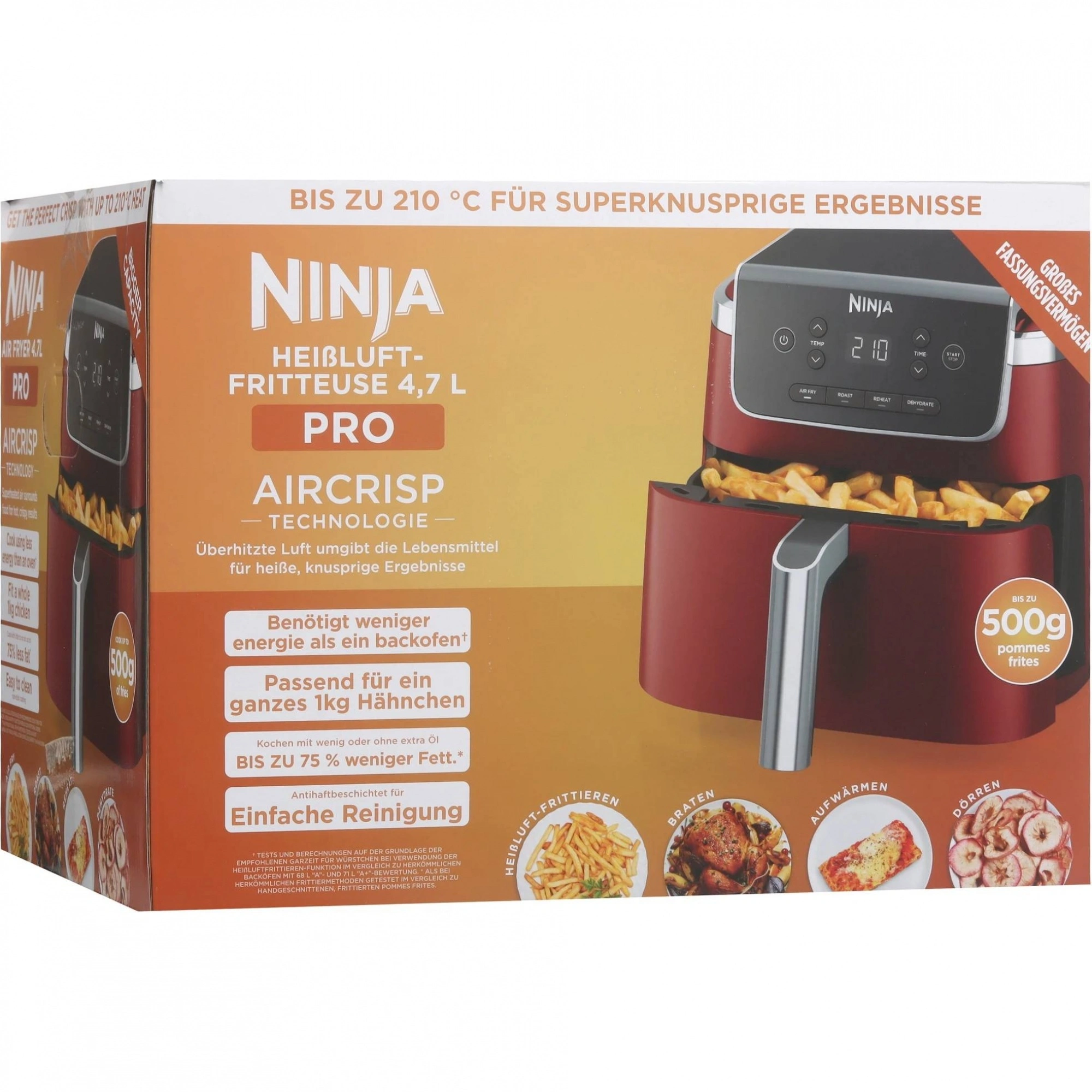 Аэрогриль Ninja – это высокопроизводительное устройство для приготовления разнообразных блюд с минимальными усилиями. Весом всего 4,8 кг, эта модель отличается компактностью и удобством в эксплуатации, идеально вписываясь в интерьер любой кухни. Благодаря мощности в 1750 Вт и нагревательному элементу типа ТЭН, прибор обеспечивает быстрое и равномерное приготовление пищи.