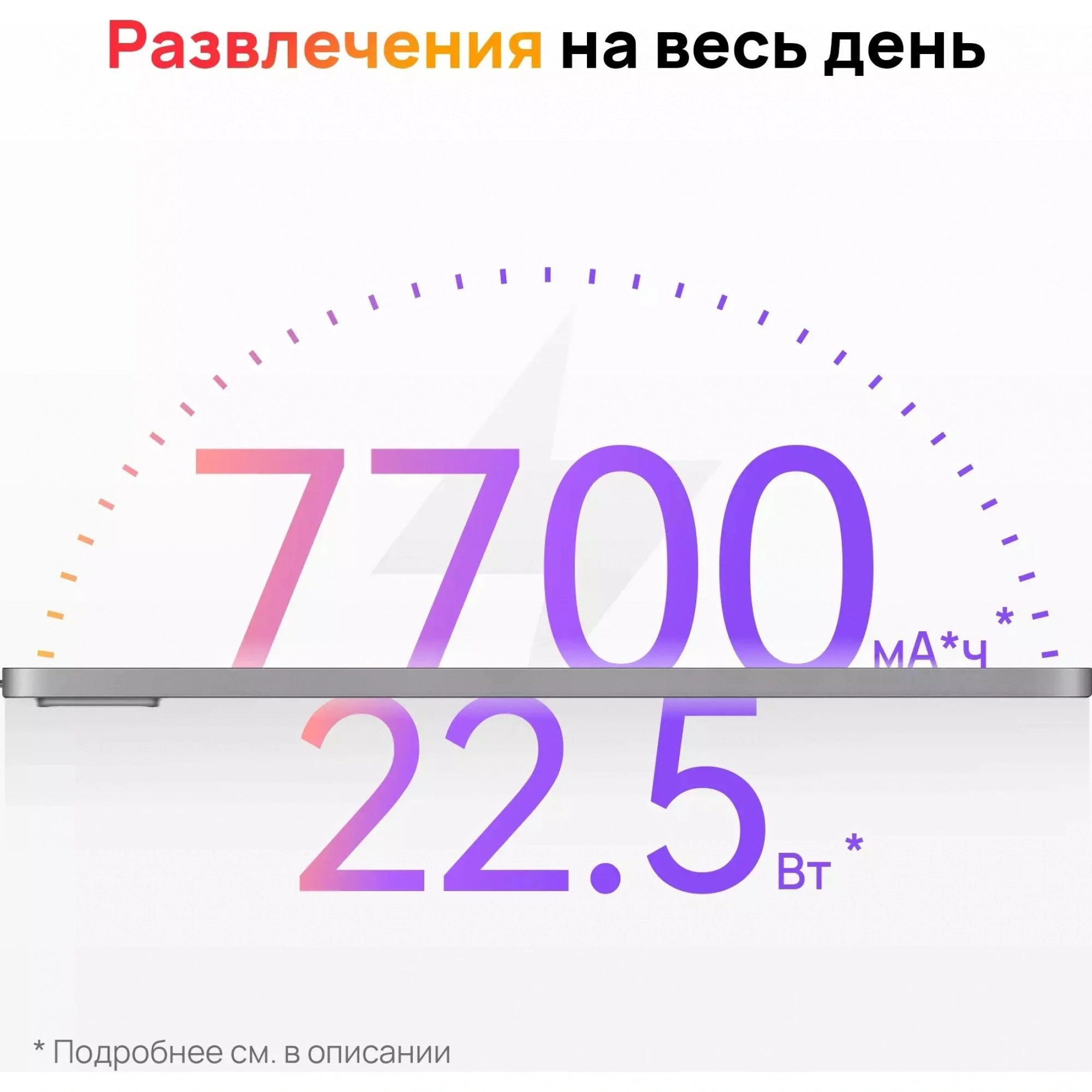 * Ёмкость аккумулятора — 7700 мАч, что гарантирует длительное время работы без подзарядки.