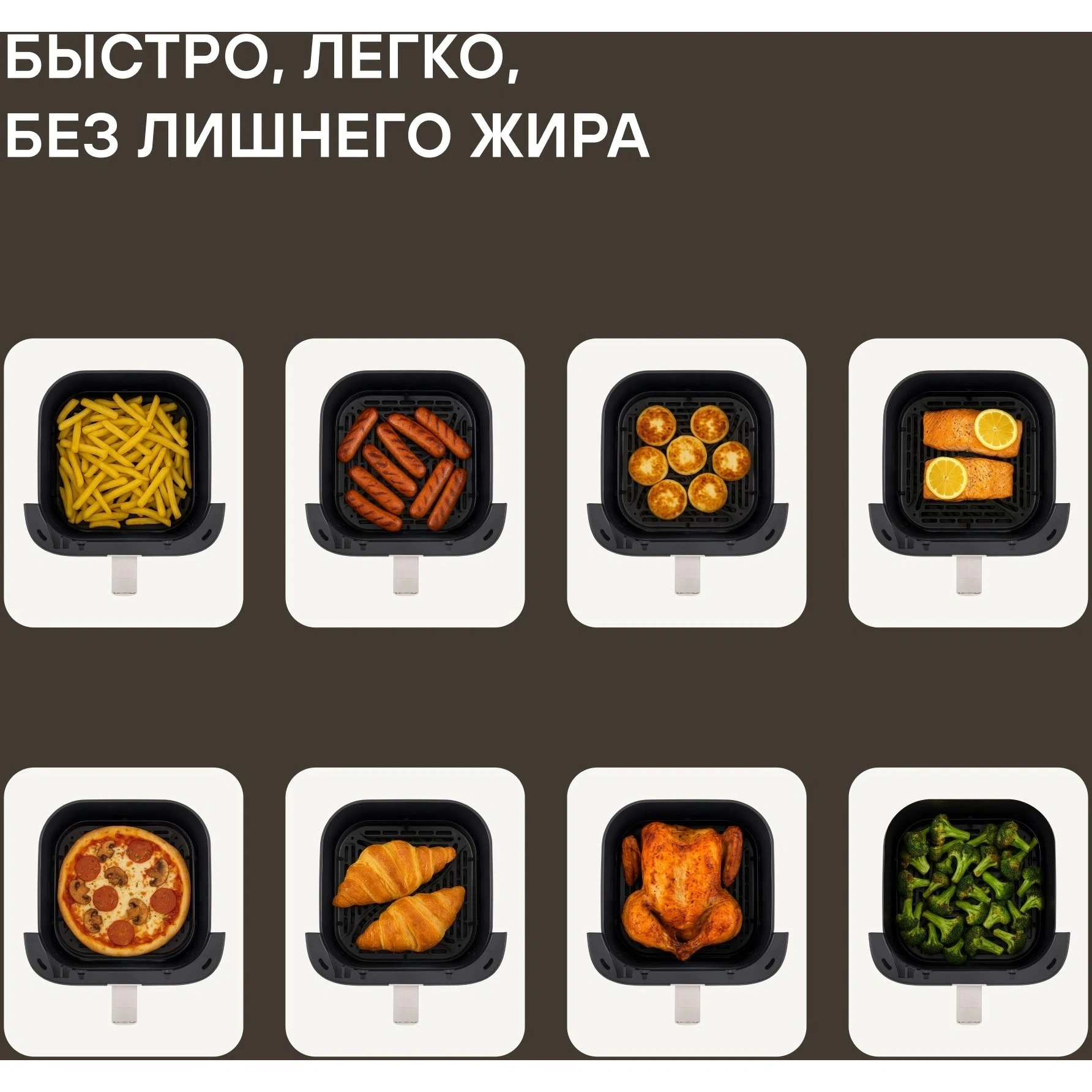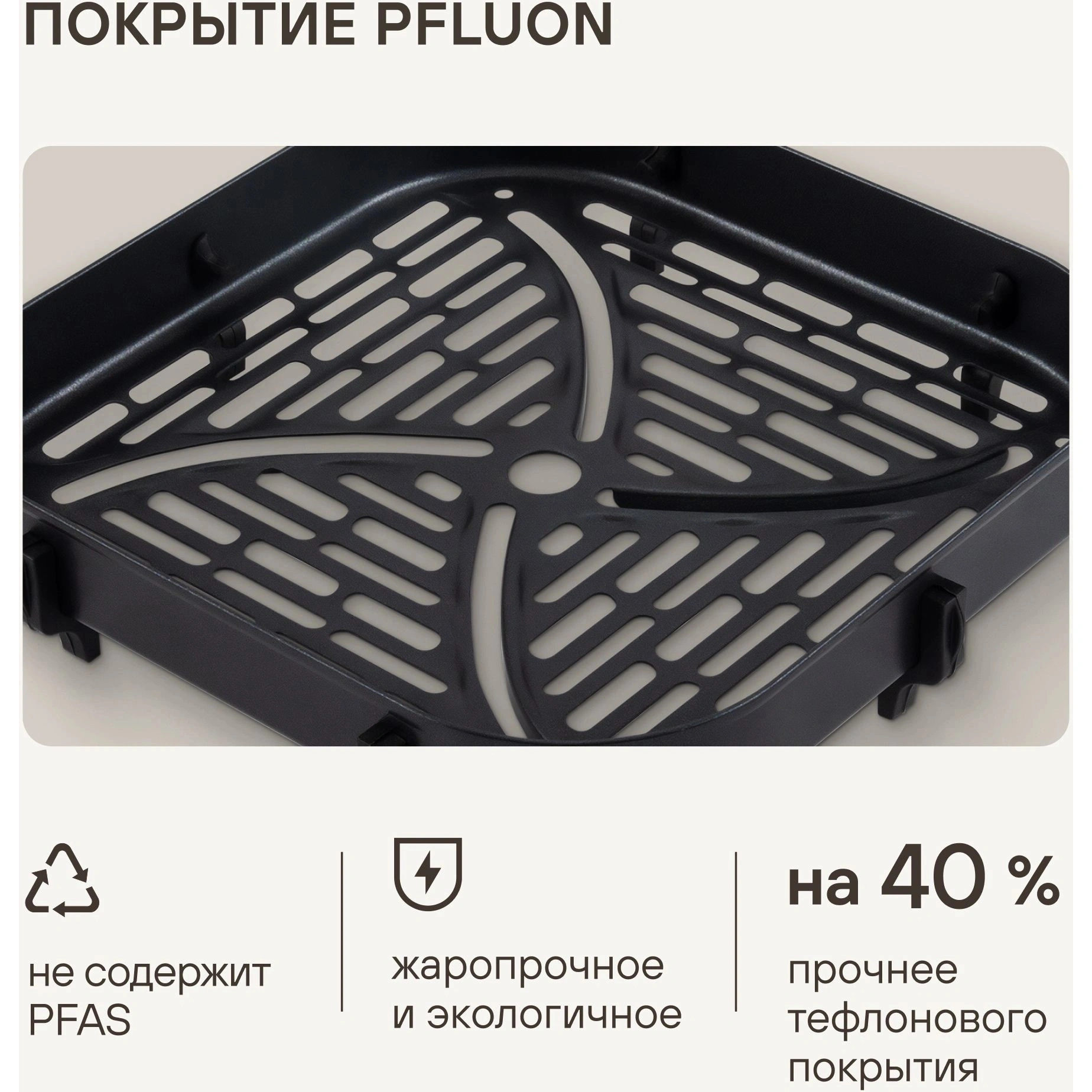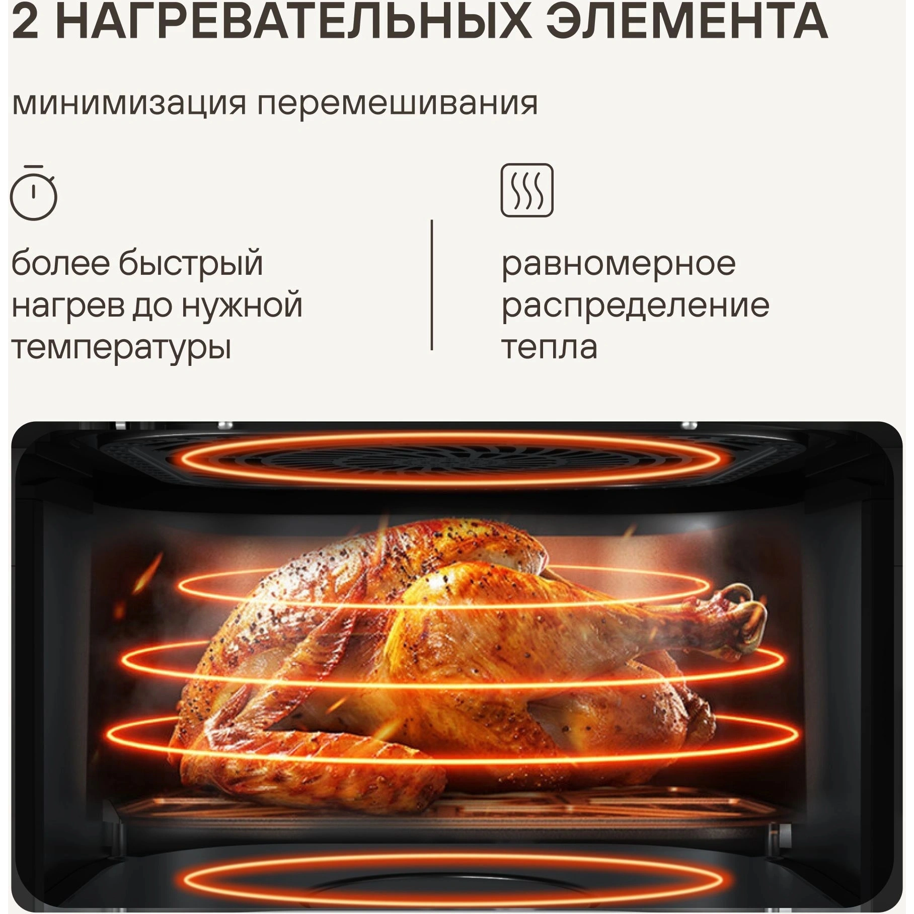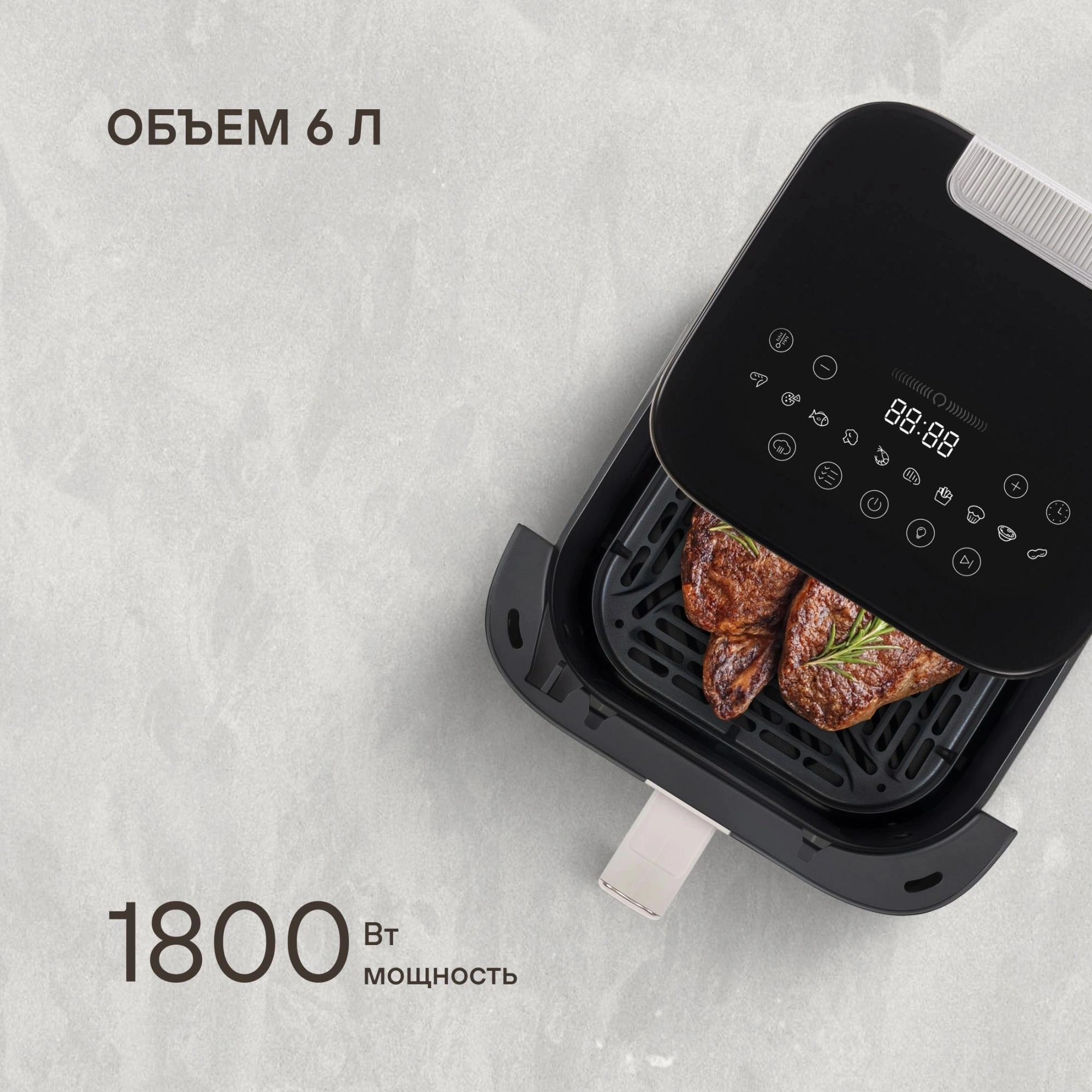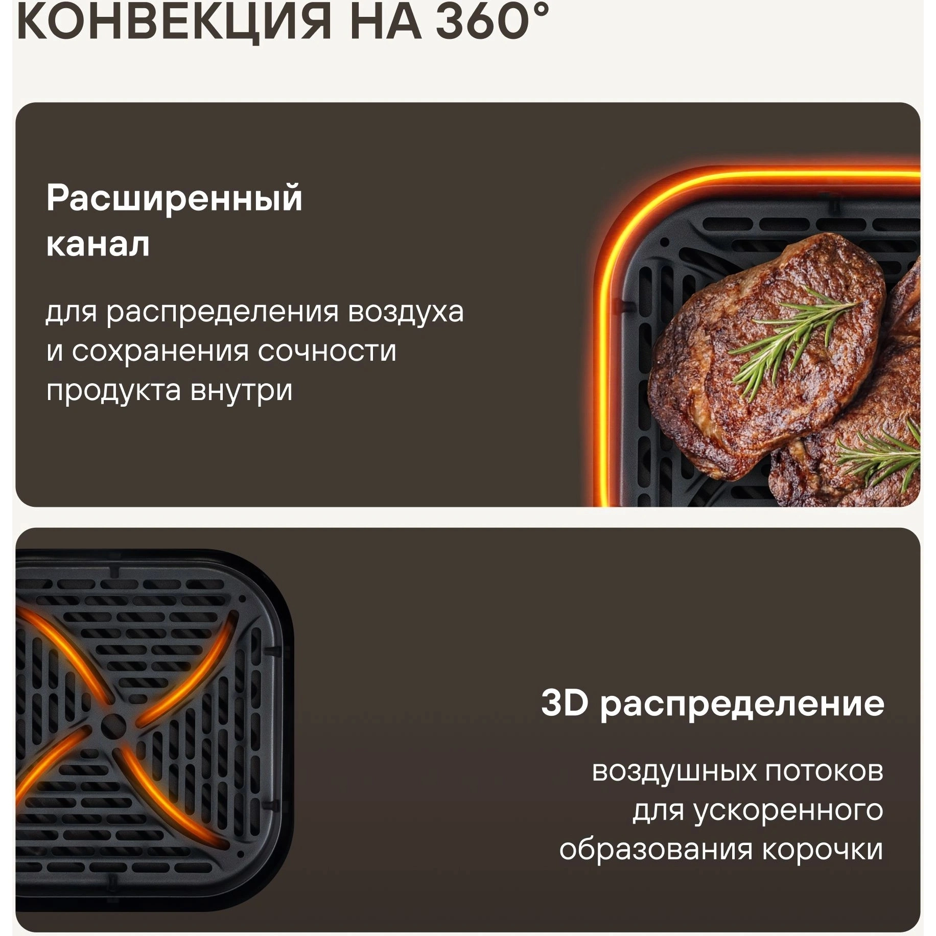 Устройство оборудовано верхним и нижним нагревательным элементом типа ТЭН, а благодаря металлической камере и расширенному боковому каналу диффузии воздуха достигается равномерное пропекание. Расширенная горизонтальная диффузия потока горячего воздуха обеспечивает стабильный результат готовки, а особая решетка с основанием по типу «гриль» позволяет зажаривать мясо так, как будто это приготовлено на настоящем гриле. Продукты для аэрогриля всегда остаются сочными — для предотвращения пересушивания устройством предусмотрена функция готовки с паром, которая помогает сохранять идеальную текстуру даже у уязвимых к пересушке блюд.