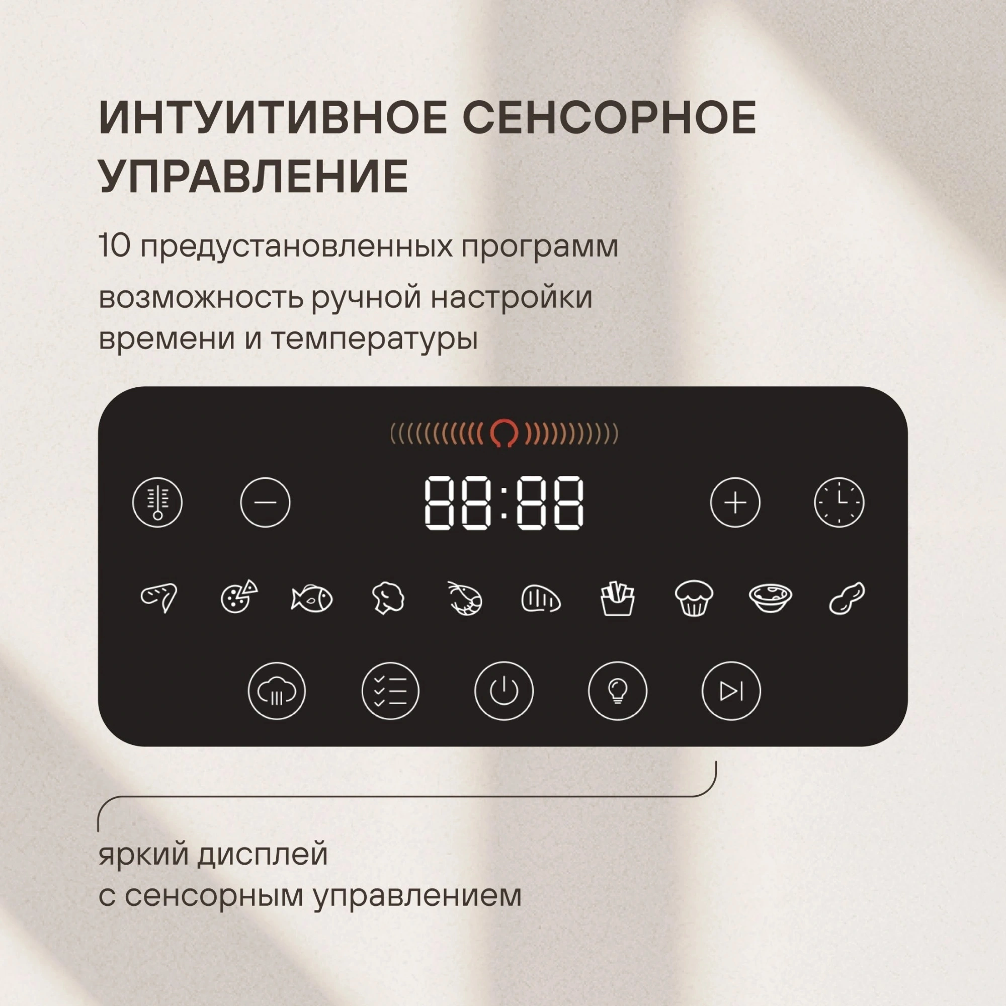 Окошко и внутренняя подсветка дают возможность визуально контролировать ход приготовления без открытия корпуса, а настройка температуры приготовления (от 50 до 230 °С) и времени доступны в сенсорной панели управления. Выбирайте подходящий из 11 программ в зависимости от рецепта: жарка, запекание, выпечка, приготовление овощей, рыбы, курицы — этот товар отлично справляется с любыми задачами на кухне. Защита от включения при открытой крышке гарантирует безопасность эксплуатации даже в семьях с детьми.