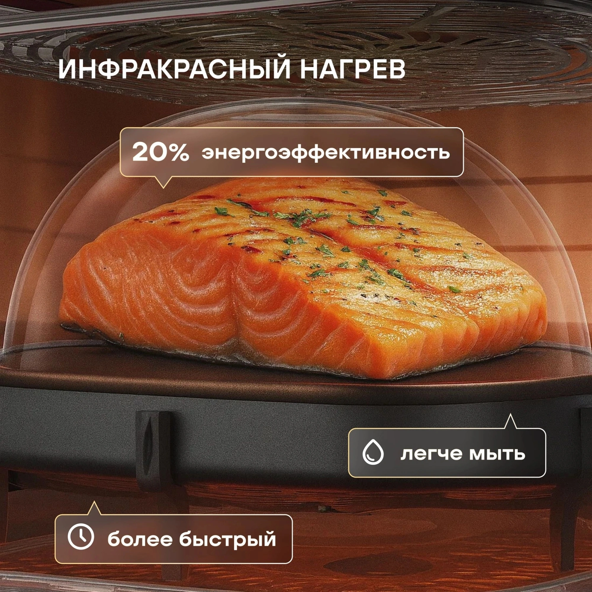 Готовка с паром для увлажнения продуктов подверженных пересушке. Расширенный боковой канал диффузии воздуха обеспечивает расширенную горизонтальную диффузию потока горячего воздуха.