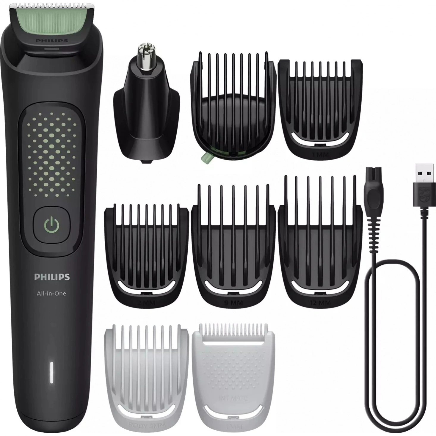 триммер, насадки, USB-кабель, чехол, щеточка для чистки, документация, упаковка