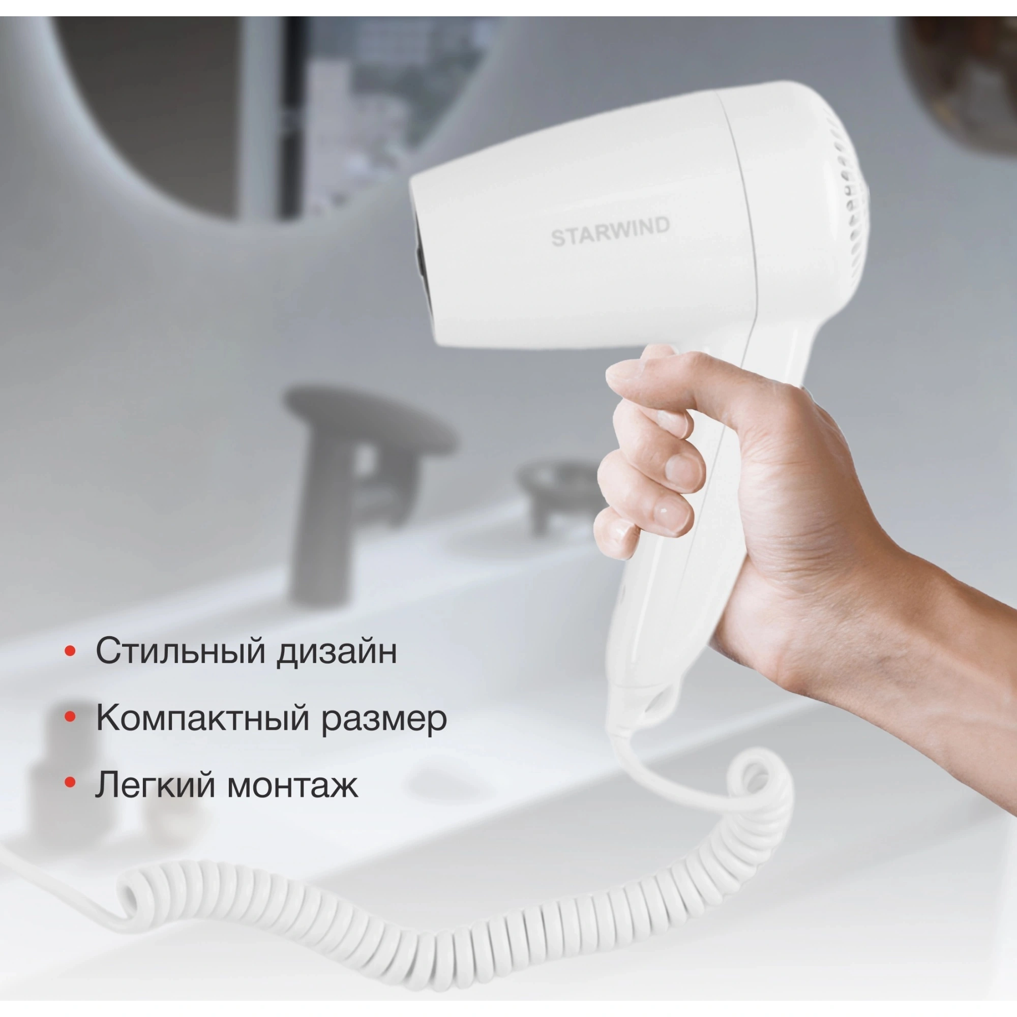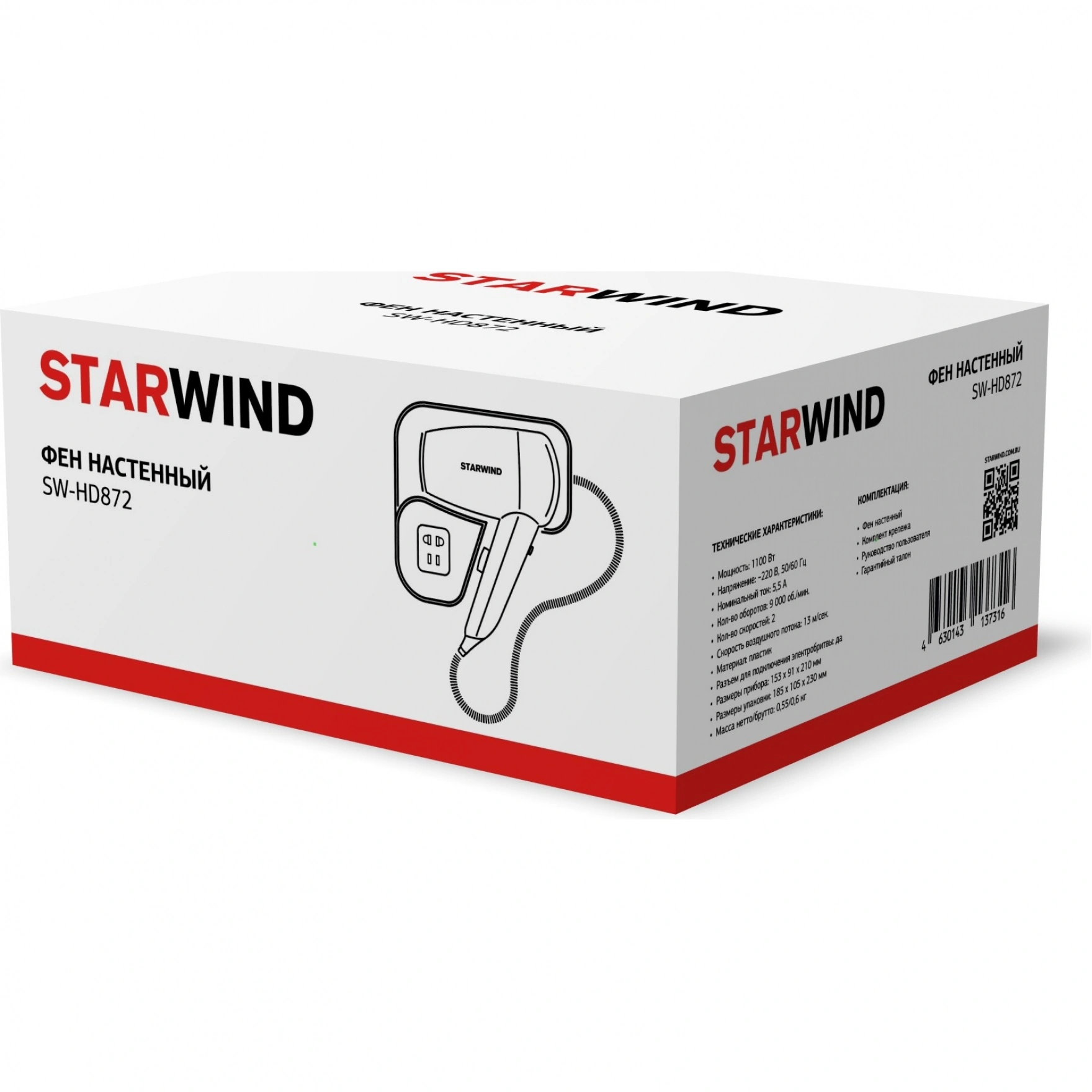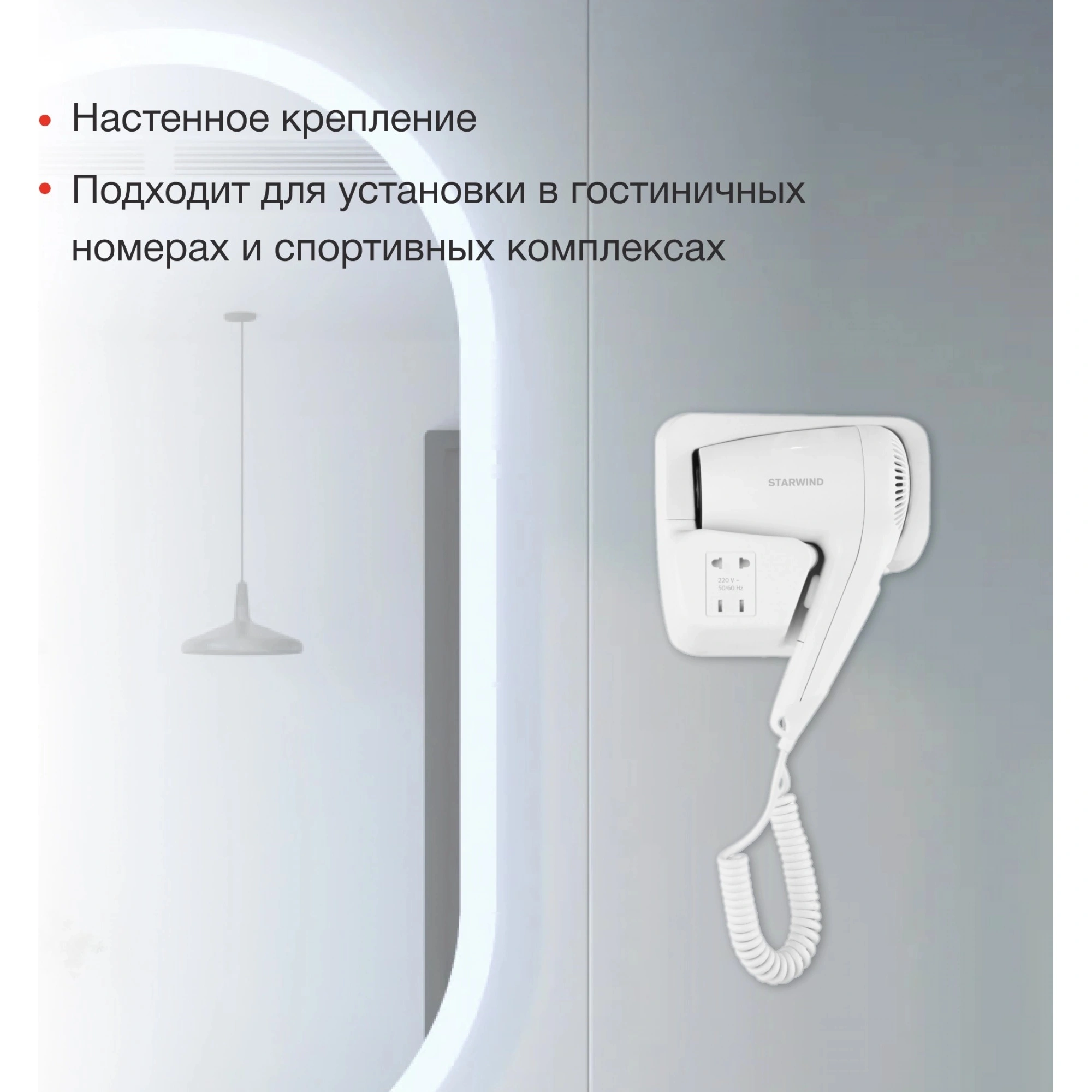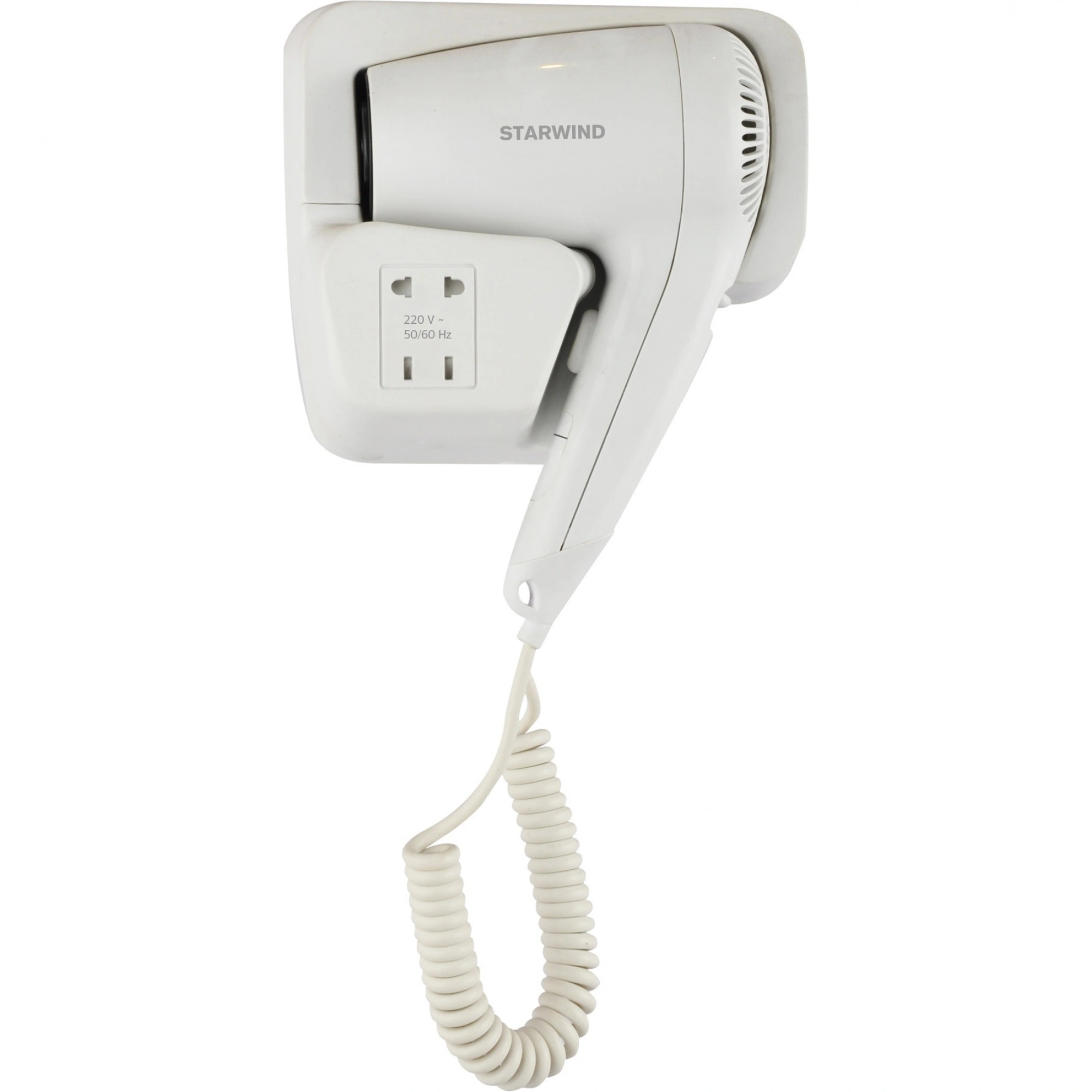 Starwind SW-HD872 — это компактный и эргономичный настенный фен, который обеспечивает эффективное выполнение своих функций. Устройство надежно крепится к стене с помощью специального крепежа, входящего в комплект. Фен оснащен розеткой, которая позволяет подключать электробритву.